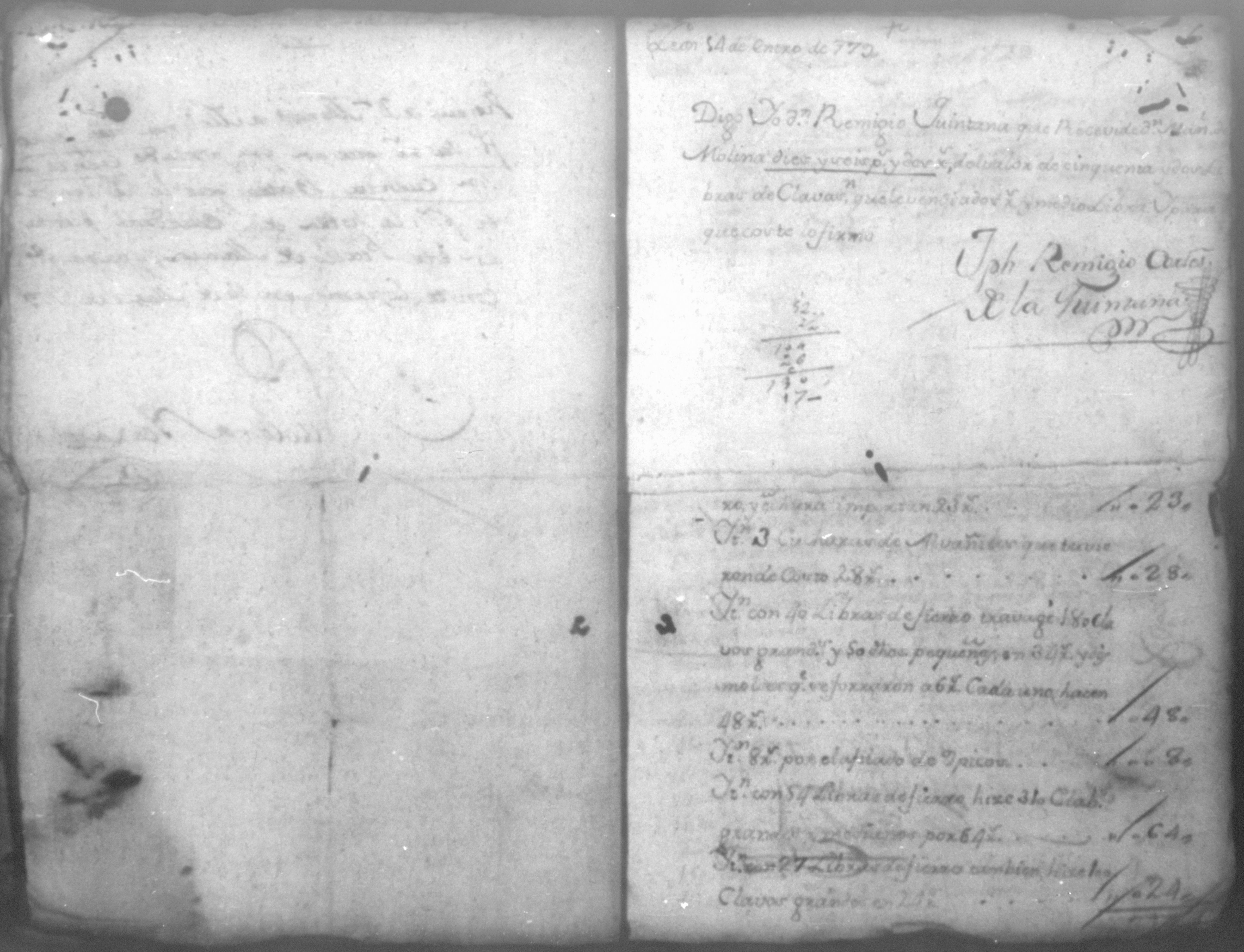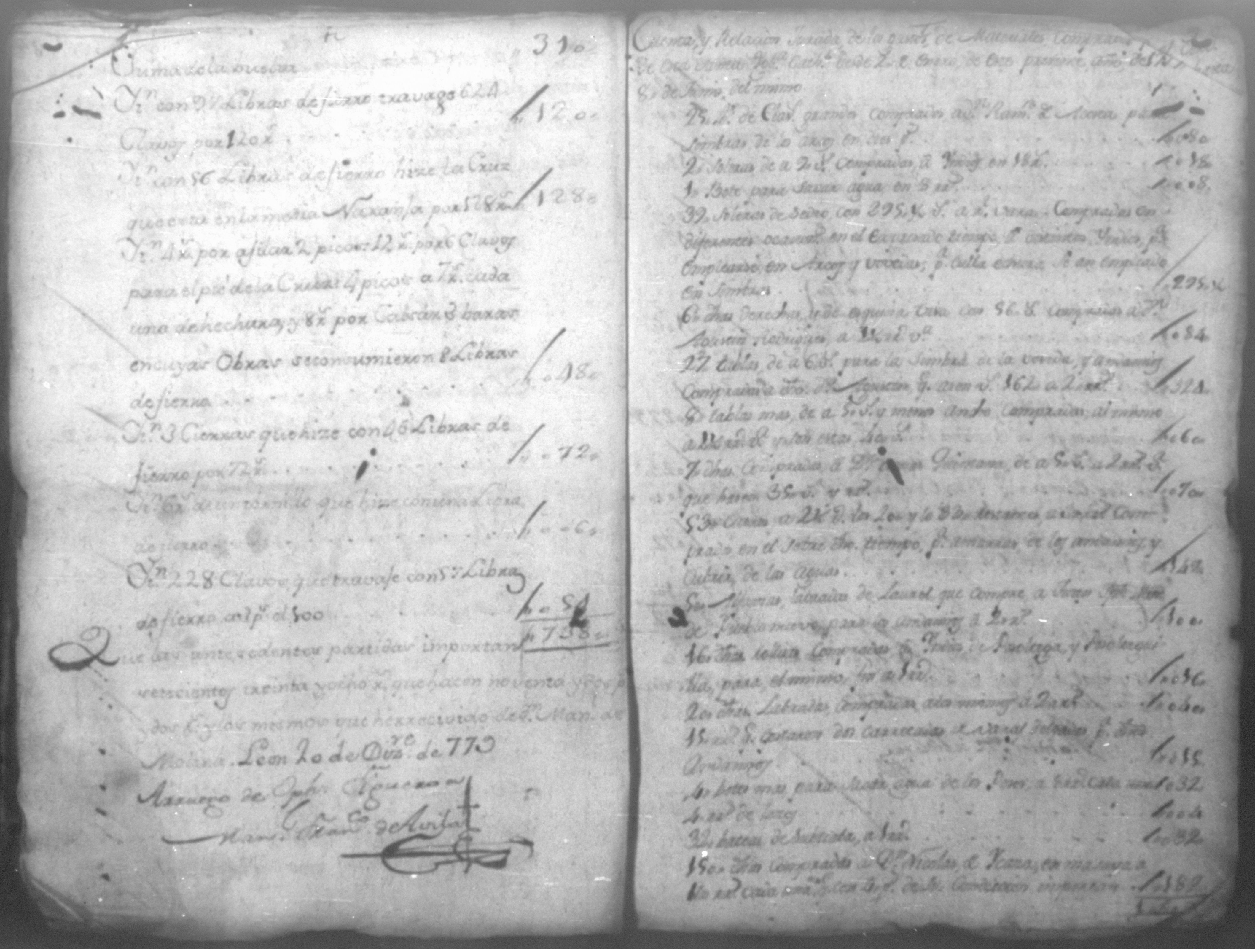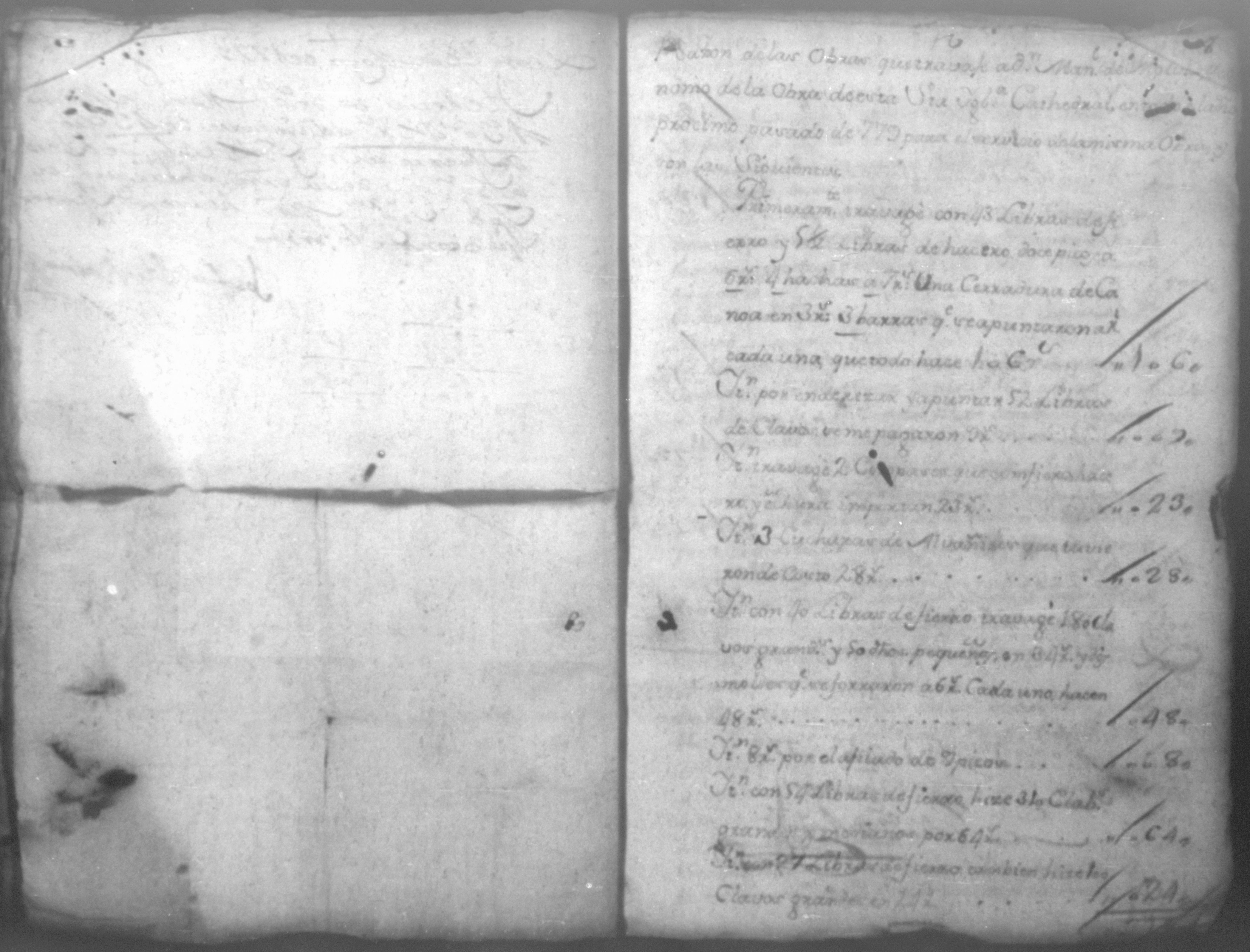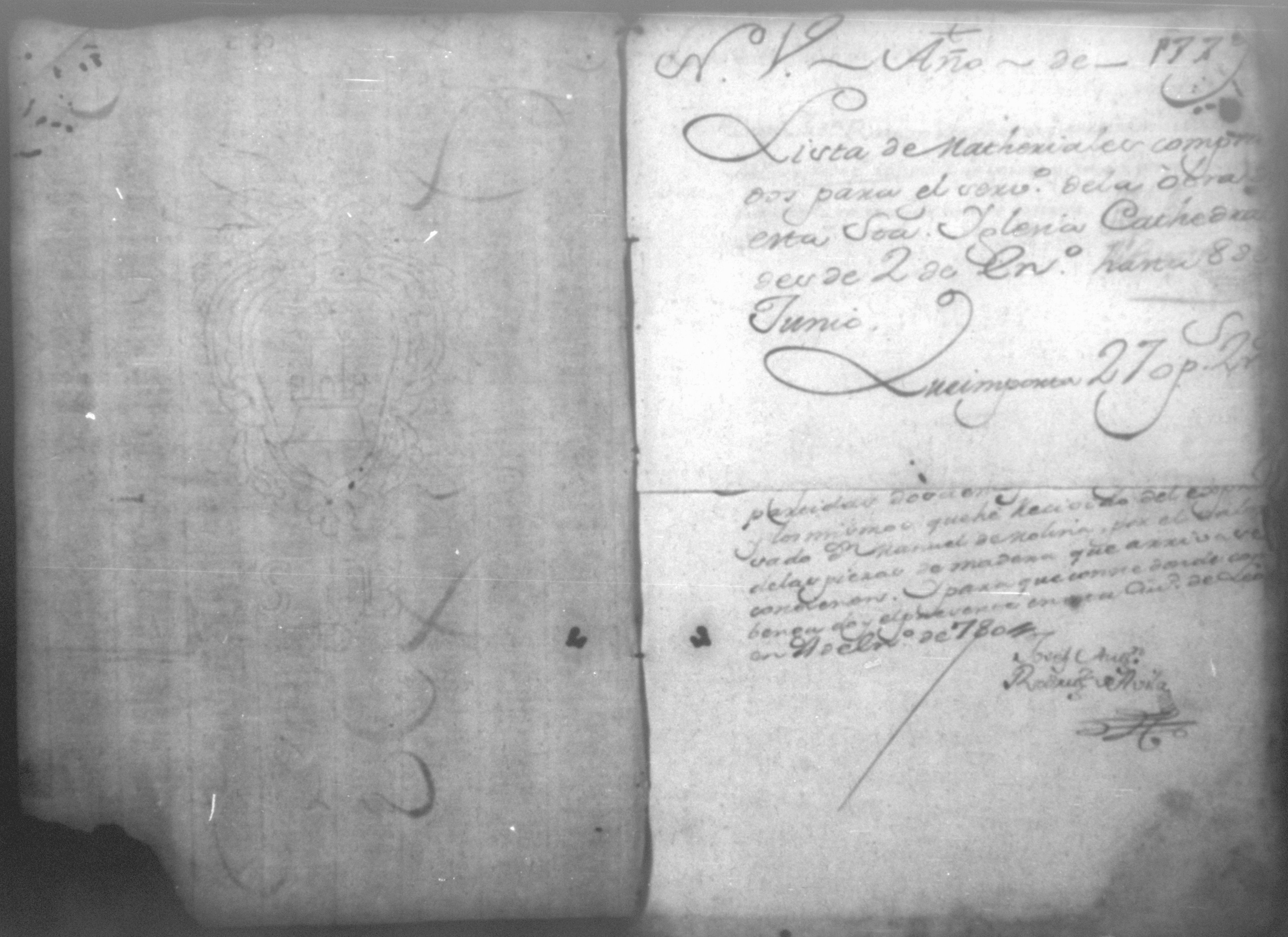 Temática: Año de 1779. Cuaderno que comprende veinte recibos con una relación de jornaleros que se ocuparon en el corte de madera y cuatro listas constantes de los materiales que se solicitaron y compraron para la obra de esta Santa Iglesia Cathedral.