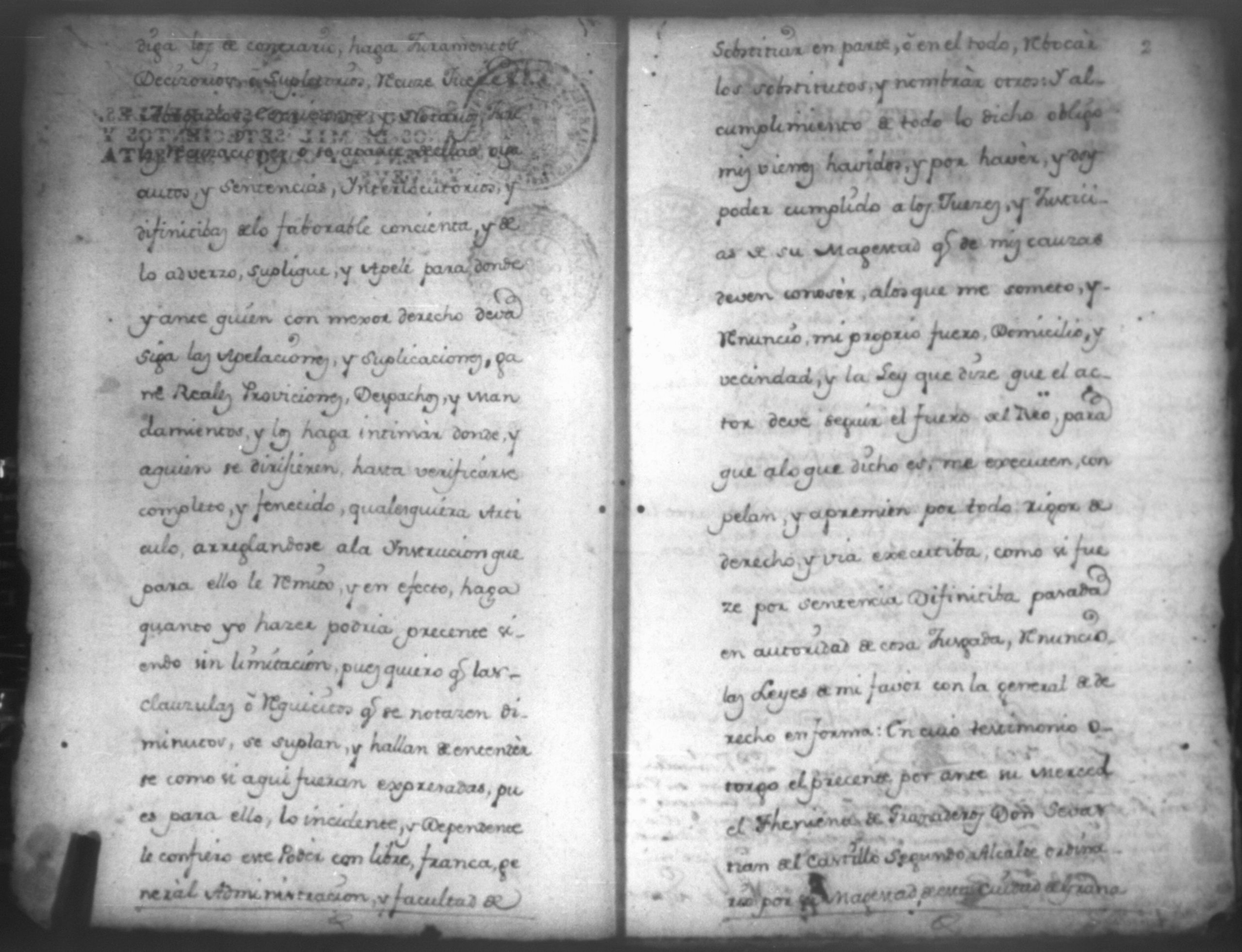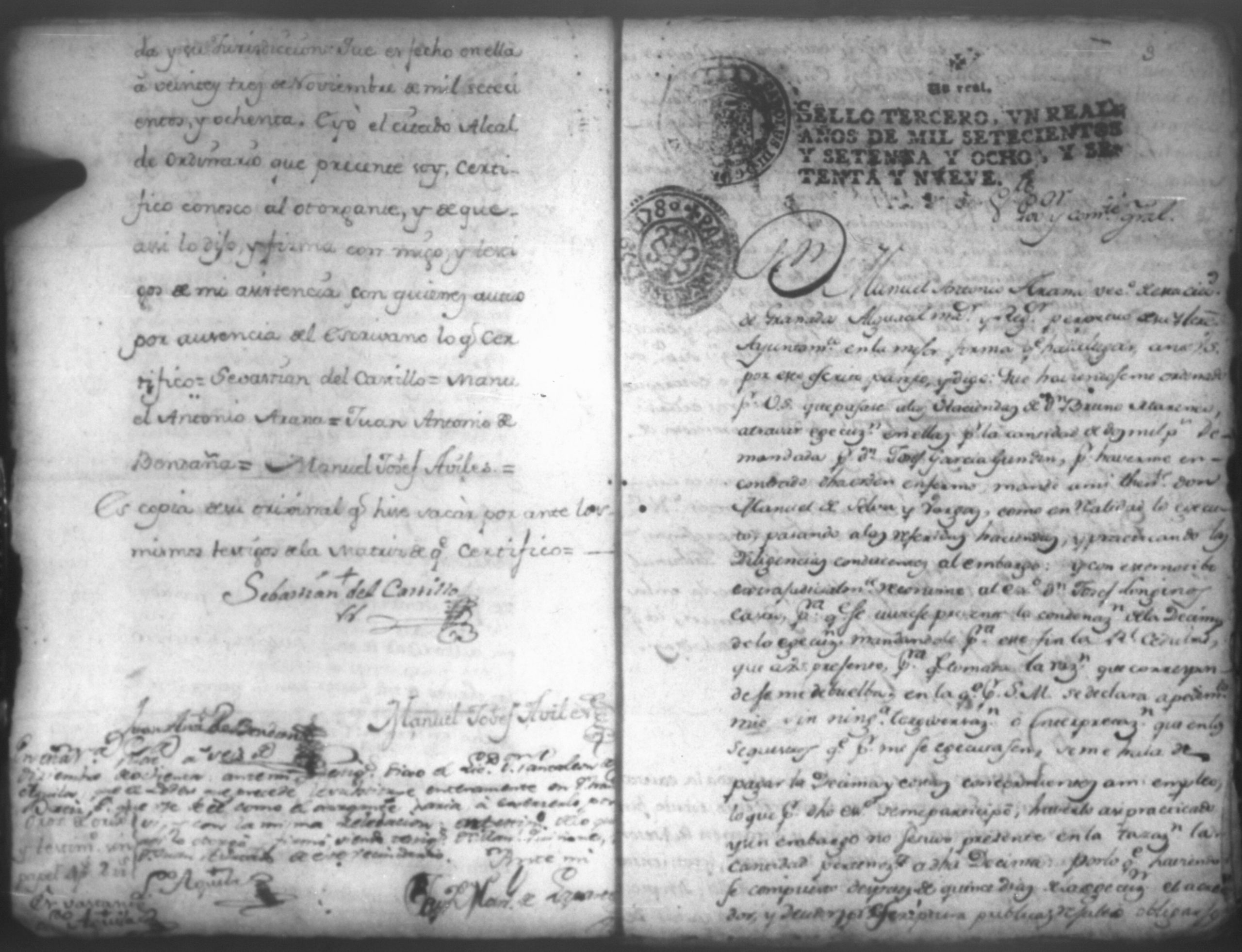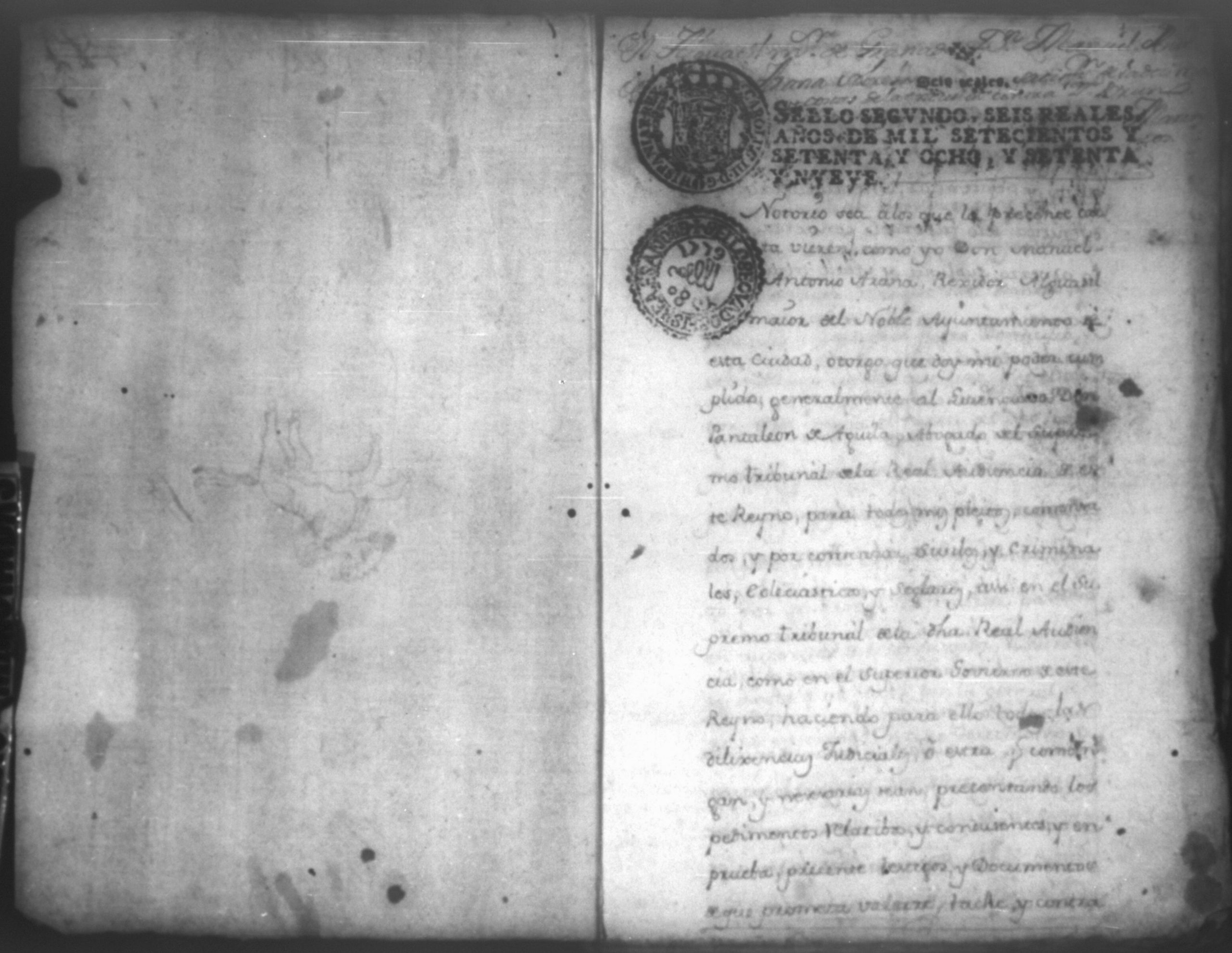 Temática: Notorio sea a los que la presente causa vieren como yo Don Manuel Antonio Arana Rexidor Alguacil maior del Noble Ayuntamiento de esta ciudad, otorgo que doy mi poder cumplido generalmente al Licenciado Don Pantaleon de Aguila, Abogado del Supremo Tribunal de la Real Audiencia de este Reyno para todos mis pleitos, criminales, eclesiasticos y seglares, así en el Supremo Tribunal de la dicha Real Audiciencia como en el Supremo Gobierno de este Reyno haciendo para ellos todas las diligencias Judiciales...