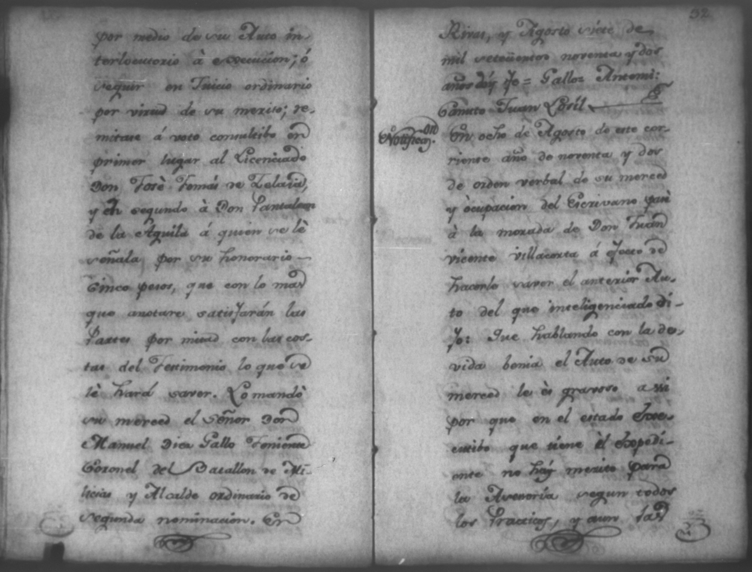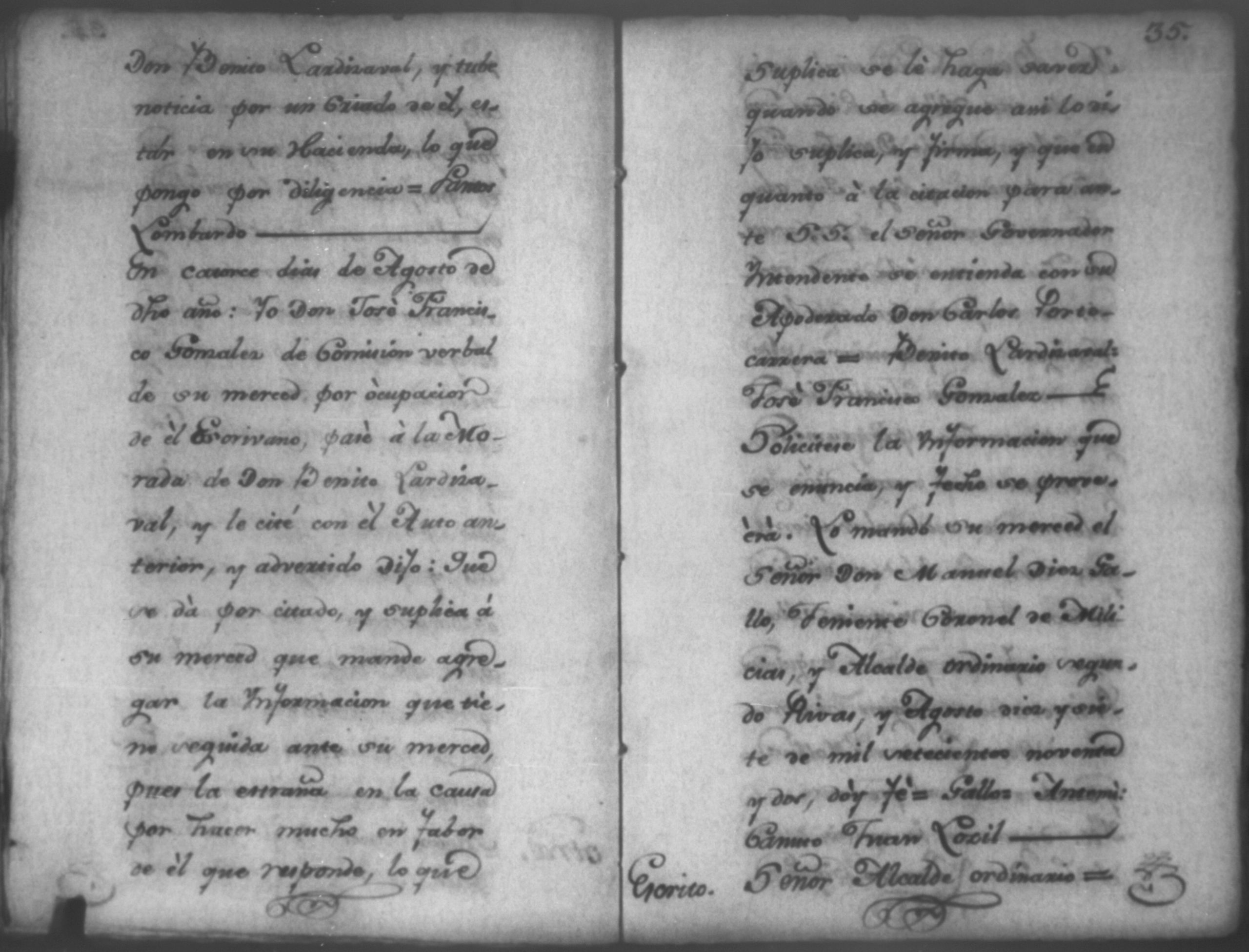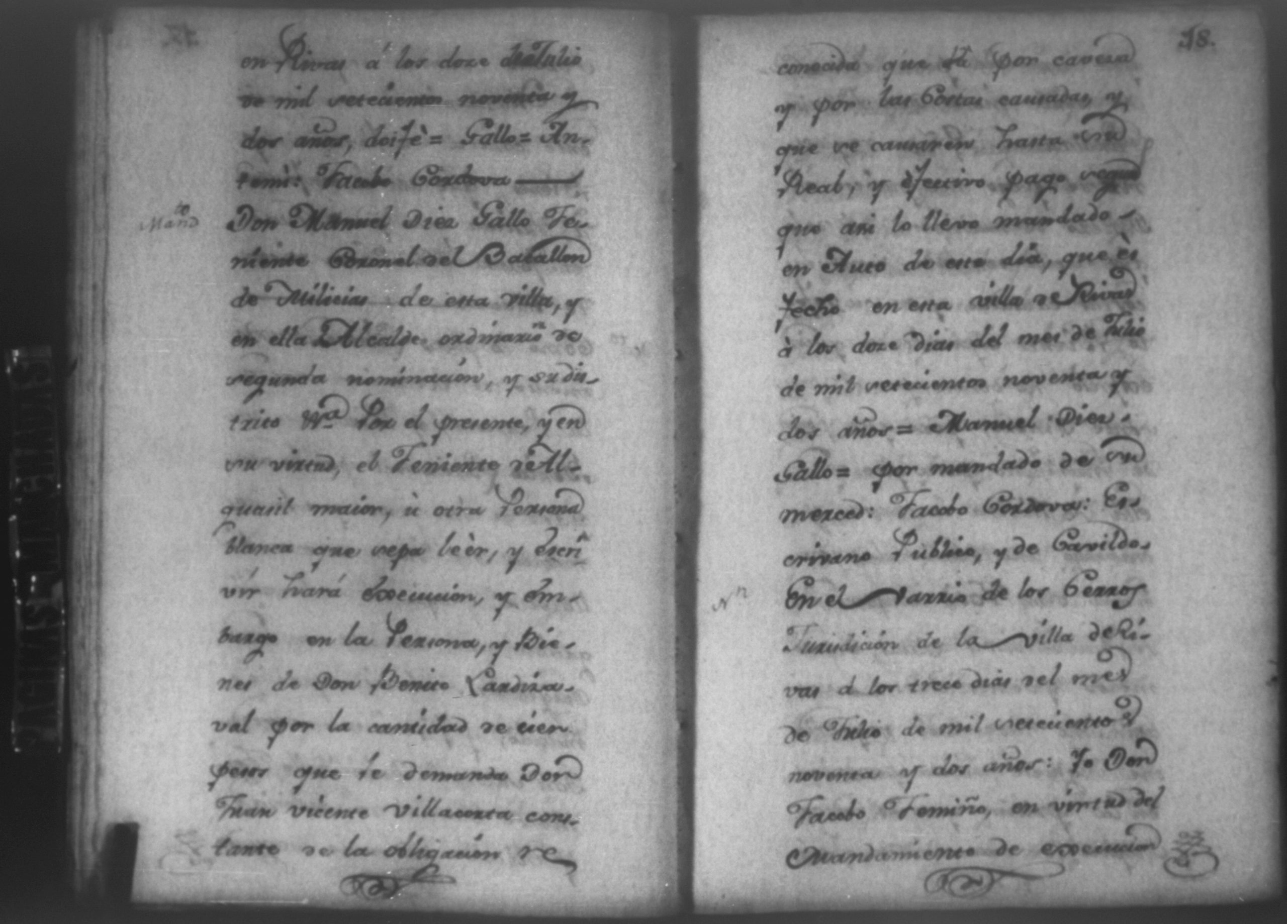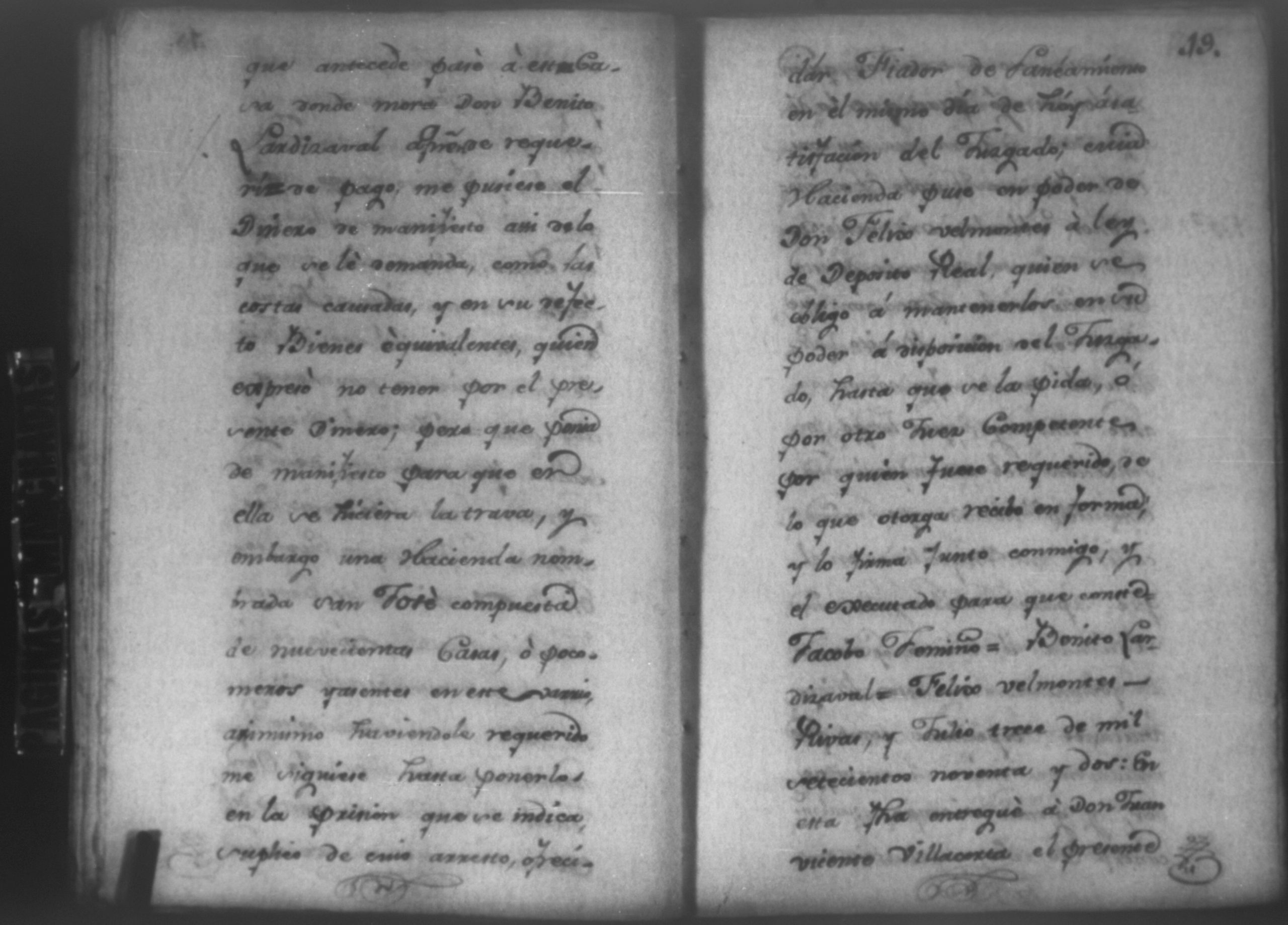 Temática: Nicaragua, 1792. Sobre el incumplimiento de pago por parte de Leandro Molina por la cantidad de 200 pesos, correspondientes al estanco de aguardiente. "Minas del Peñon, y Junio quince de mil setecientos ochenta y ocho. Digo yo Don Leandro Molina vecino de esta Jurisdicción de León y residente en dicho Mineral, que tengo celebrada contrata con Don Julian Armas de tomar el Estanco de Aguardiante de este dicho Mineral inclusive la poblacion del Sauce, en la cantidad de Doscientos pesos, á los mismos que me obligo, y deben correr de mi cuenta de la fecha en adelante dichos Estancos y la exivicion de la dicha cantidad la hede hacer a Don Agustin Rodriguez Lobato Asentista de dicho ramo, y con facultad de este sugeto á celebrado dicha Don Julian esta contrata y debe entenderse que los dichos Doscientos pesos se los he de dár por cada un año y para el seguro de esta contrata doy por mis fiadores a Don Antonio Arce y Don Benito Lardisayal y juntos los tres nos obligamos en toda forma de derecho y renunciamos todas las Leies, Fueros, y Derechos que hagan á nuestro fabor y queremos nos valgan ahora, y en tiempo alguno y nos constituimos por deudores y principales pagadores de la dicha cantidad [...]". (Extracto de los folios 1 y 1v.).