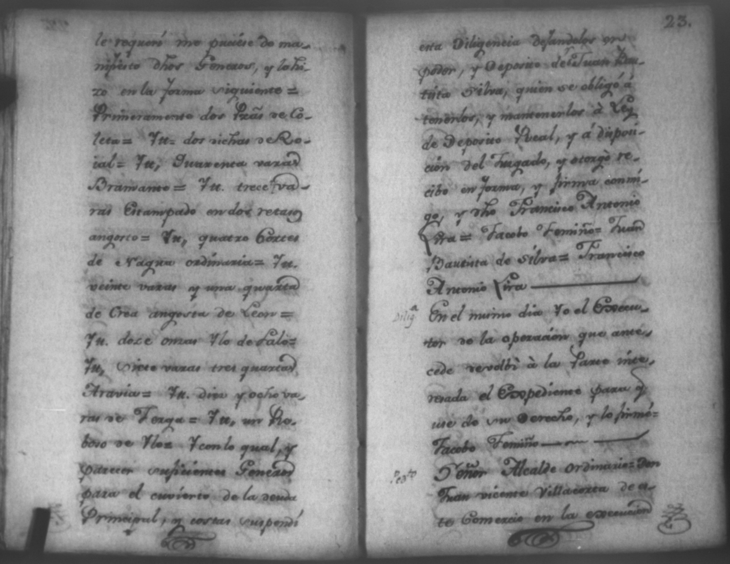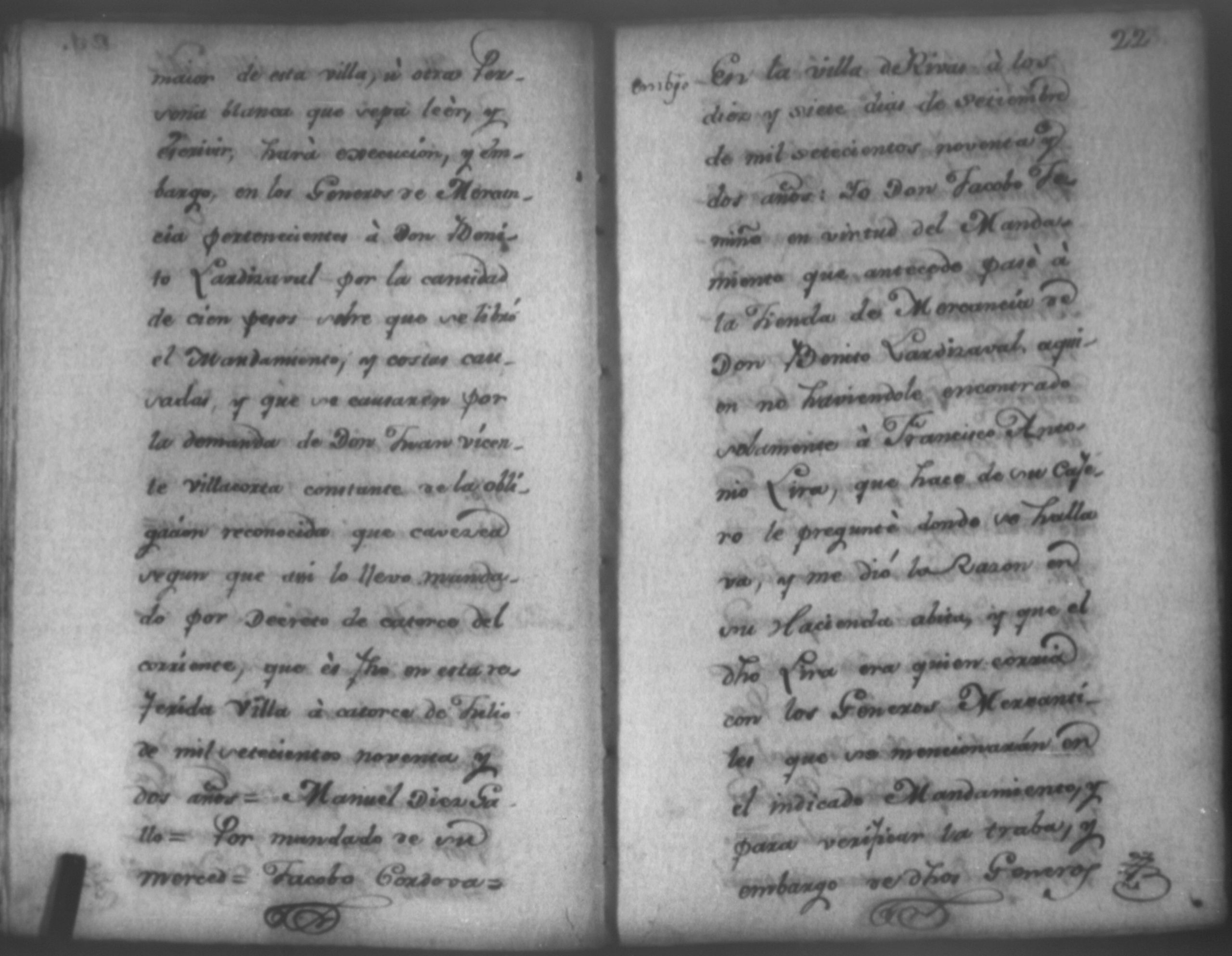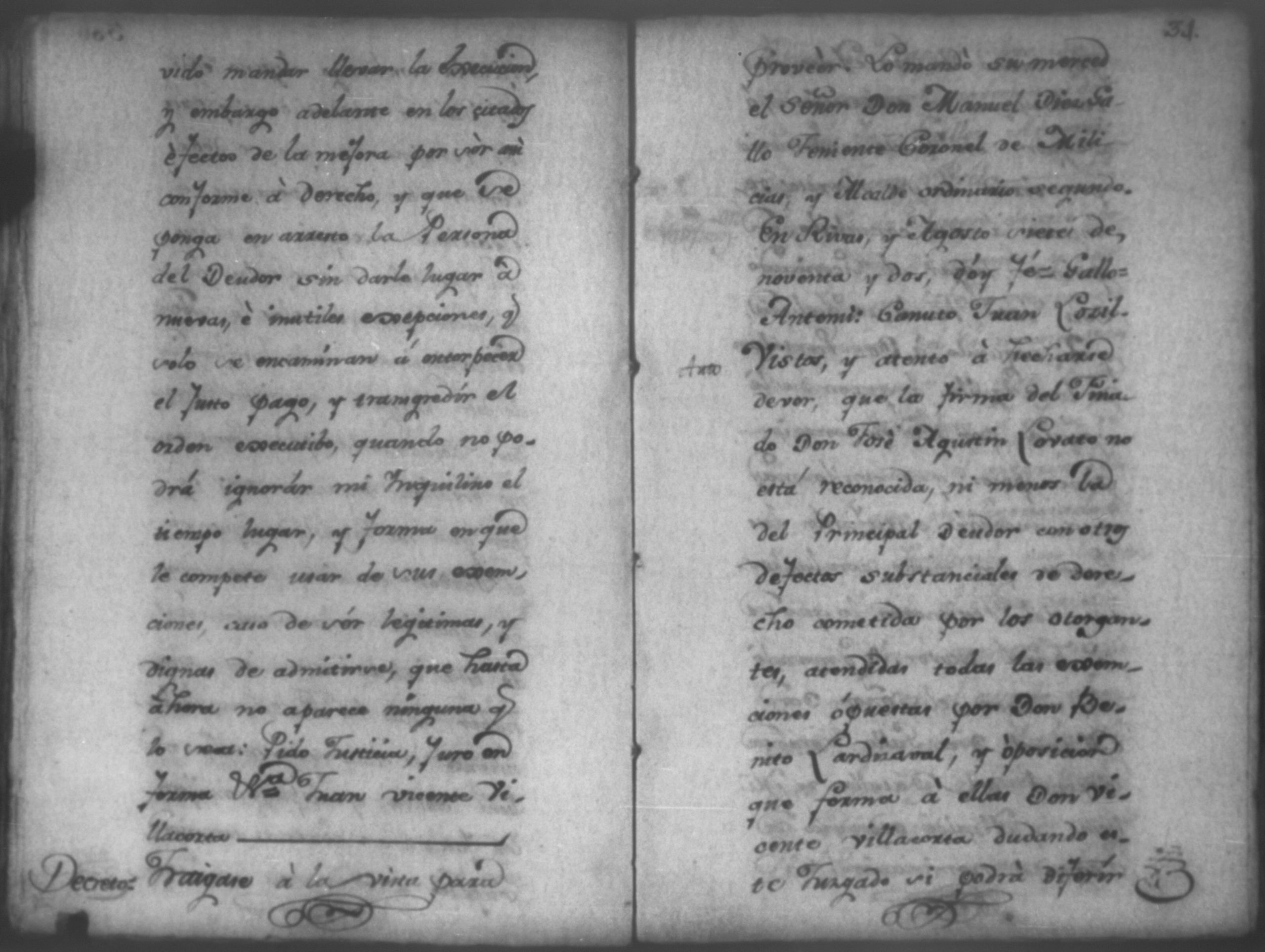 Temática: Nicaragua, 1792. Sobre el incumplimiento de pago por parte de Leandro Molina por la cantidad de 200 pesos, correspondientes al estanco de aguardiente. "Minas del Peñon, y Junio quince de mil setecientos ochenta y ocho. Digo yo Don Leandro Molina vecino de esta Jurisdicción de León y residente en dicho Mineral, que tengo celebrada contrata con Don Julian Armas de tomar el Estanco de Aguardiante de este dicho Mineral inclusive la poblacion del Sauce, en la cantidad de Doscientos pesos, á los mismos que me obligo, y deben correr de mi cuenta de la fecha en adelante dichos Estancos y la exivicion de la dicha cantidad la hede hacer a Don Agustin Rodriguez Lobato Asentista de dicho ramo, y con facultad de este sugeto á celebrado dicha Don Julian esta contrata y debe entenderse que los dichos Doscientos pesos se los he de dár por cada un año y para el seguro de esta contrata doy por mis fiadores a Don Antonio Arce y Don Benito Lardisayal y juntos los tres nos obligamos en toda forma de derecho y renunciamos todas las Leies, Fueros, y Derechos que hagan á nuestro fabor y queremos nos valgan ahora, y en tiempo alguno y nos constituimos por deudores y principales pagadores de la dicha cantidad [...]". (Extracto de los folios 1 y 1v.).