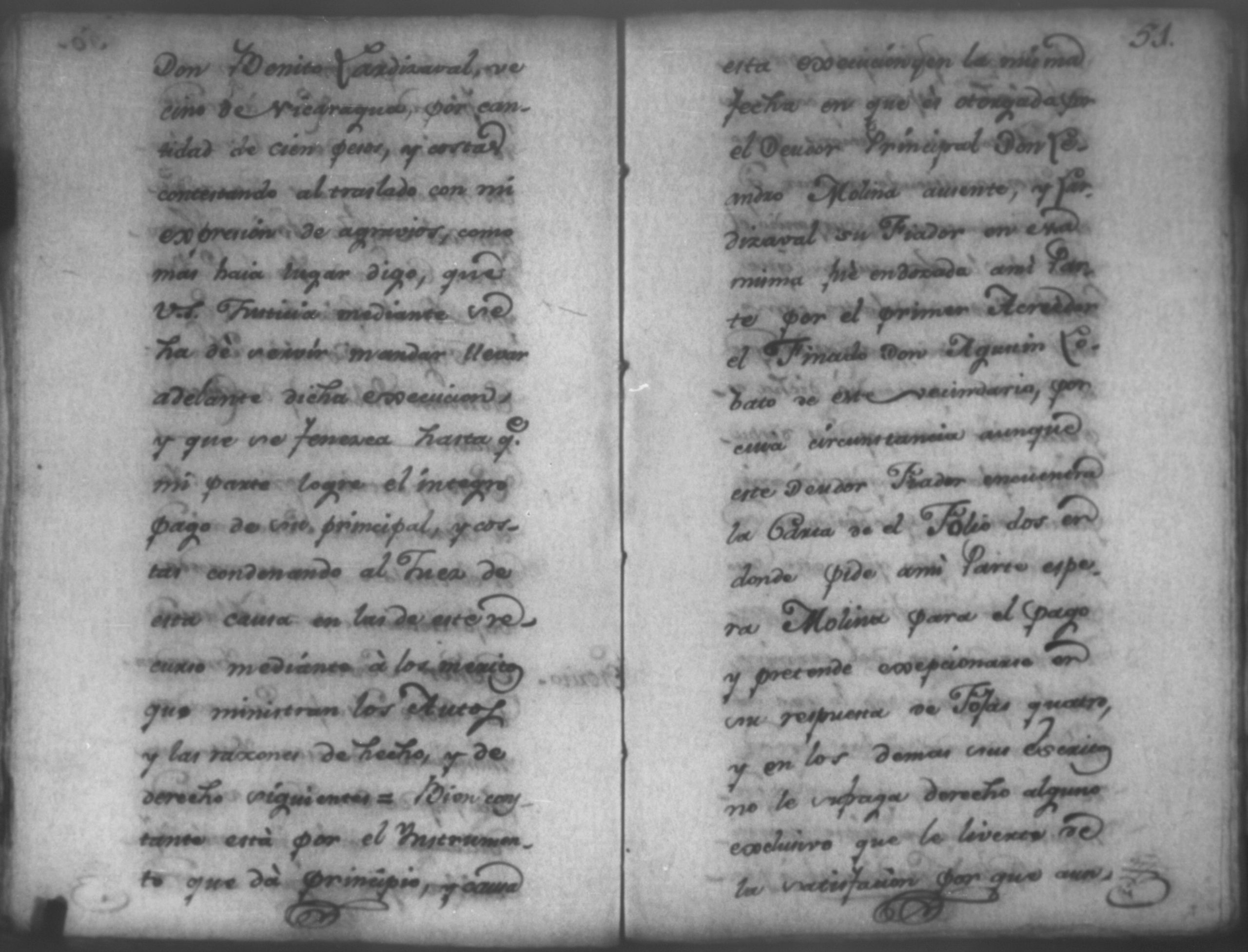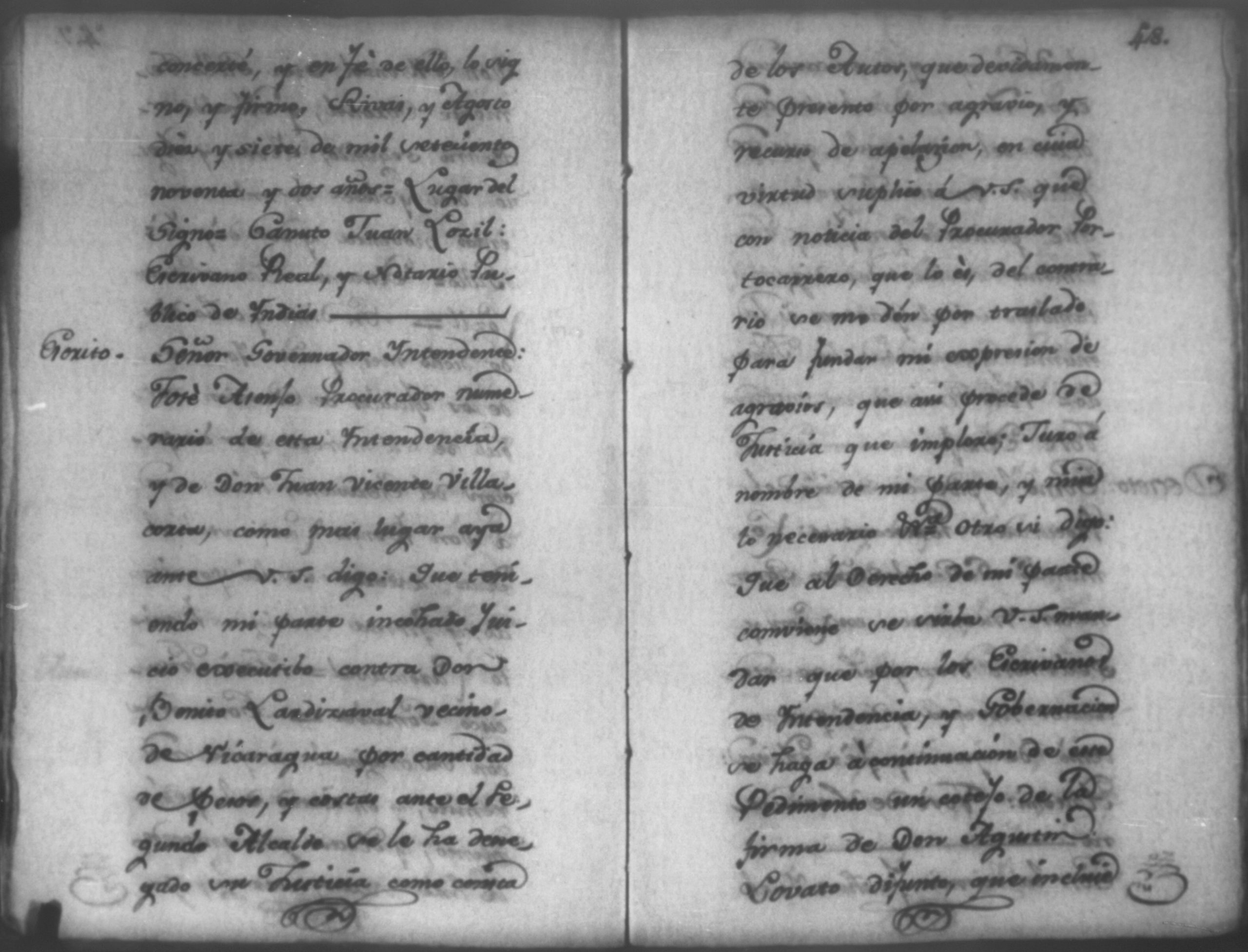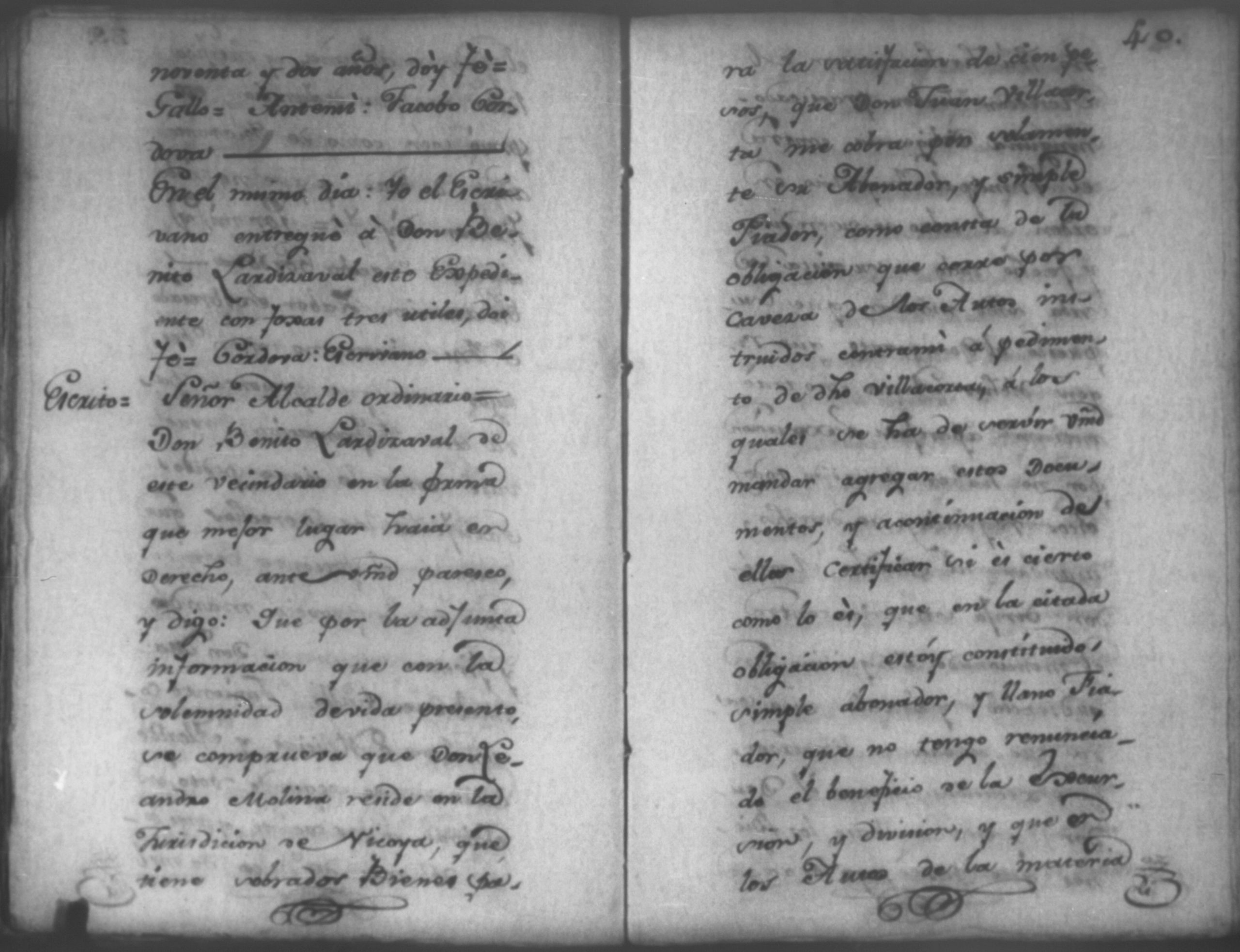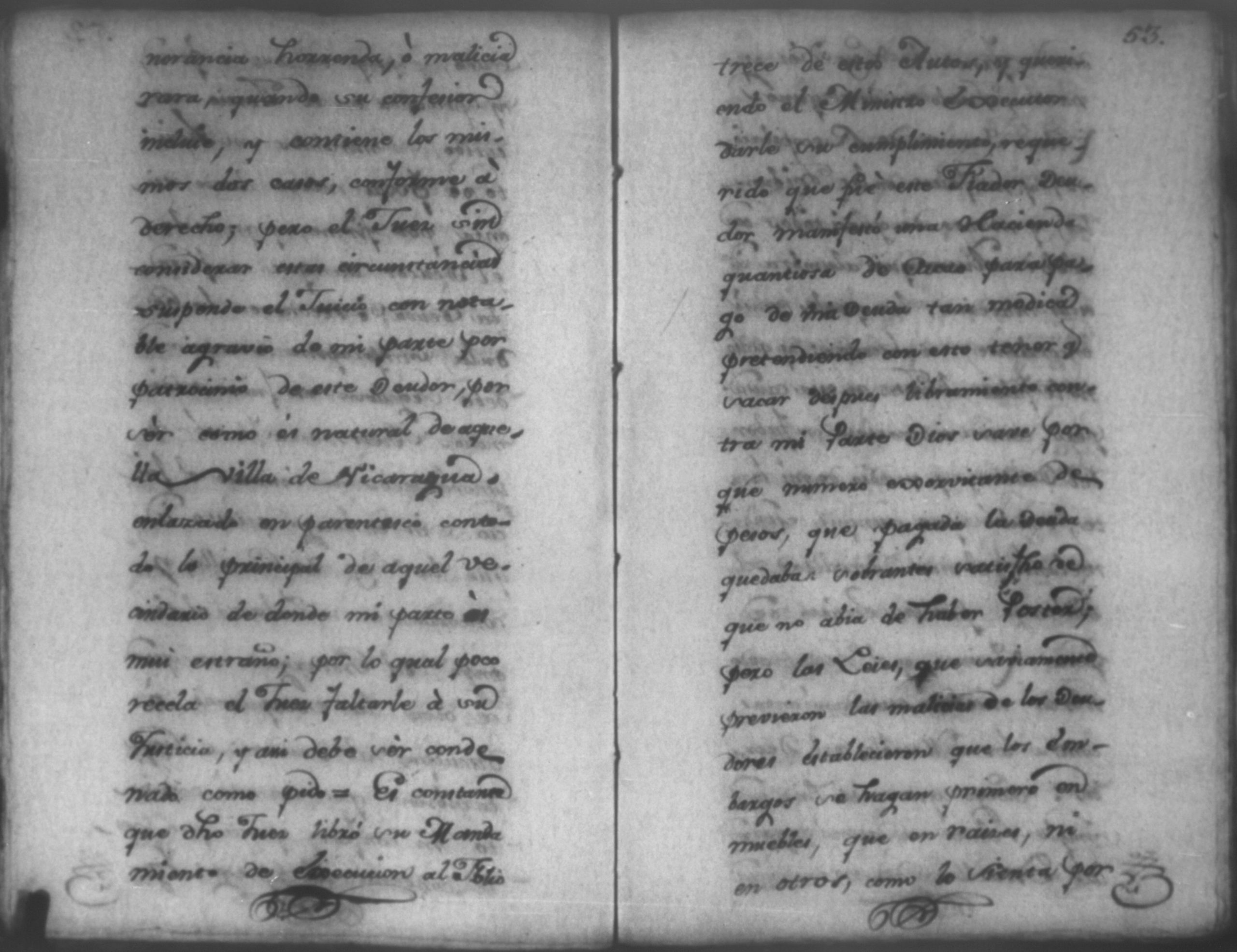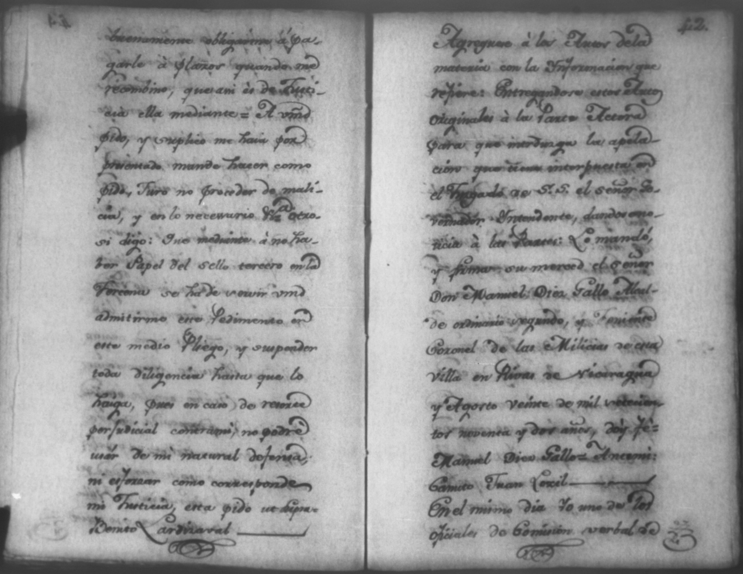 Temática: Nicaragua, 1792. Sobre el incumplimiento de pago por parte de Leandro Molina por la cantidad de 200 pesos, correspondientes al estanco de aguardiente. "Minas del Peñon, y Junio quince de mil setecientos ochenta y ocho. Digo yo Don Leandro Molina vecino de esta Jurisdicción de León y residente en dicho Mineral, que tengo celebrada contrata con Don Julian Armas de tomar el Estanco de Aguardiante de este dicho Mineral inclusive la poblacion del Sauce, en la cantidad de Doscientos pesos, á los mismos que me obligo, y deben correr de mi cuenta de la fecha en adelante dichos Estancos y la exivicion de la dicha cantidad la hede hacer a Don Agustin Rodriguez Lobato Asentista de dicho ramo, y con facultad de este sugeto á celebrado dicha Don Julian esta contrata y debe entenderse que los dichos Doscientos pesos se los he de dár por cada un año y para el seguro de esta contrata doy por mis fiadores a Don Antonio Arce y Don Benito Lardisayal y juntos los tres nos obligamos en toda forma de derecho y renunciamos todas las Leies, Fueros, y Derechos que hagan á nuestro fabor y queremos nos valgan ahora, y en tiempo alguno y nos constituimos por deudores y principales pagadores de la dicha cantidad [...]". (Extracto de los folios 1 y 1v.).