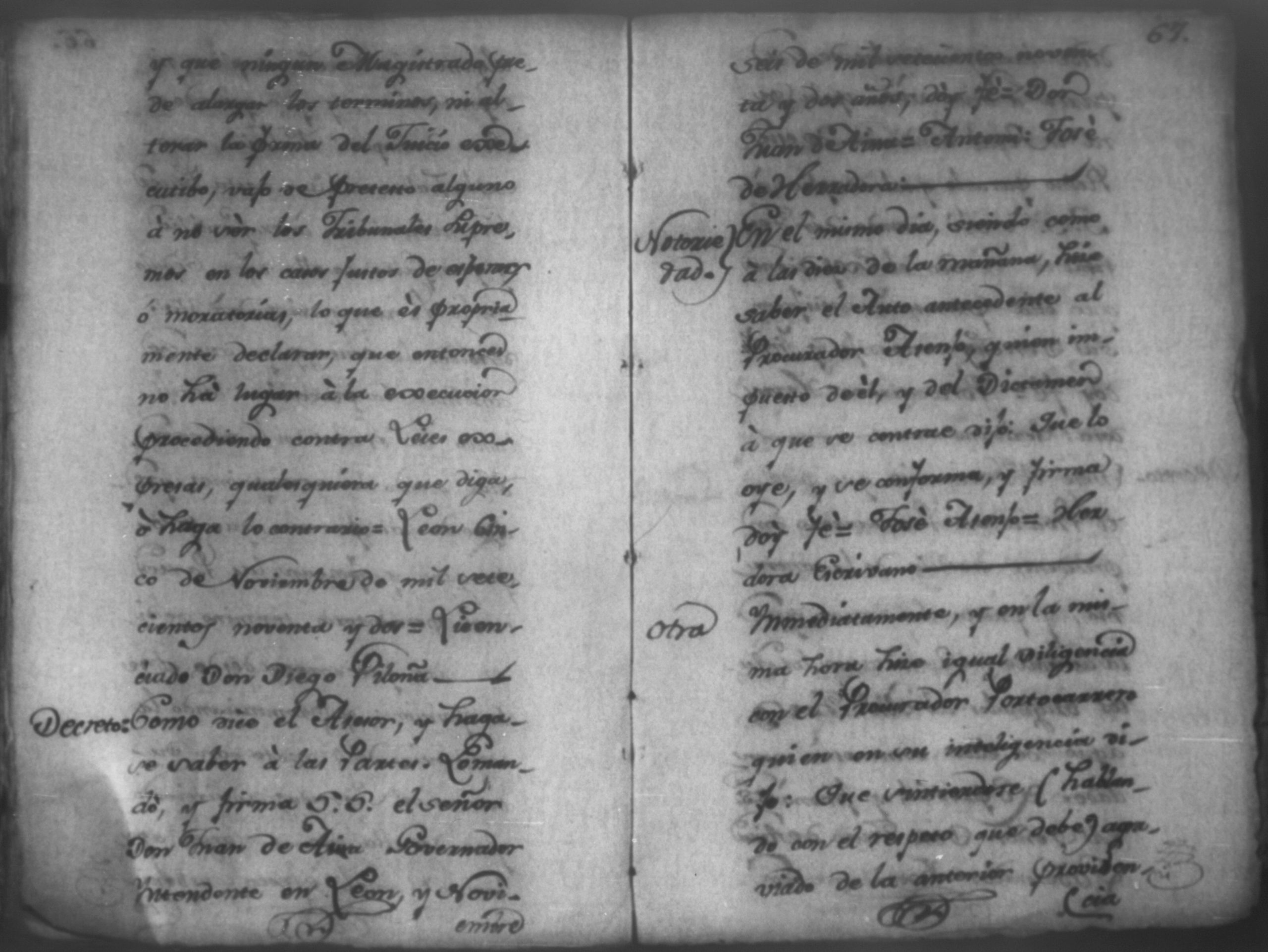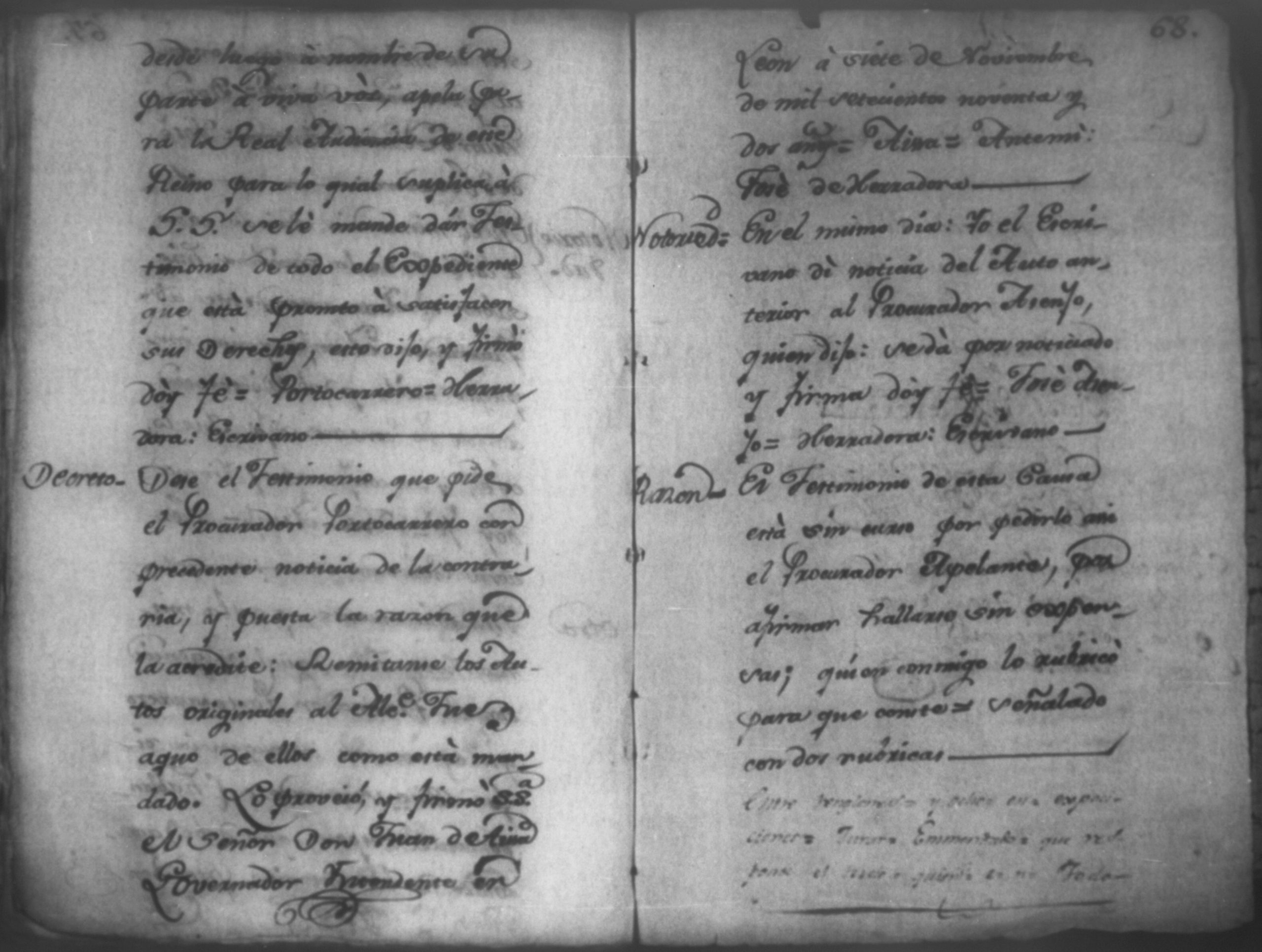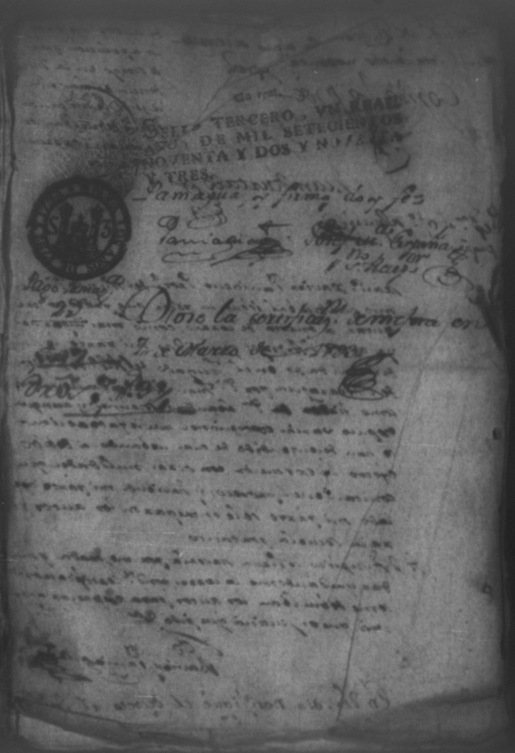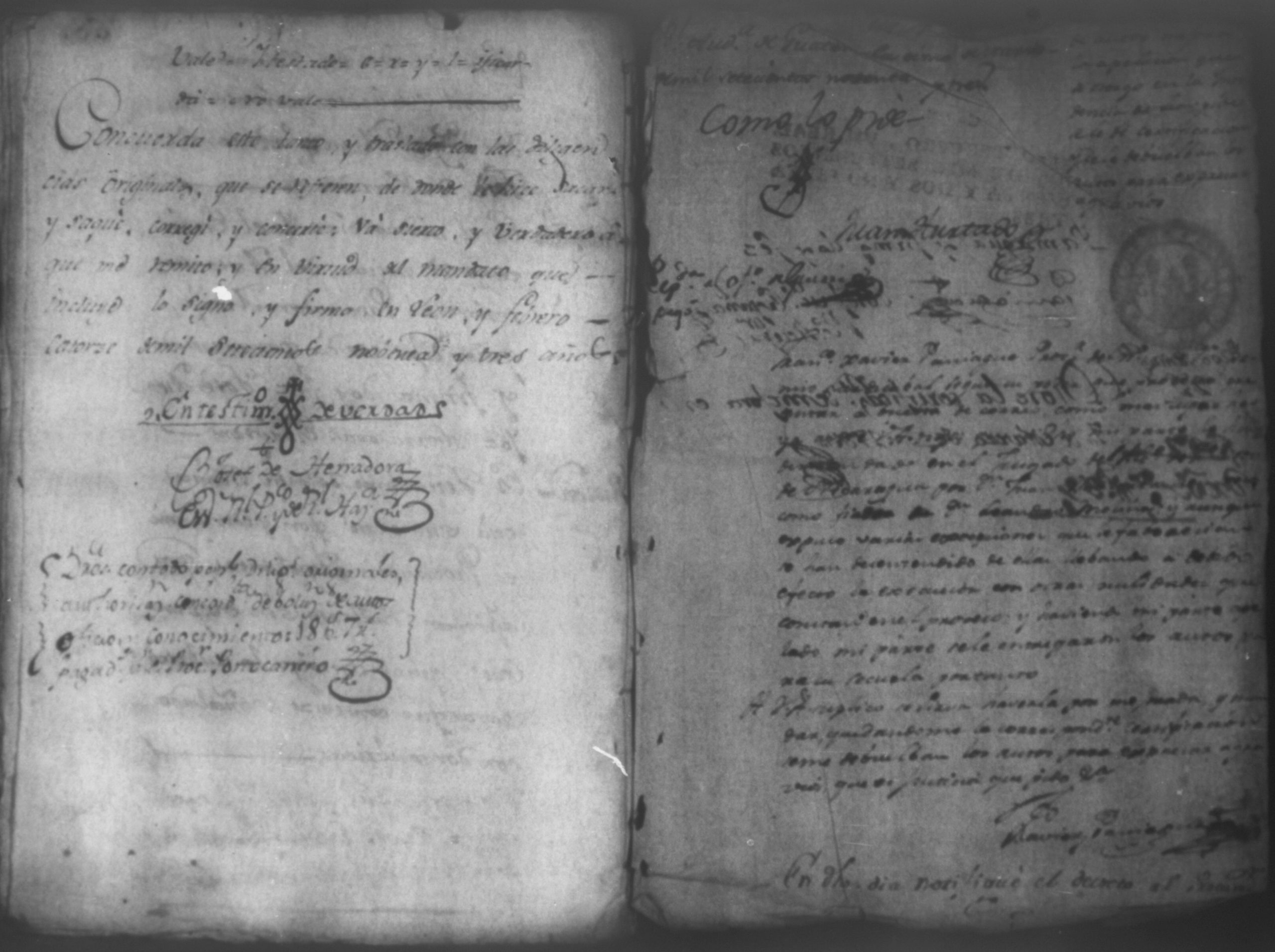Temática: Nicaragua, 1792. Sobre el incumplimiento de pago por parte de Leandro Molina por la cantidad de 200 pesos, correspondientes al estanco de aguardiente. "Minas del Peñon, y Junio quince de mil setecientos ochenta y ocho. Digo yo Don Leandro Molina vecino de esta Jurisdicción de León y residente en dicho Mineral, que tengo celebrada contrata con Don Julian Armas de tomar el Estanco de Aguardiante de este dicho Mineral inclusive la poblacion del Sauce, en la cantidad de Doscientos pesos, á los mismos que me obligo, y deben correr de mi cuenta de la fecha en adelante dichos Estancos y la exivicion de la dicha cantidad la hede hacer a Don Agustin Rodriguez Lobato Asentista de dicho ramo, y con facultad de este sugeto á celebrado dicha Don Julian esta contrata y debe entenderse que los dichos Doscientos pesos se los he de dár por cada un año y para el seguro de esta contrata doy por mis fiadores a Don Antonio Arce y Don Benito Lardisayal y juntos los tres nos obligamos en toda forma de derecho y renunciamos todas las Leies, Fueros, y Derechos que hagan á nuestro fabor y queremos nos valgan ahora, y en tiempo alguno y nos constituimos por deudores y principales pagadores de la dicha cantidad [...]". (Extracto de los folios 1 y 1v.).