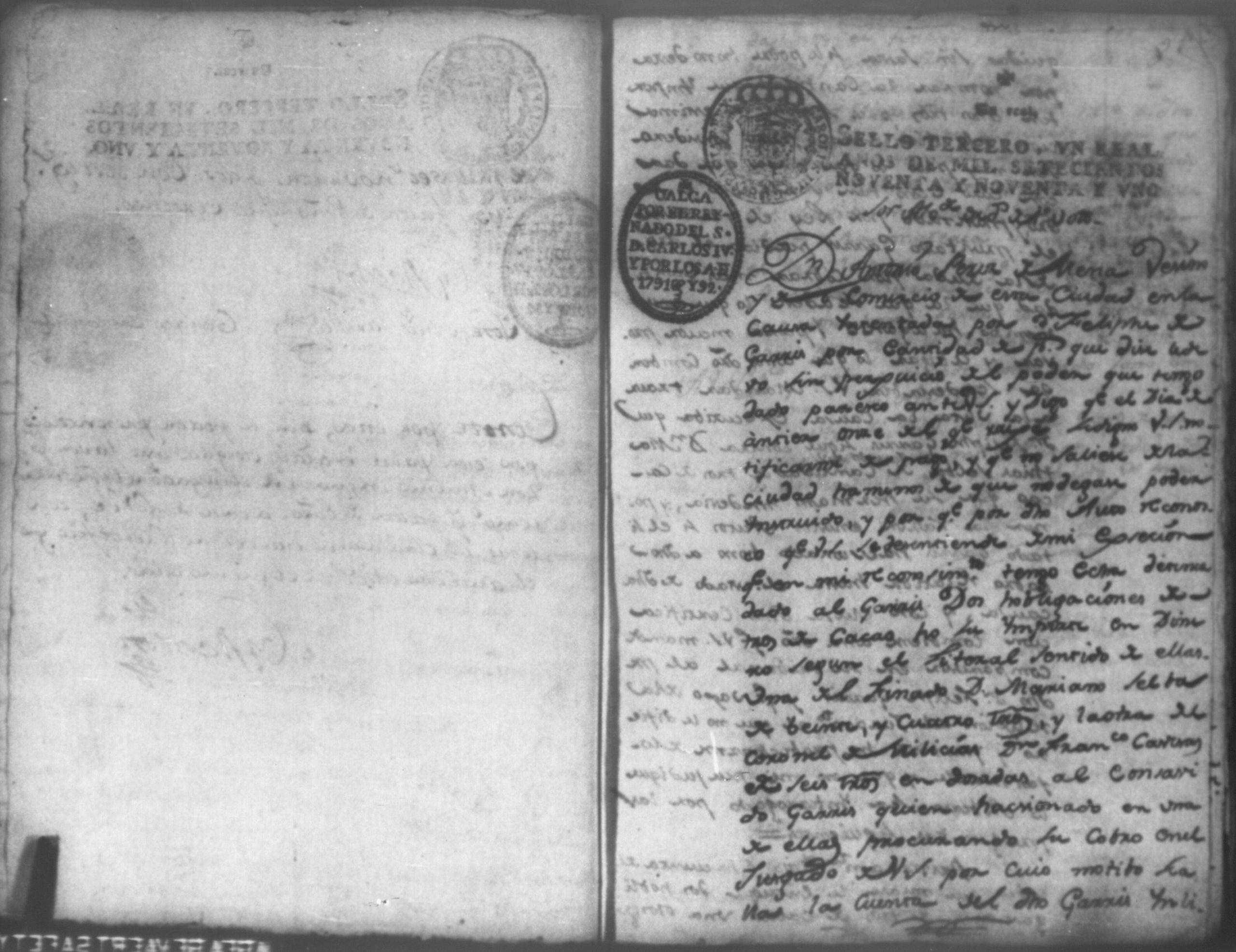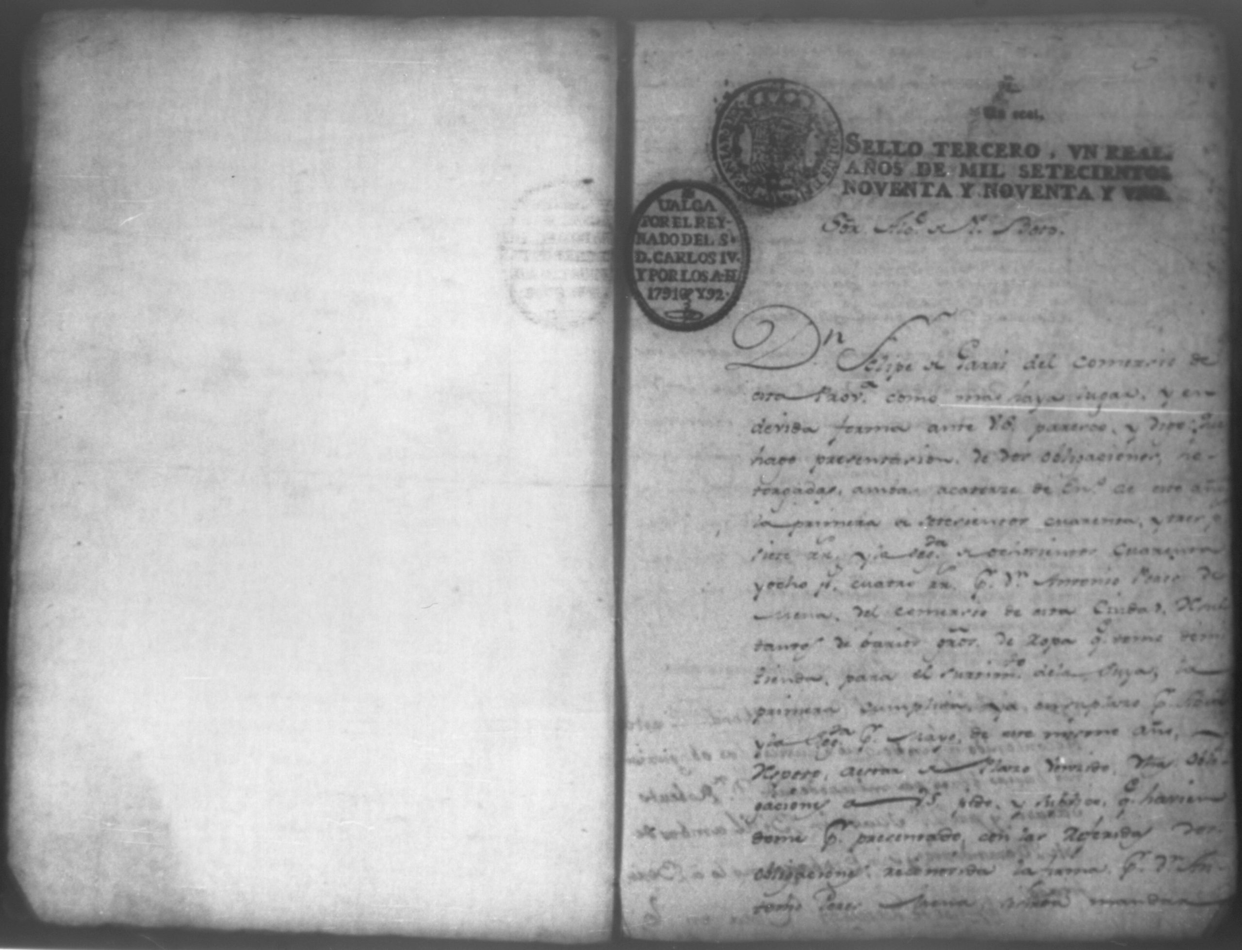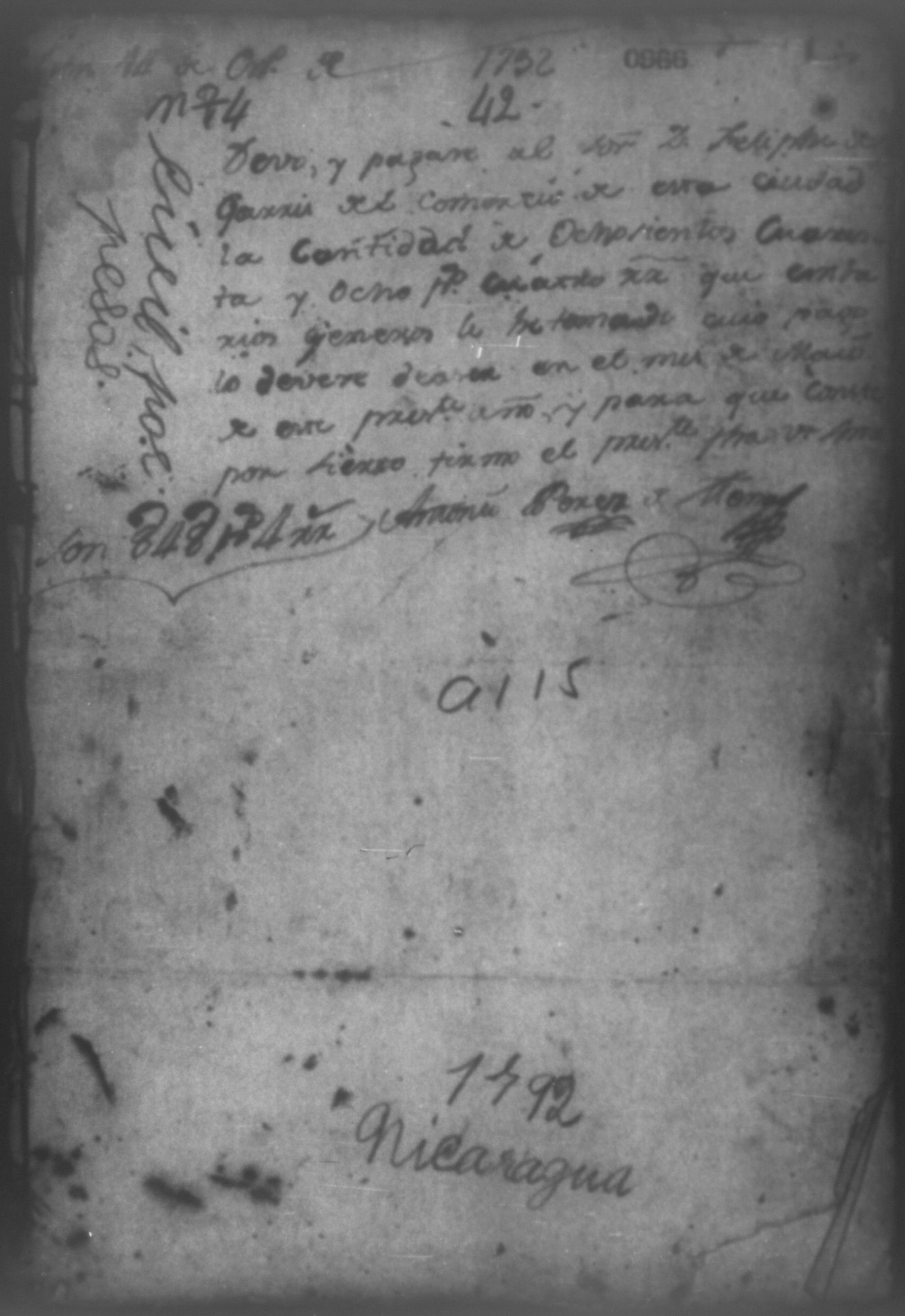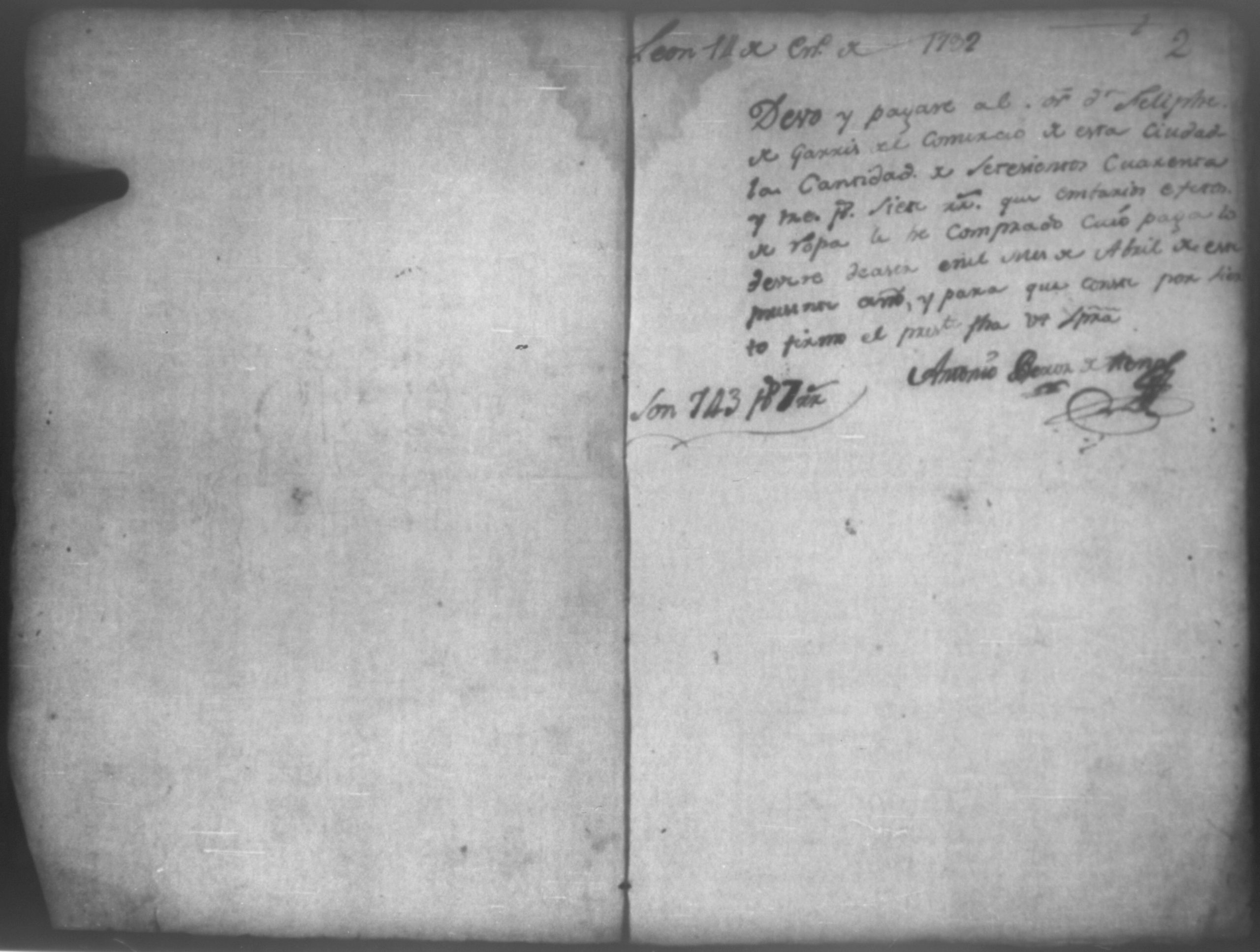 Temática: Nicaragua, 1792. Sobre el pago de la deuda de Antonio Perez de Mena a don Felipe de Garriz, por la cantidad de 848 pesos 4 reales. "Señor Alcalde de Primer Boto. Don Felipe de Garri del comercio de esta Provincia como mas haya lugar y en devida forma ante Vuestro Señor paresco, y digo: que hago presentacion de dos obligaciones hotorgadas ambas a catorze de Enero de este año la primera de setesientos cuarenta y tres pesos siete rreales y la segunda de ochocientos cuarenta y ocho pesos cuatro rreales por don Antonio Perez de Mena del comercio de esta ciudad, de [ilegible] -tantes de barios gramos de ropa que viene de mi tienda para el suministro de la suya, la primera cumplida ya en plazo por [...] y la segunda por mayo de este mismo año. [...]" (Extracto del folio 1).