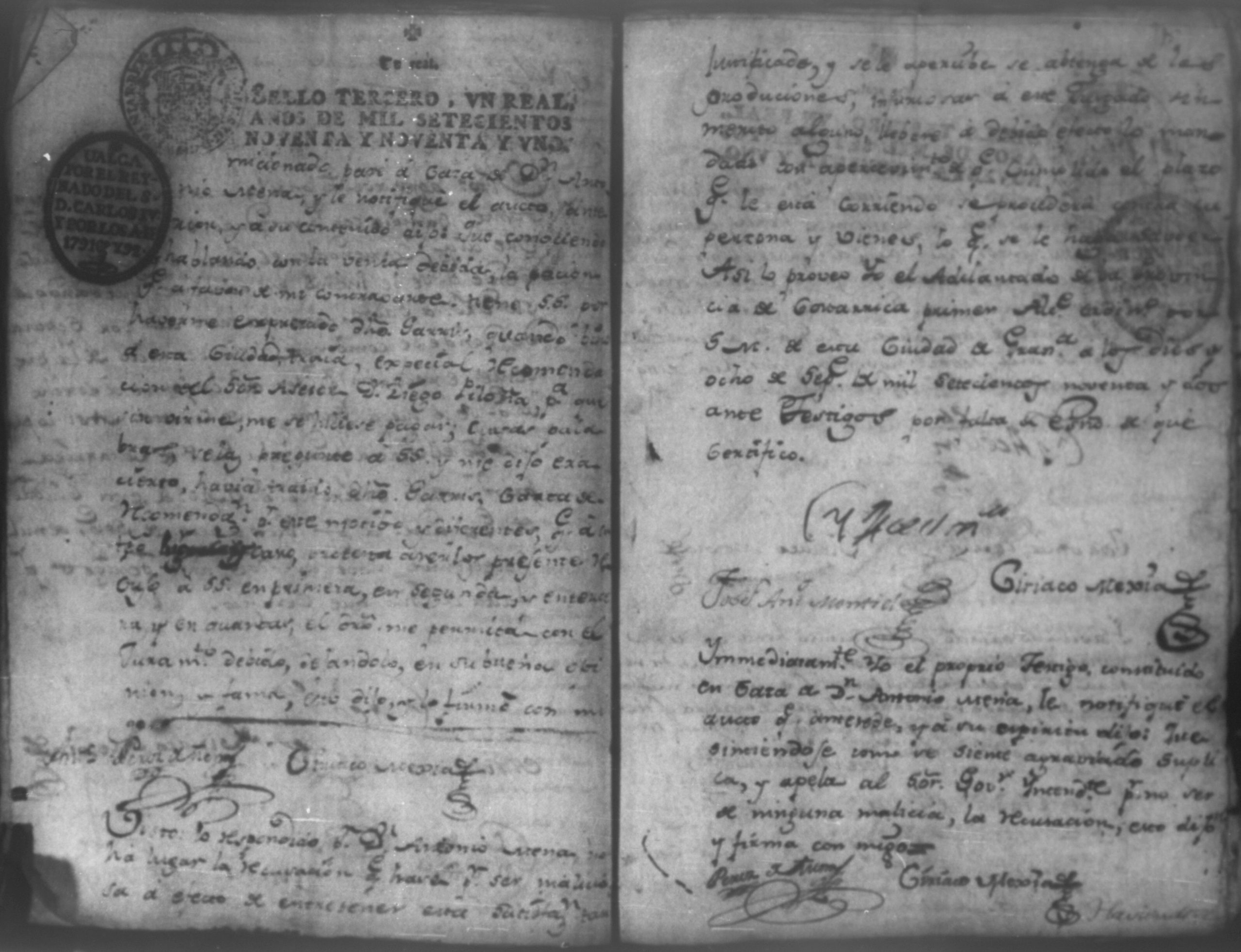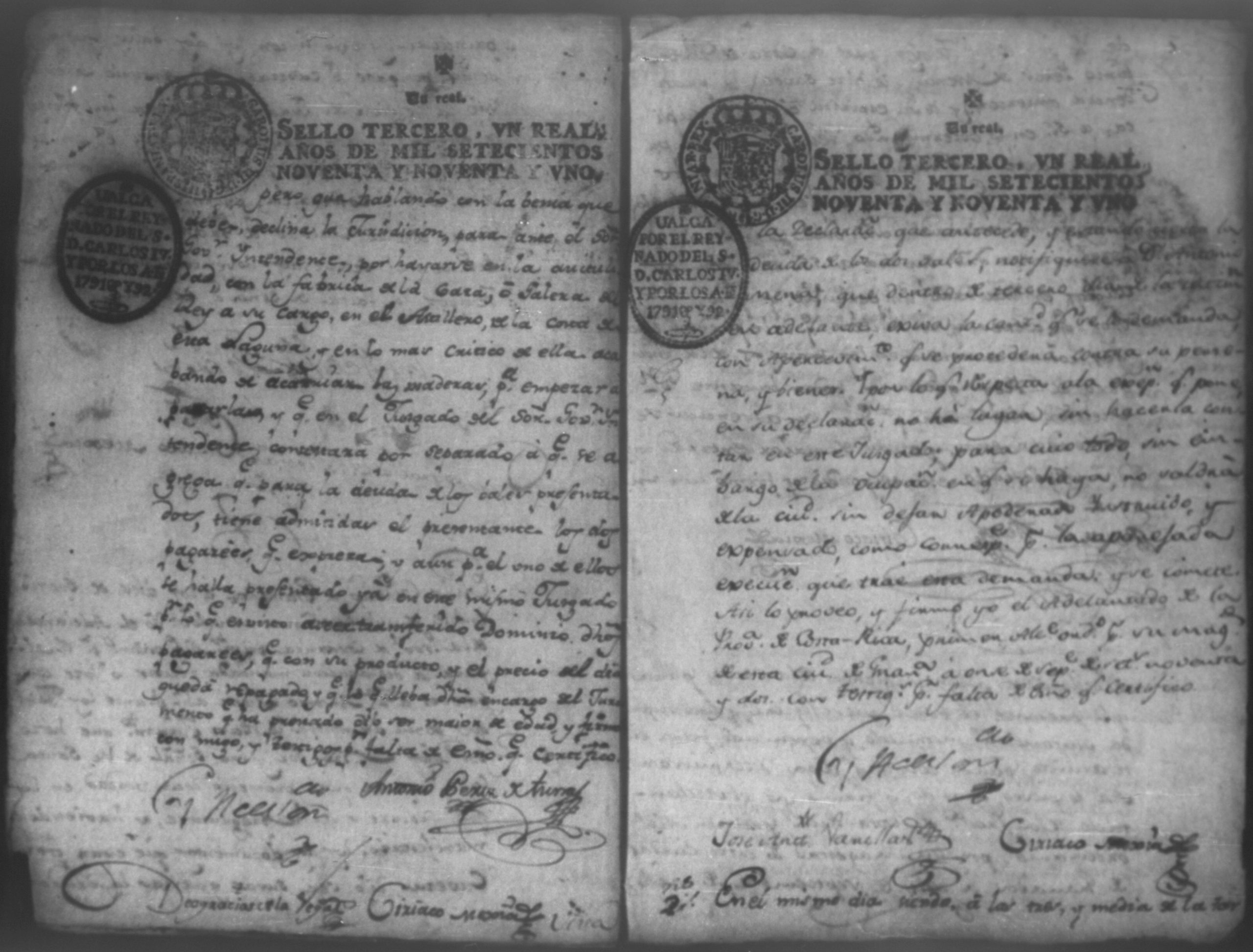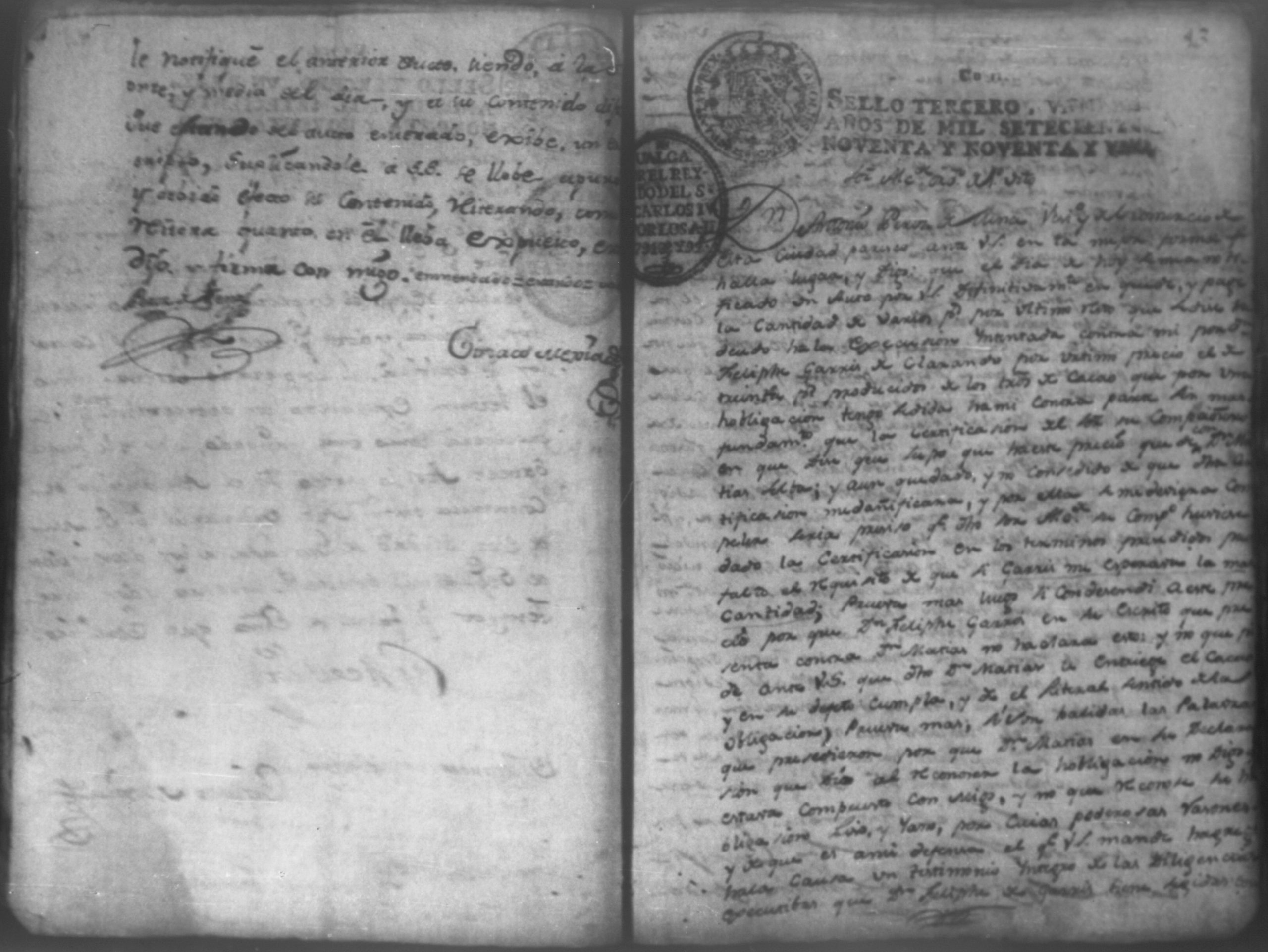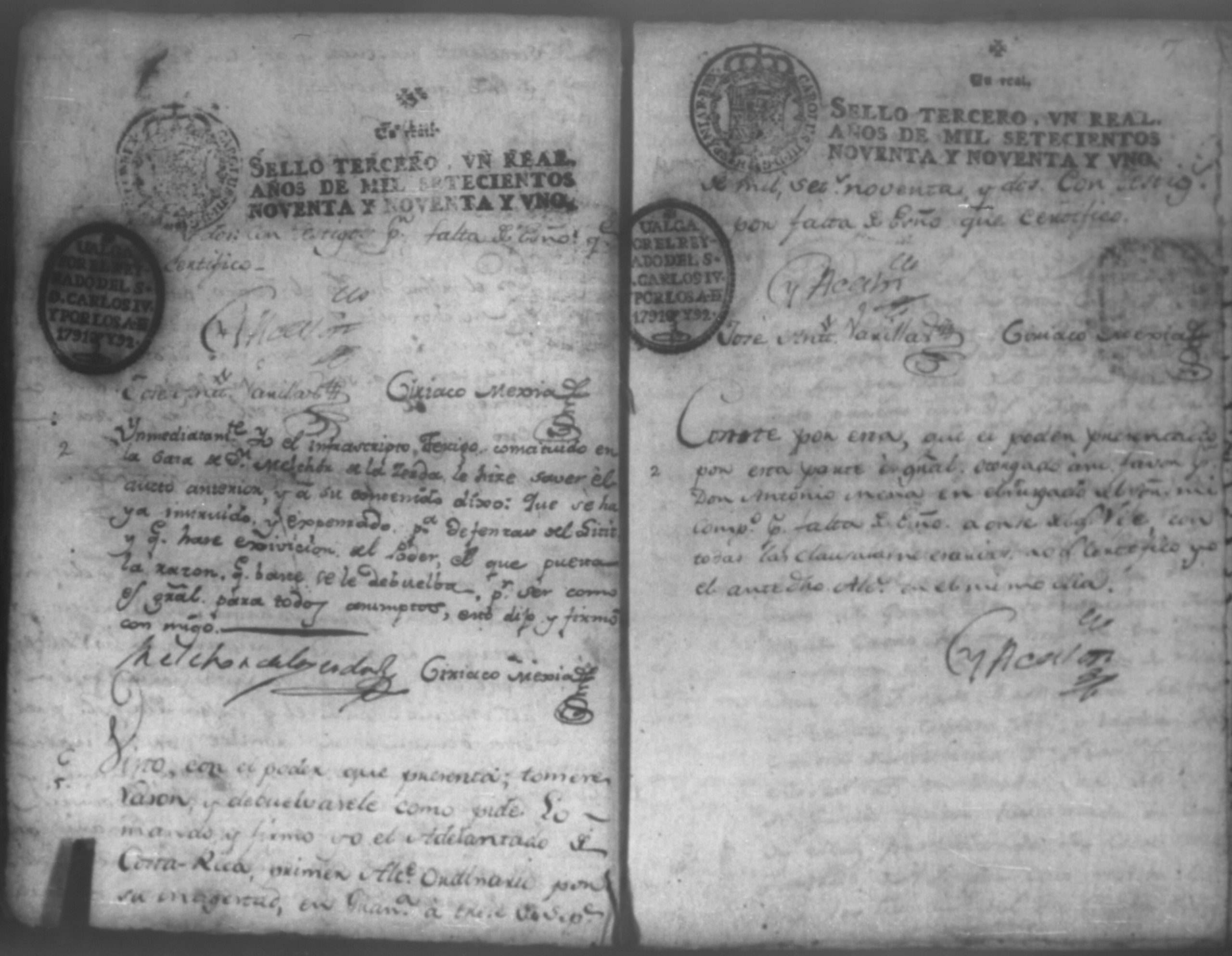 Temática: Nicaragua, 1792. Sobre el pago de la deuda de Antonio Perez de Mena a don Felipe de Garriz, por la cantidad de 848 pesos 4 reales. "Señor Alcalde de Primer Boto. Don Felipe de Garri del comercio de esta Provincia como mas haya lugar y en devida forma ante Vuestro Señor paresco, y digo: que hago presentacion de dos obligaciones hotorgadas ambas a catorze de Enero de este año la primera de setesientos cuarenta y tres pesos siete rreales y la segunda de ochocientos cuarenta y ocho pesos cuatro rreales por don Antonio Perez de Mena del comercio de esta ciudad, de [ilegible] -tantes de barios gramos de ropa que viene de mi tienda para el suministro de la suya, la primera cumplida ya en plazo por [...] y la segunda por mayo de este mismo año. [...]" (Extracto del folio 1).