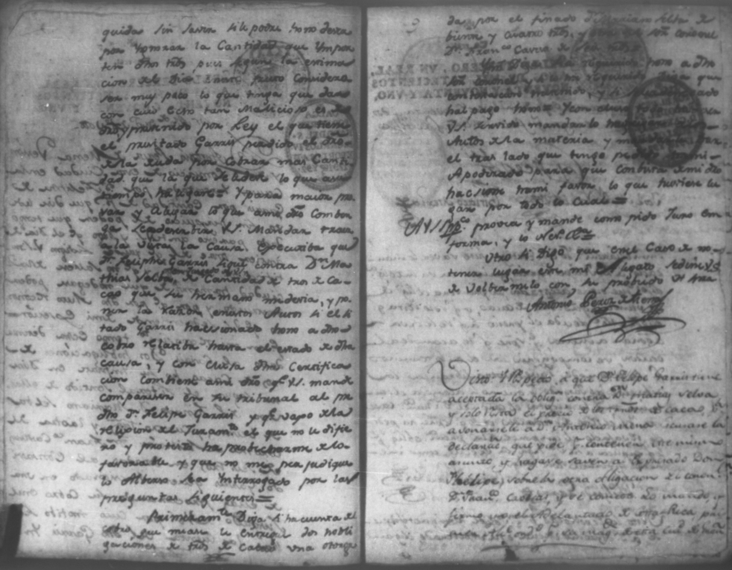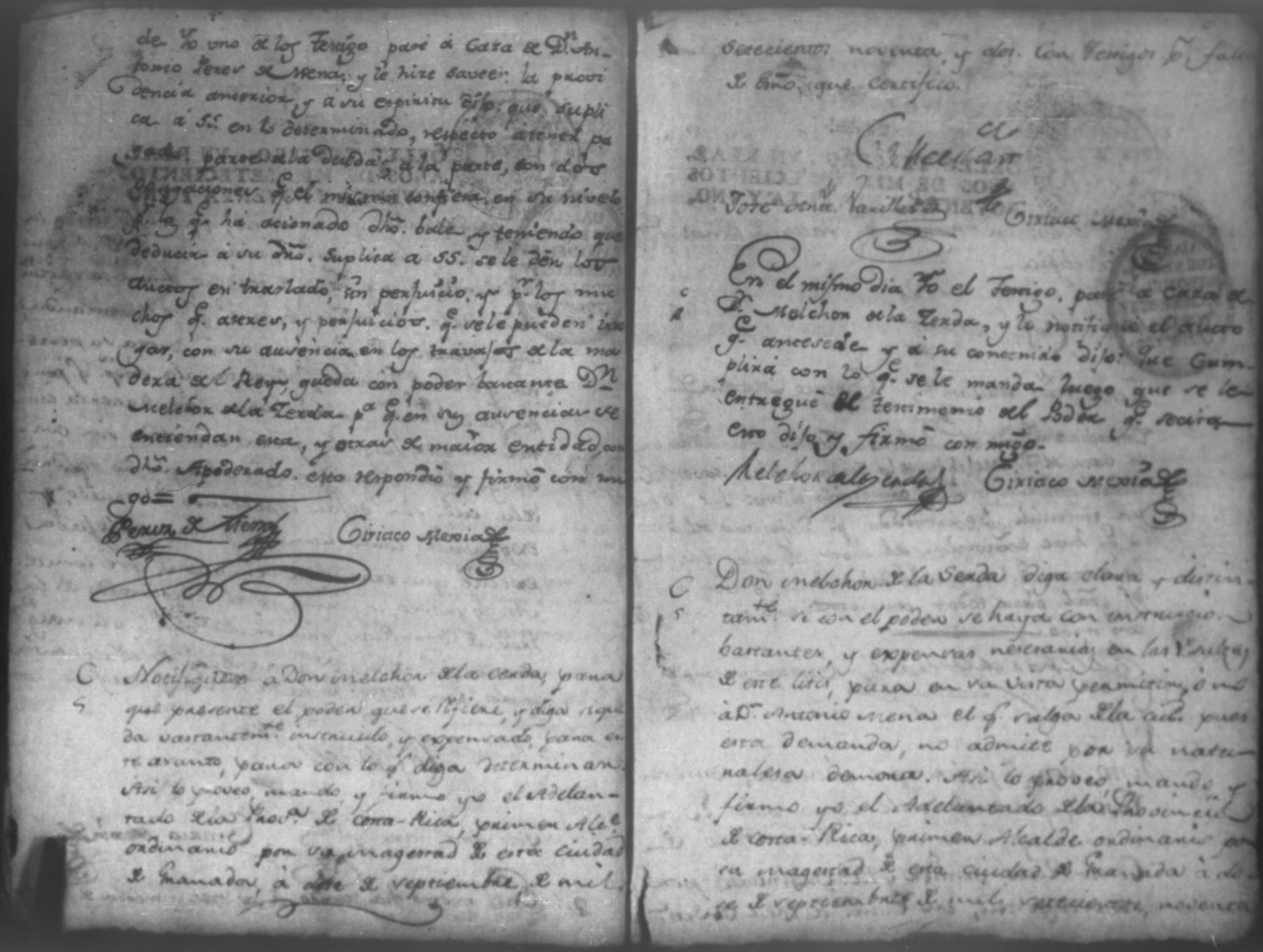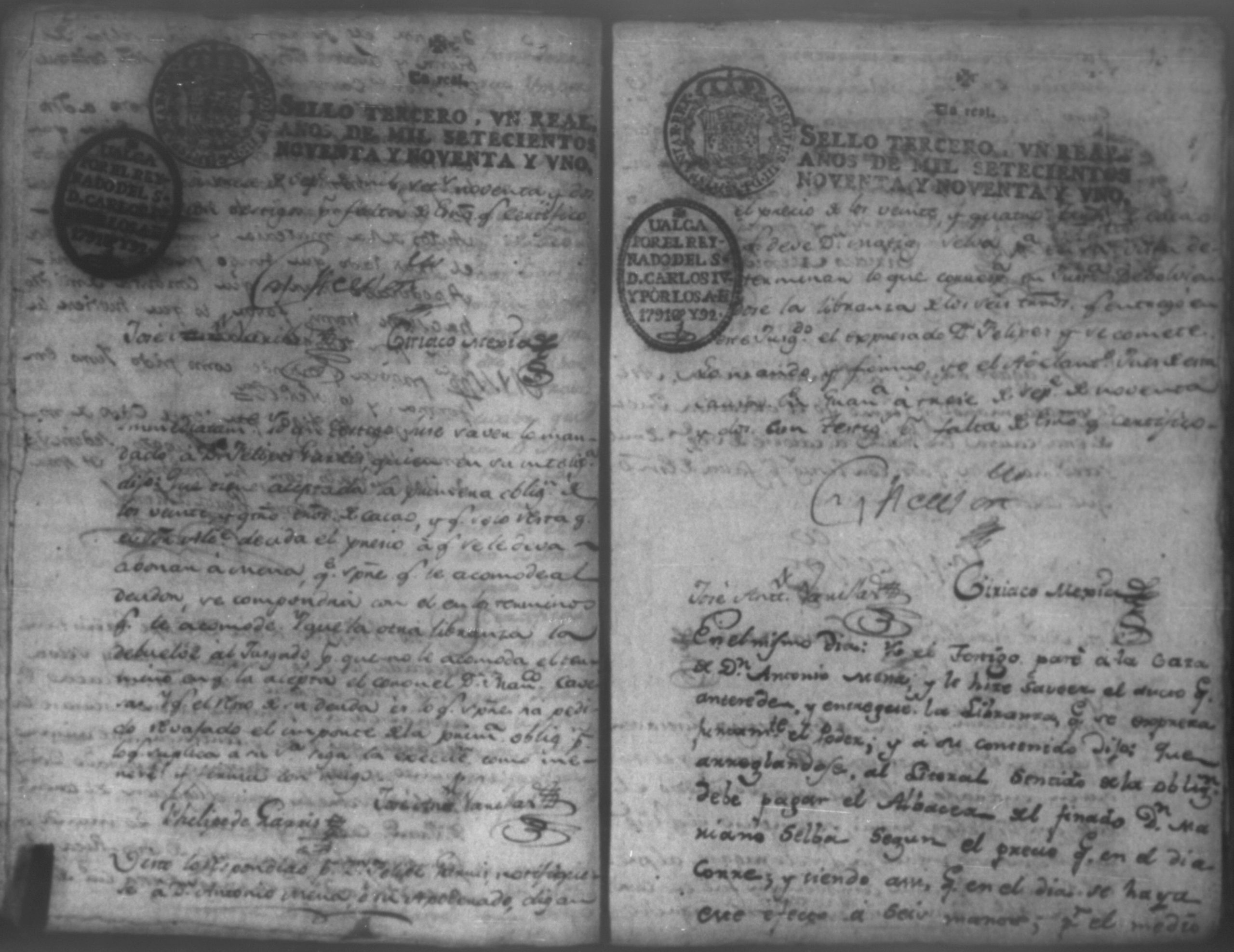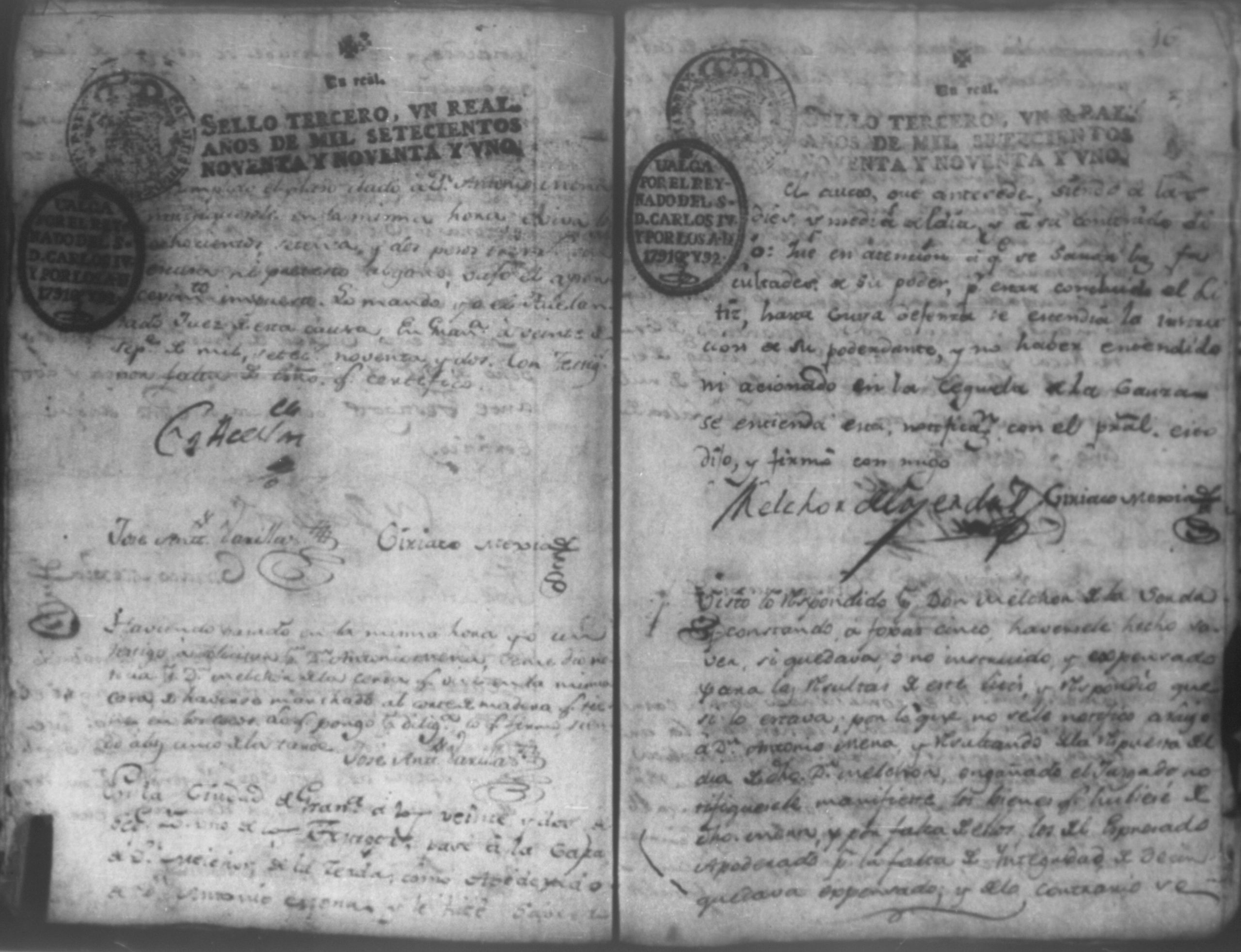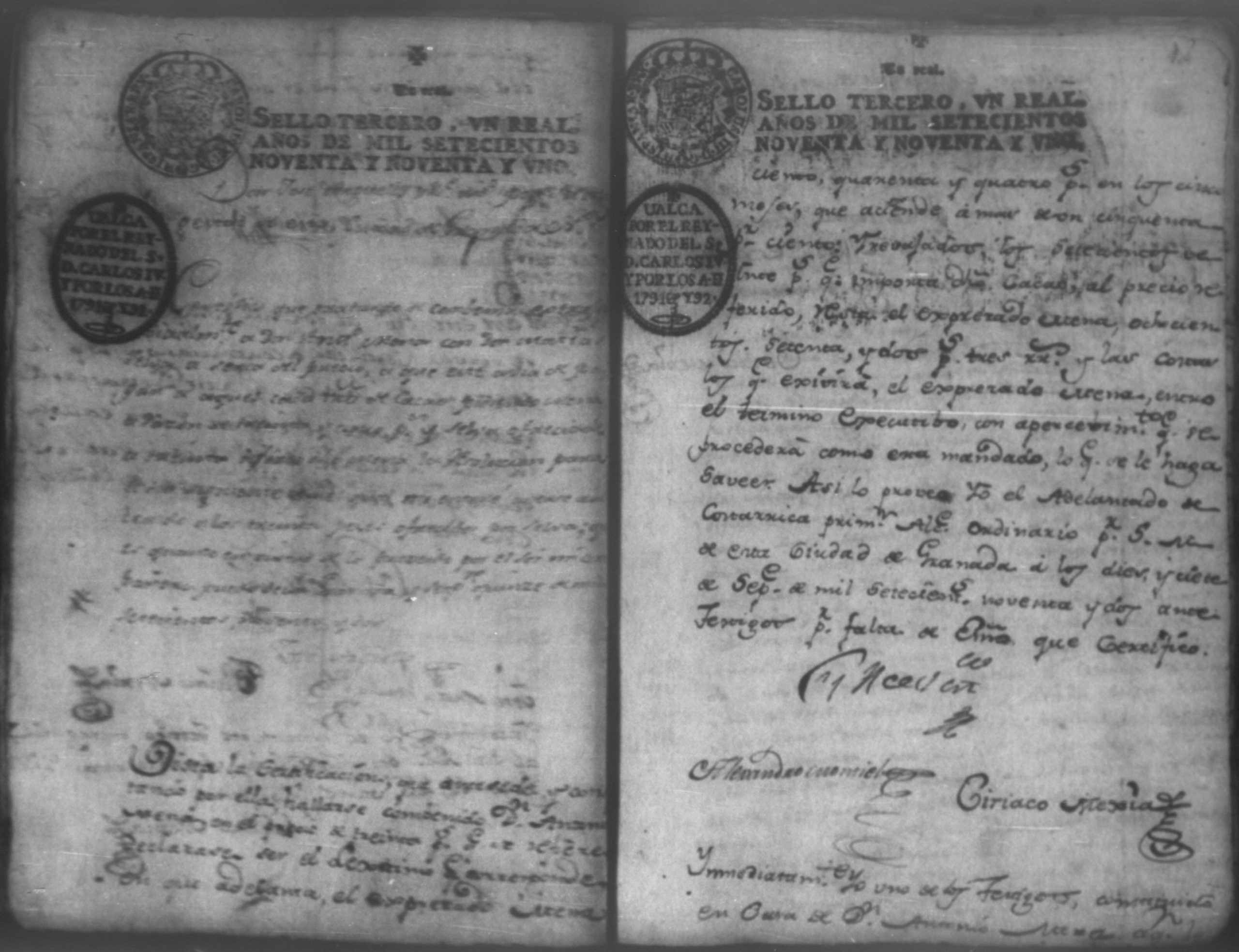 Temática: Nicaragua, 1792. Sobre el pago de la deuda de Antonio Perez de Mena a don Felipe de Garriz, por la cantidad de 848 pesos 4 reales. "Señor Alcalde de Primer Boto. Don Felipe de Garri del comercio de esta Provincia como mas haya lugar y en devida forma ante Vuestro Señor paresco, y digo: que hago presentacion de dos obligaciones hotorgadas ambas a catorze de Enero de este año la primera de setesientos cuarenta y tres pesos siete rreales y la segunda de ochocientos cuarenta y ocho pesos cuatro rreales por don Antonio Perez de Mena del comercio de esta ciudad, de [ilegible] -tantes de barios gramos de ropa que viene de mi tienda para el suministro de la suya, la primera cumplida ya en plazo por [...] y la segunda por mayo de este mismo año. [...]" (Extracto del folio 1).