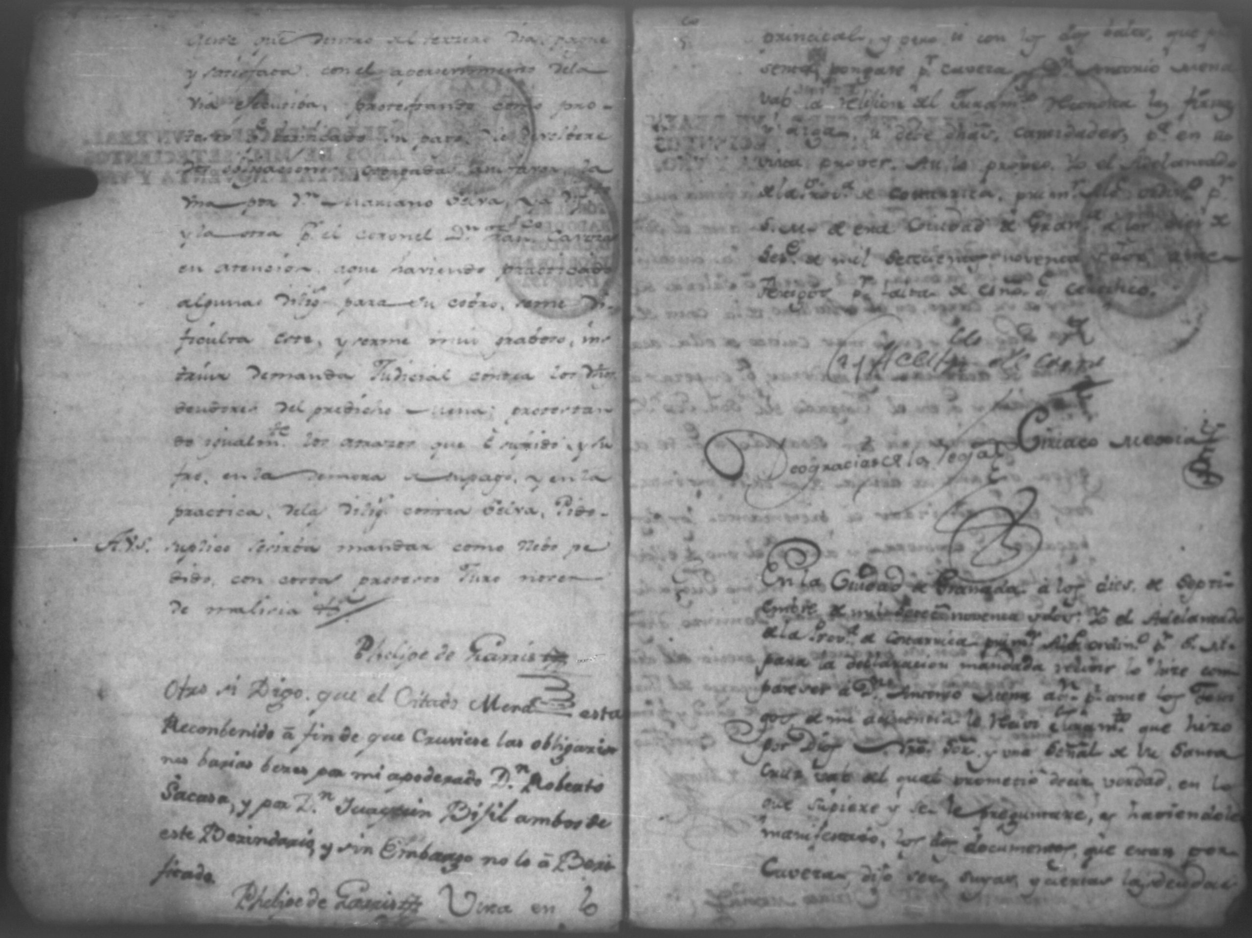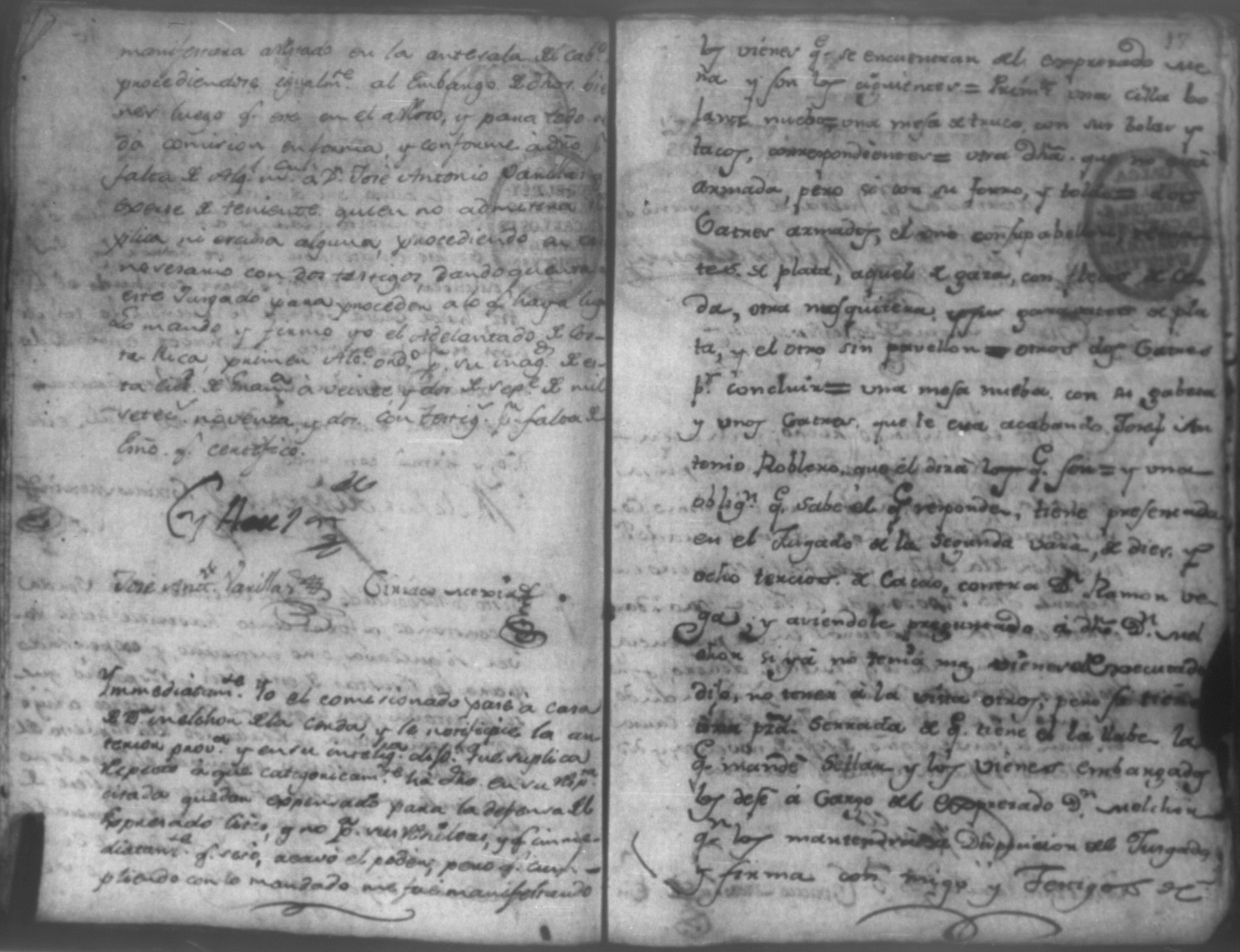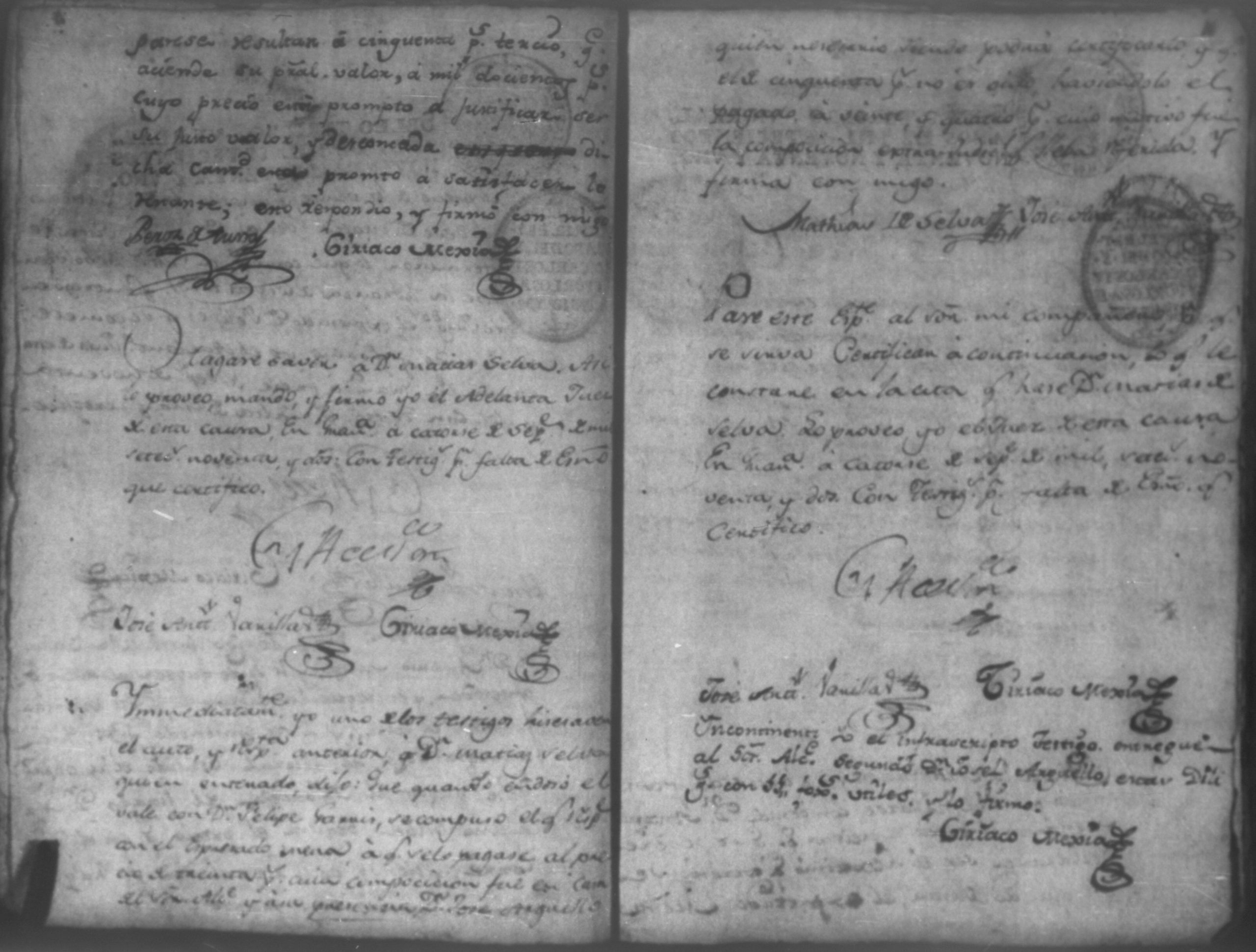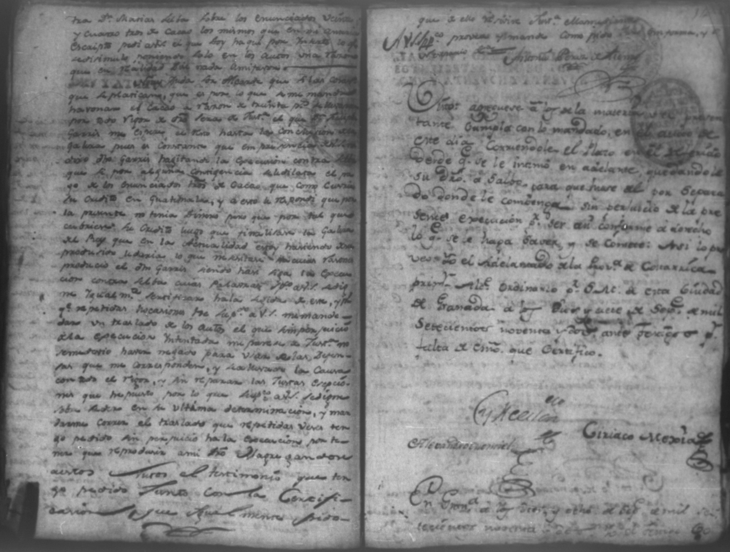 Temática: Nicaragua, 1792. Sobre el pago de la deuda de Antonio Perez de Mena a don Felipe de Garriz, por la cantidad de 848 pesos 4 reales. "Señor Alcalde de Primer Boto. Don Felipe de Garri del comercio de esta Provincia como mas haya lugar y en devida forma ante Vuestro Señor paresco, y digo: que hago presentacion de dos obligaciones hotorgadas ambas a catorze de Enero de este año la primera de setesientos cuarenta y tres pesos siete rreales y la segunda de ochocientos cuarenta y ocho pesos cuatro rreales por don Antonio Perez de Mena del comercio de esta ciudad, de [ilegible] -tantes de barios gramos de ropa que viene de mi tienda para el suministro de la suya, la primera cumplida ya en plazo por [...] y la segunda por mayo de este mismo año. [...]" (Extracto del folio 1).