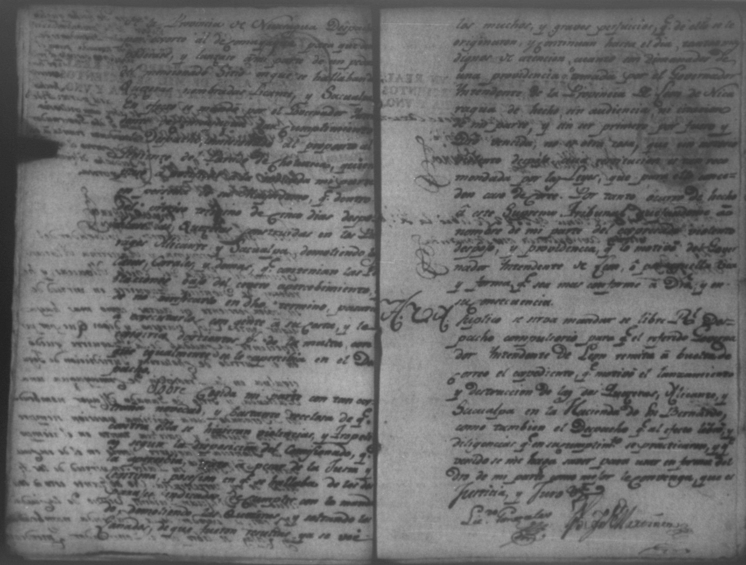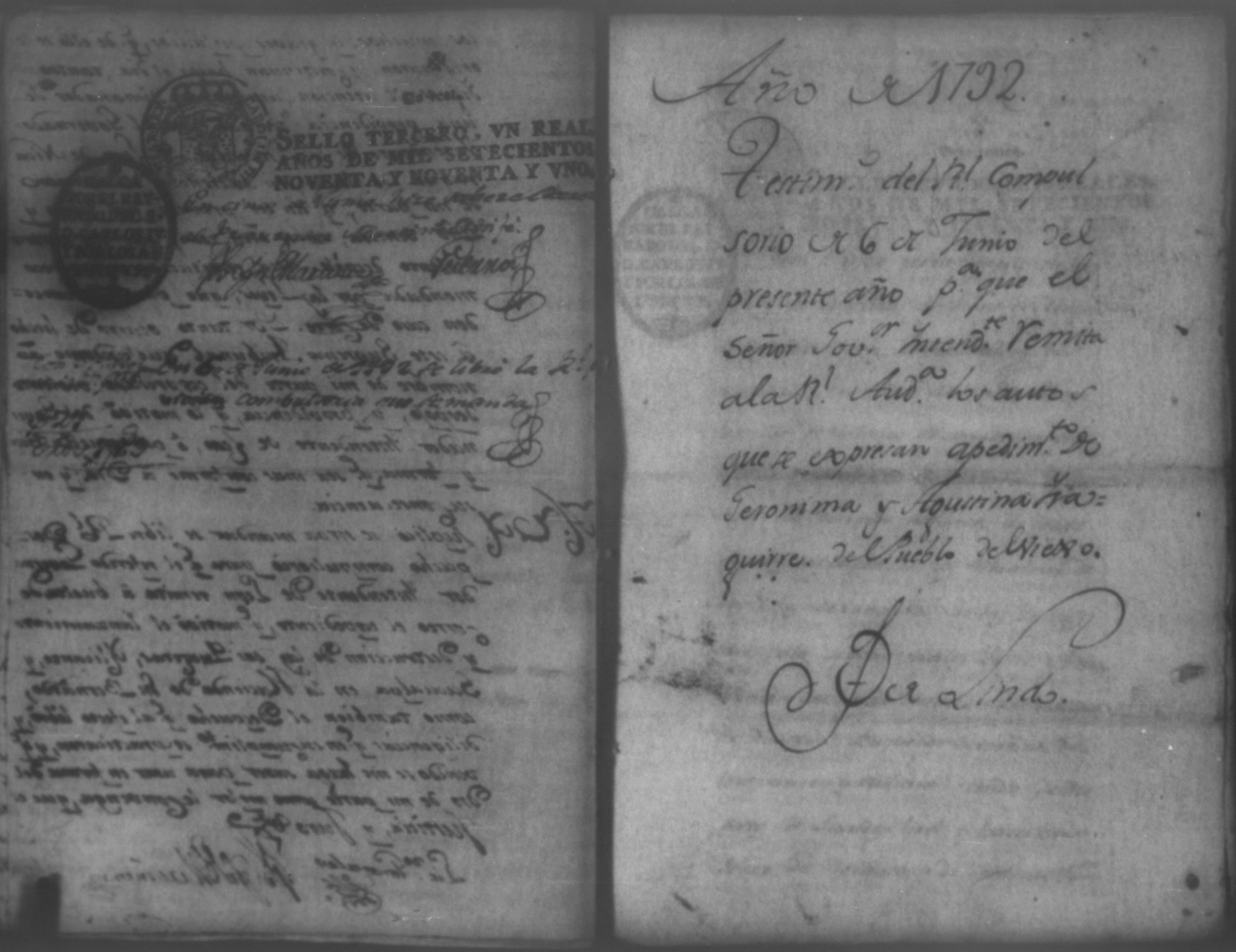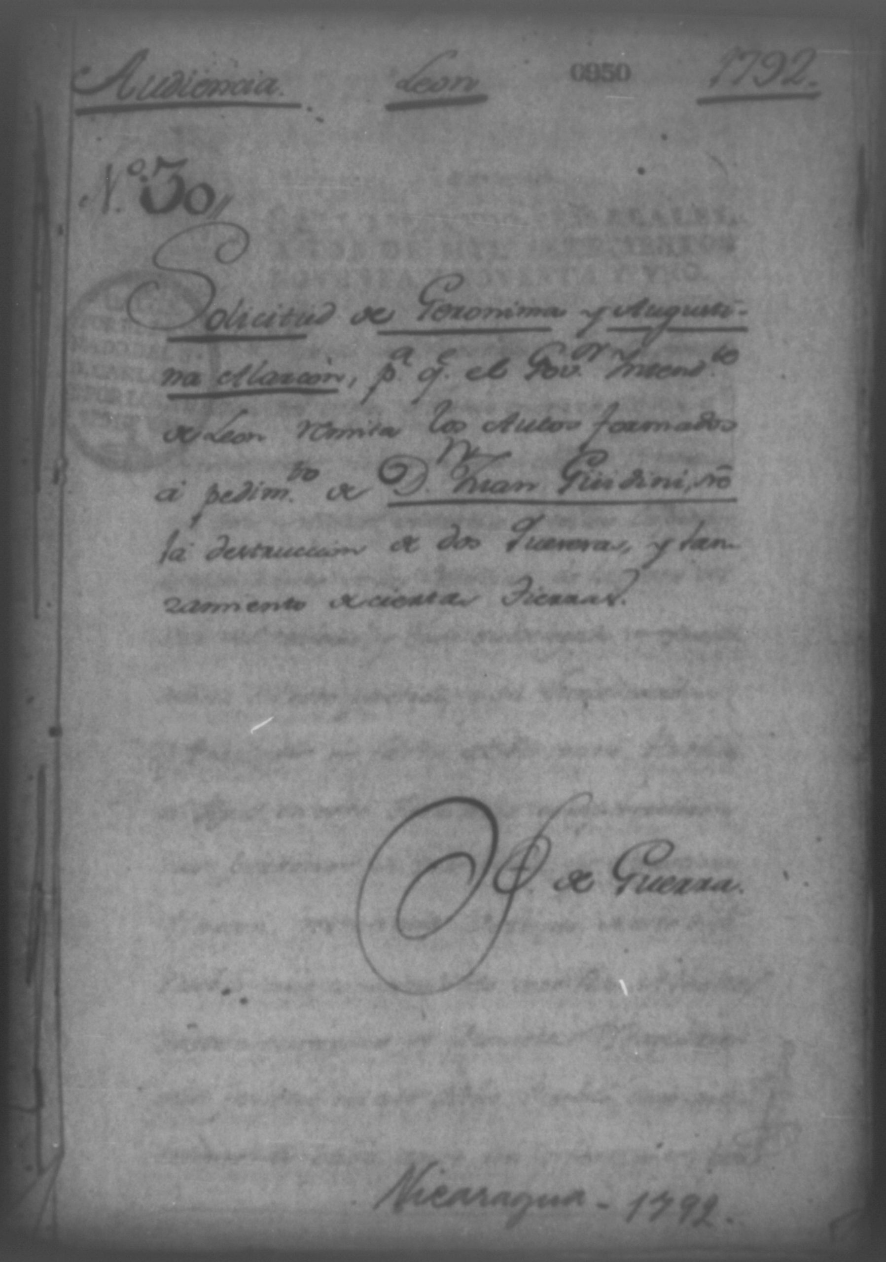 Temática: Audiencia de León 1792. Solicitud de Geronima y Augustina Alarcón para que el Gobernador Yntendente de Leon remita los autos formados a pedimento de Don Juan Güidini, sobre la destruccion de dos guerreras y lanzamiento de ciertas tierras. Incluye el testimonio del Real Compulsorio de 6 de Junio del presente año para que el Señor Governador Yntendente remita a la Real Audiencia los autos que se expresan a pedimento de Geronima y Augustina Yzaguirre del Pueblo del Viexo.