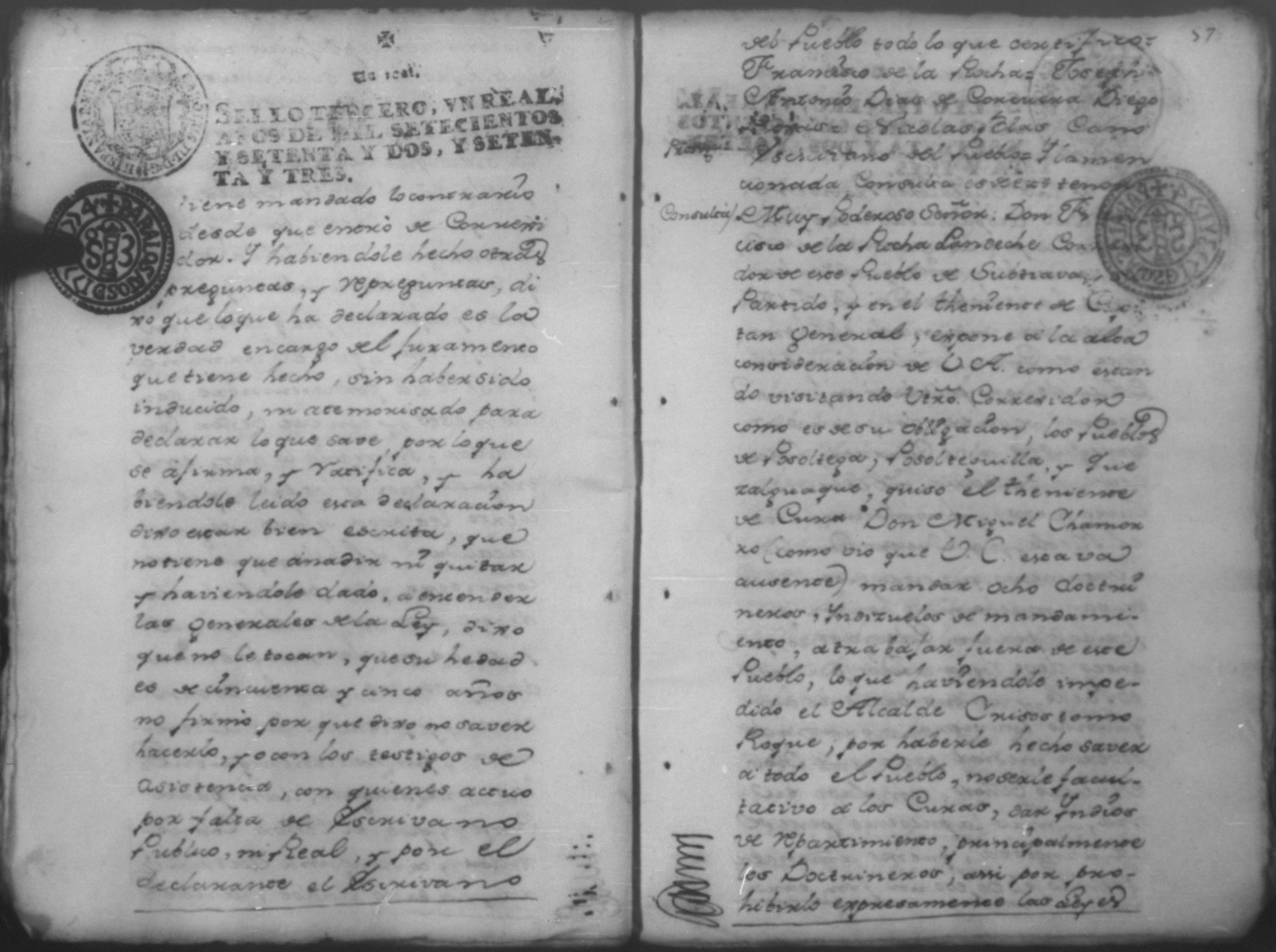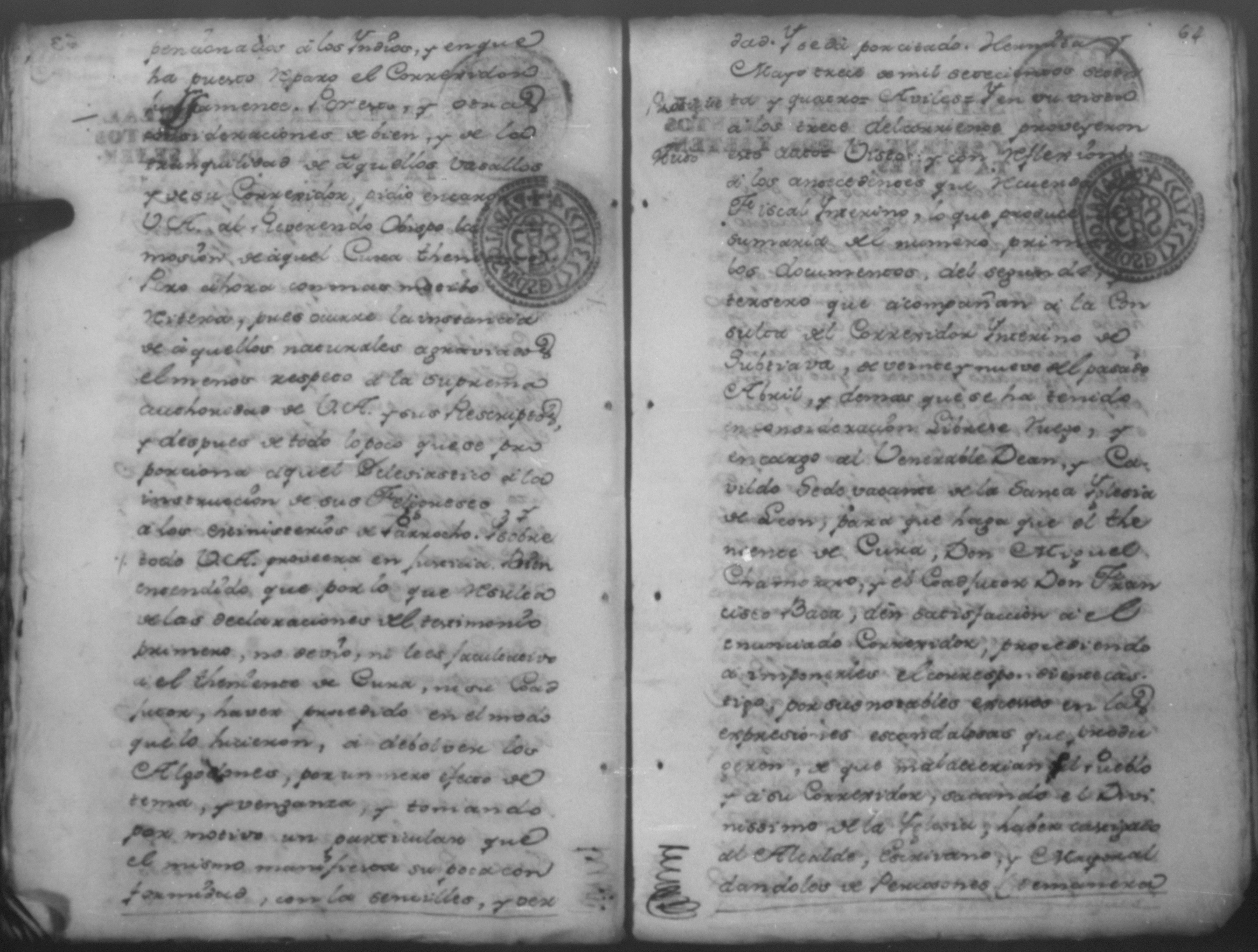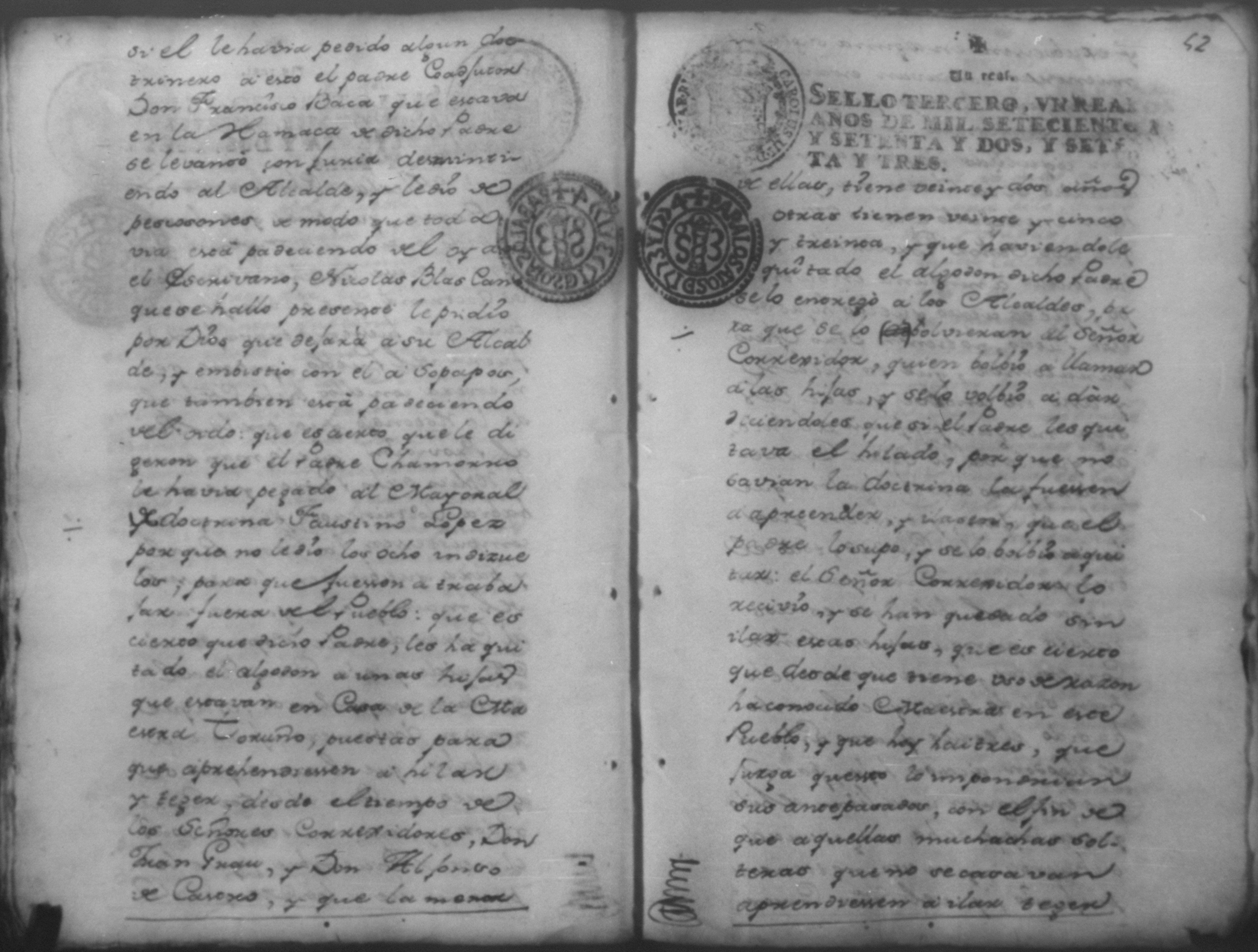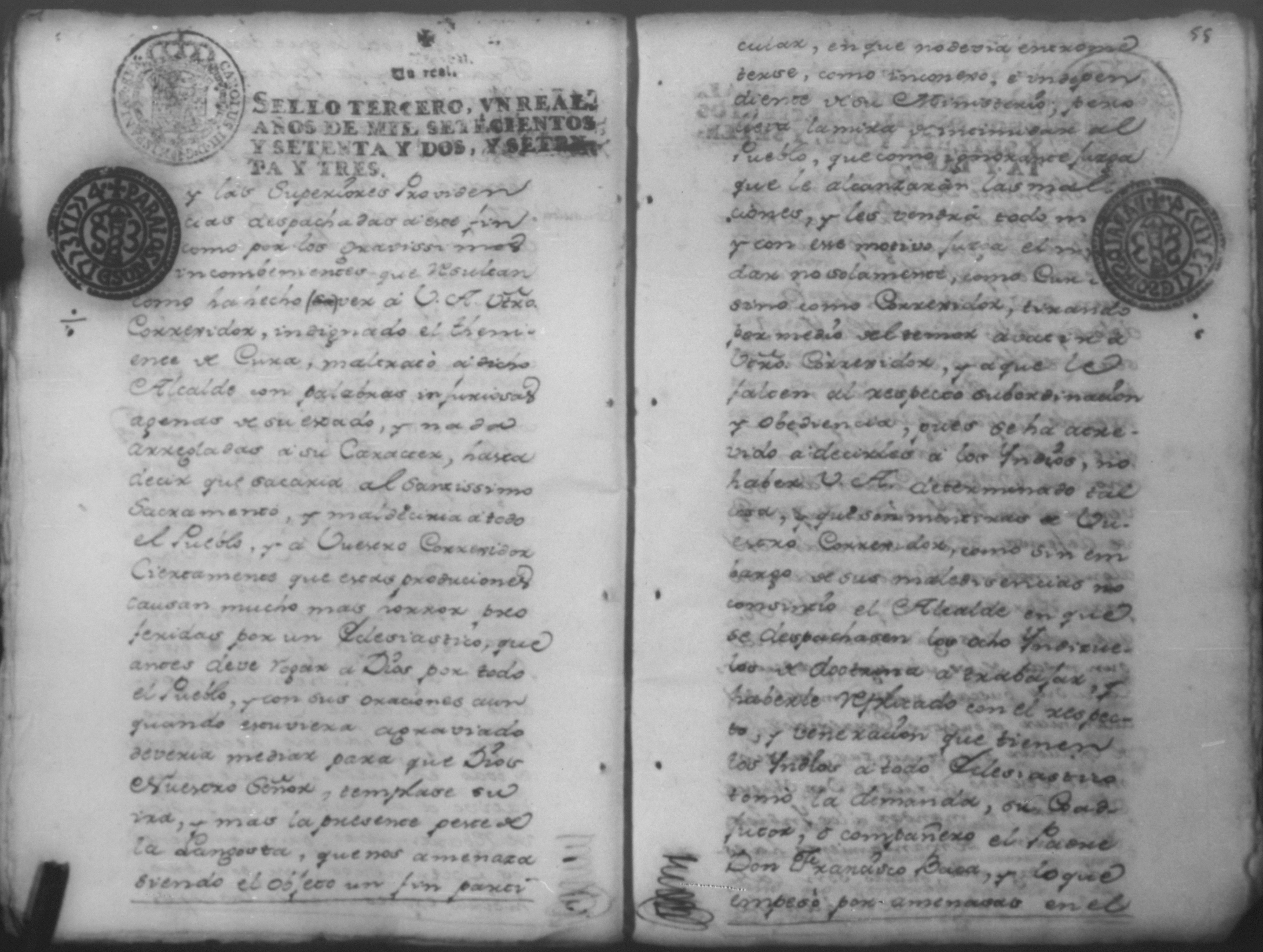 Temática: Sumaria seguia contra el Presbitero Don Miguel Chamorro para haberse dado de golpes aun mayoral de dotrina y contra su coadjutor Don Francisco Baca por haberle dado de golpes al Alcalde y [Alescai] ramo con otros puntos que contiene por haberse quedado el ilado dicho Padre Chamorro a a varias indios.