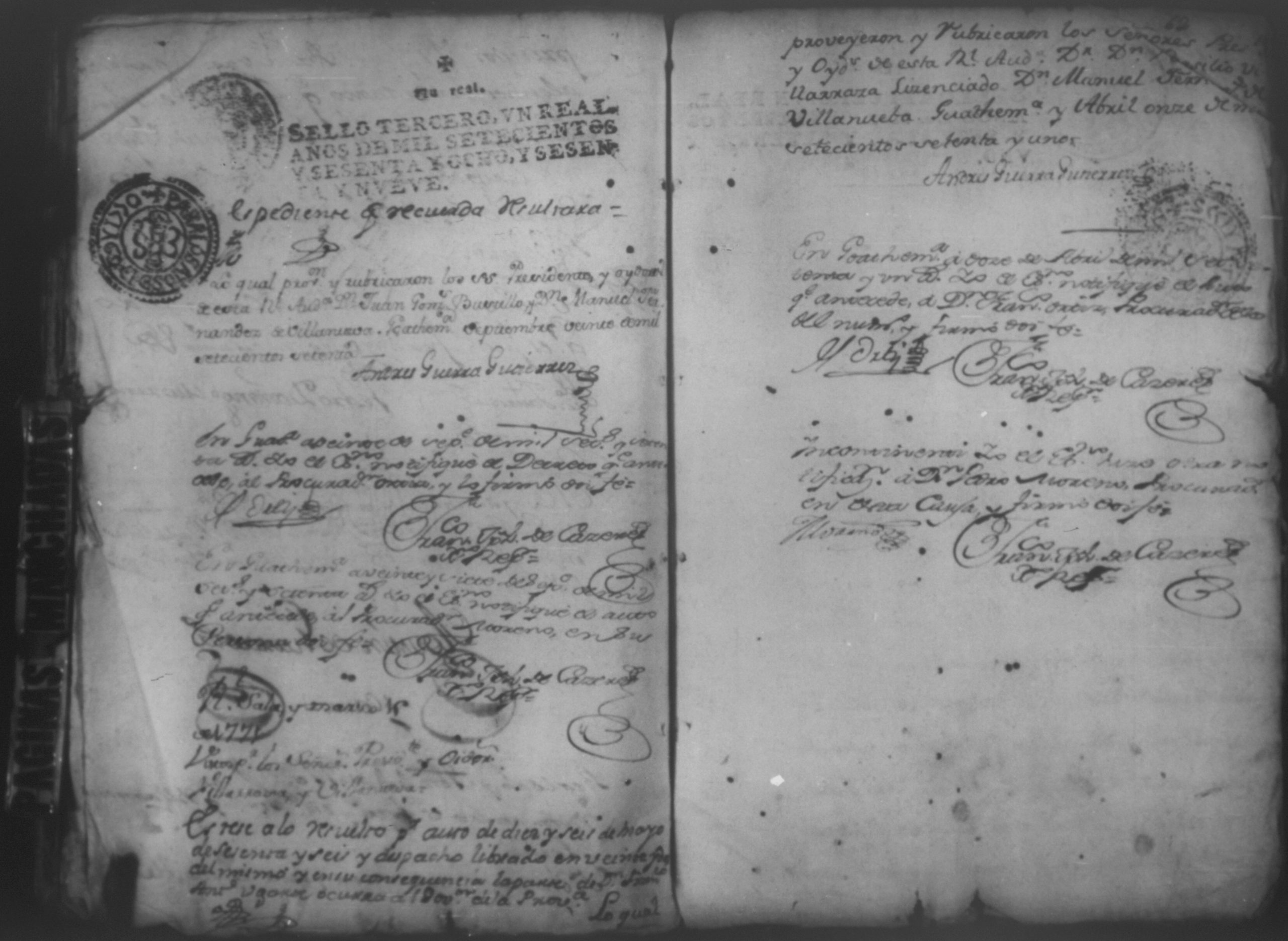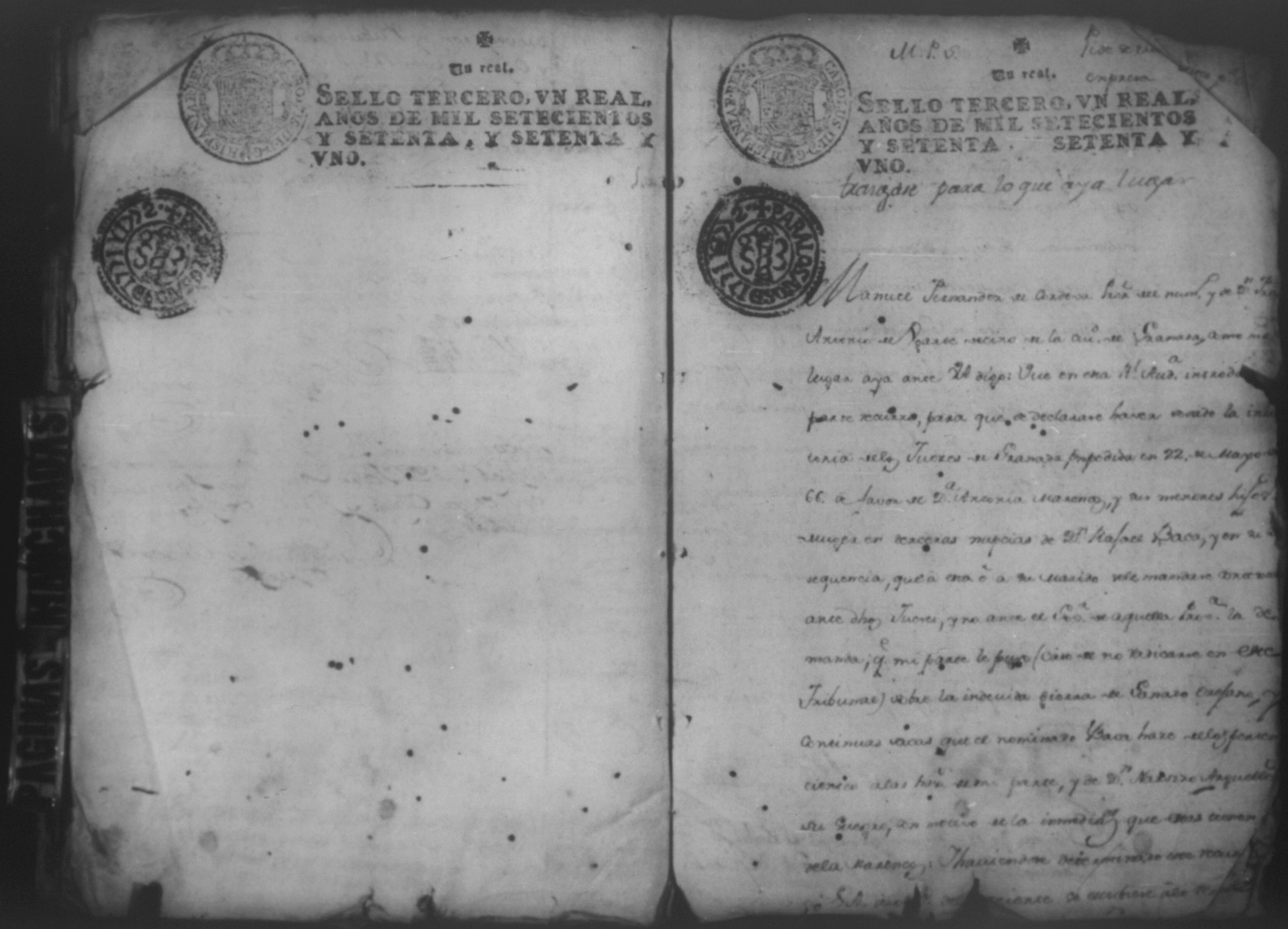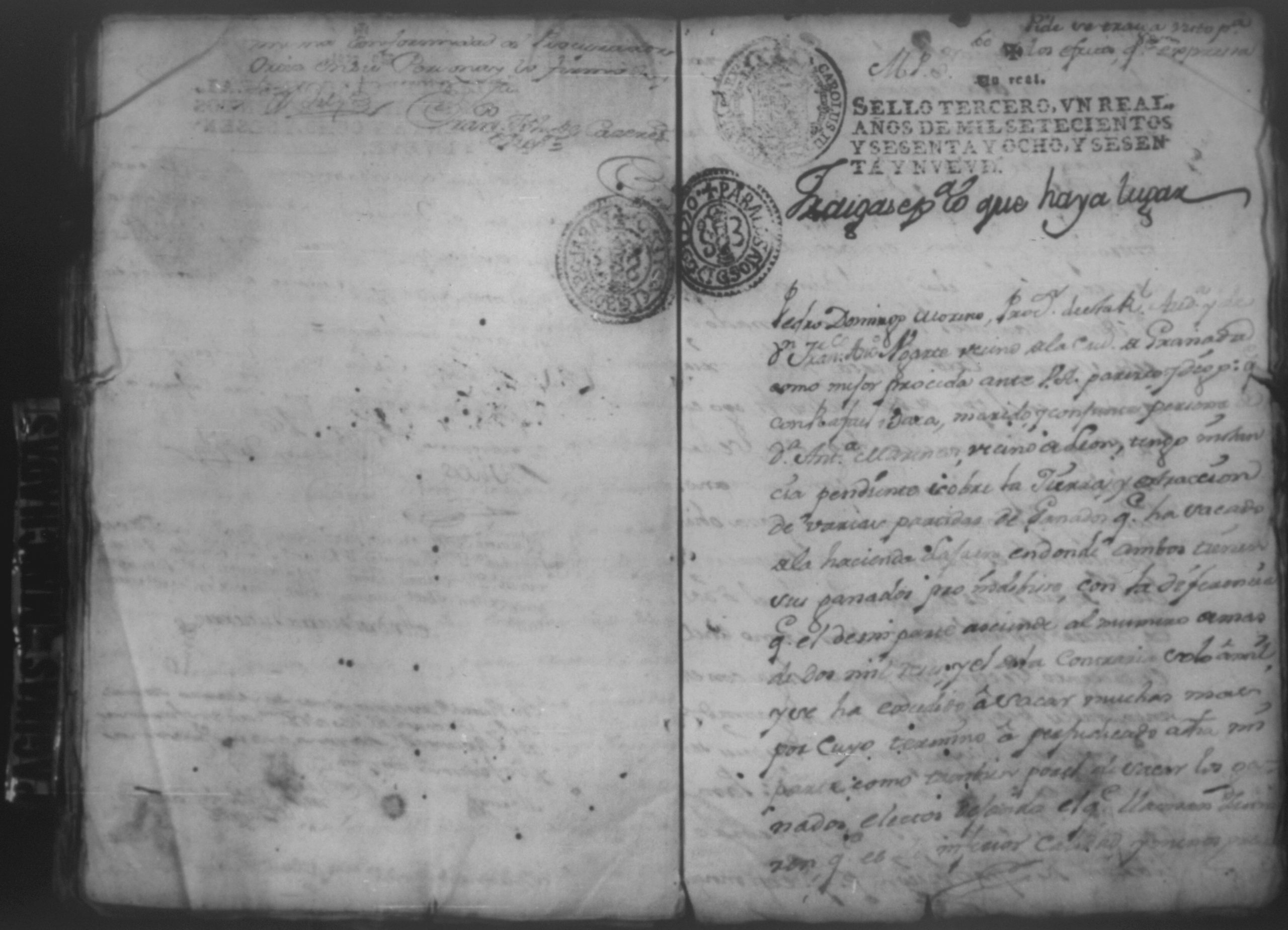 Temática: Año de 1769. Testimonio de Auttos seguidos a pedimiento de Don Francisco Antonio de Ygartte contra Don Raphael Dias Cabeza de Baca ambos vecinos de la Ciudad de Granada.