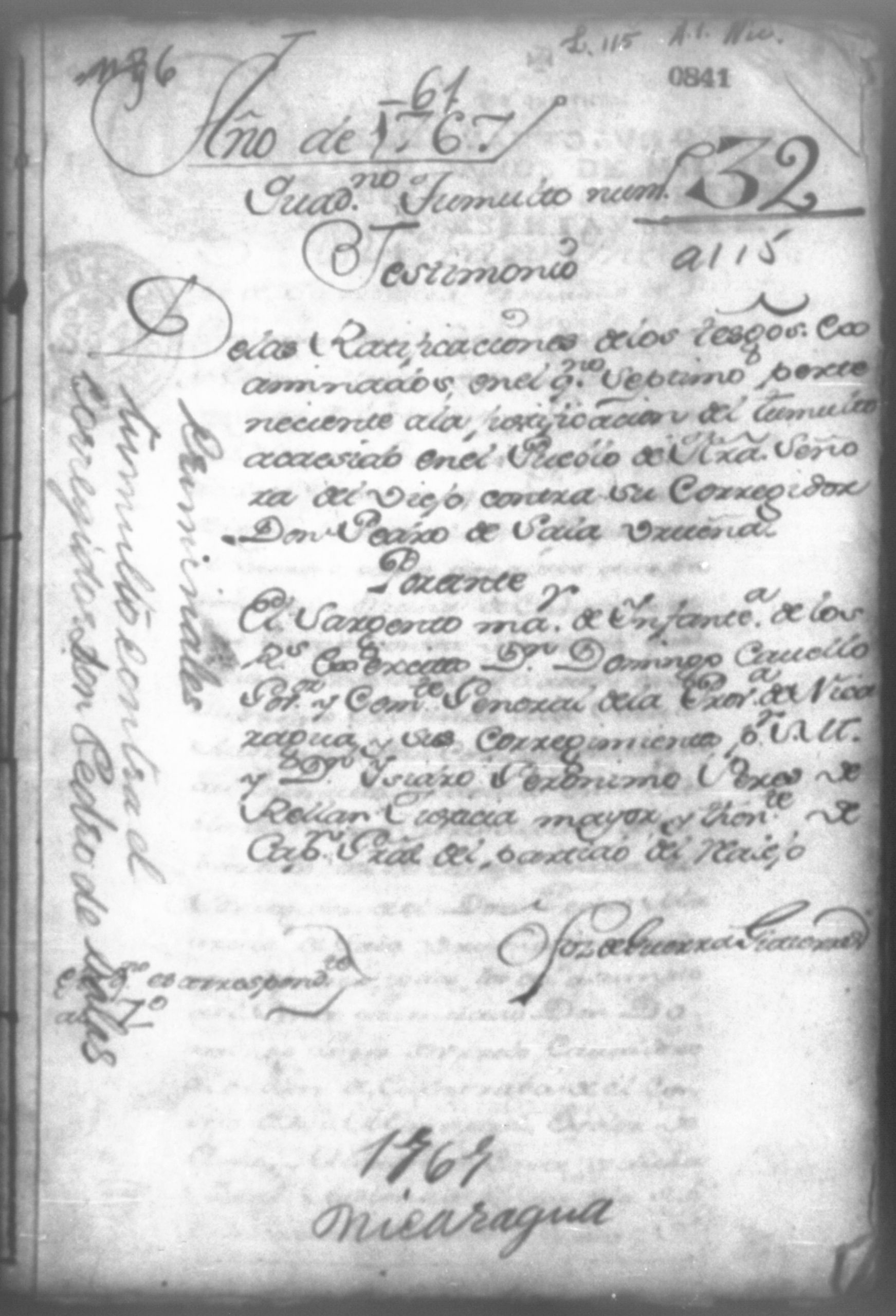 Temática: Tumulto contra el corregido Don Pedro de Sala. Año de 1767 Quaderno Tumulto Número 32. Testimonio de las ratificaciones de los testigos examinados en el 9no. septimo perteneciente a la pacificacion del tumulto acaecido en el pueblo de Nuestra Señora del Viejo contra su corregidor don Pedro de Sala. Por ante El sargento Mayor de Infanteria de los Reales Exercitos Don Domingo Cavello.