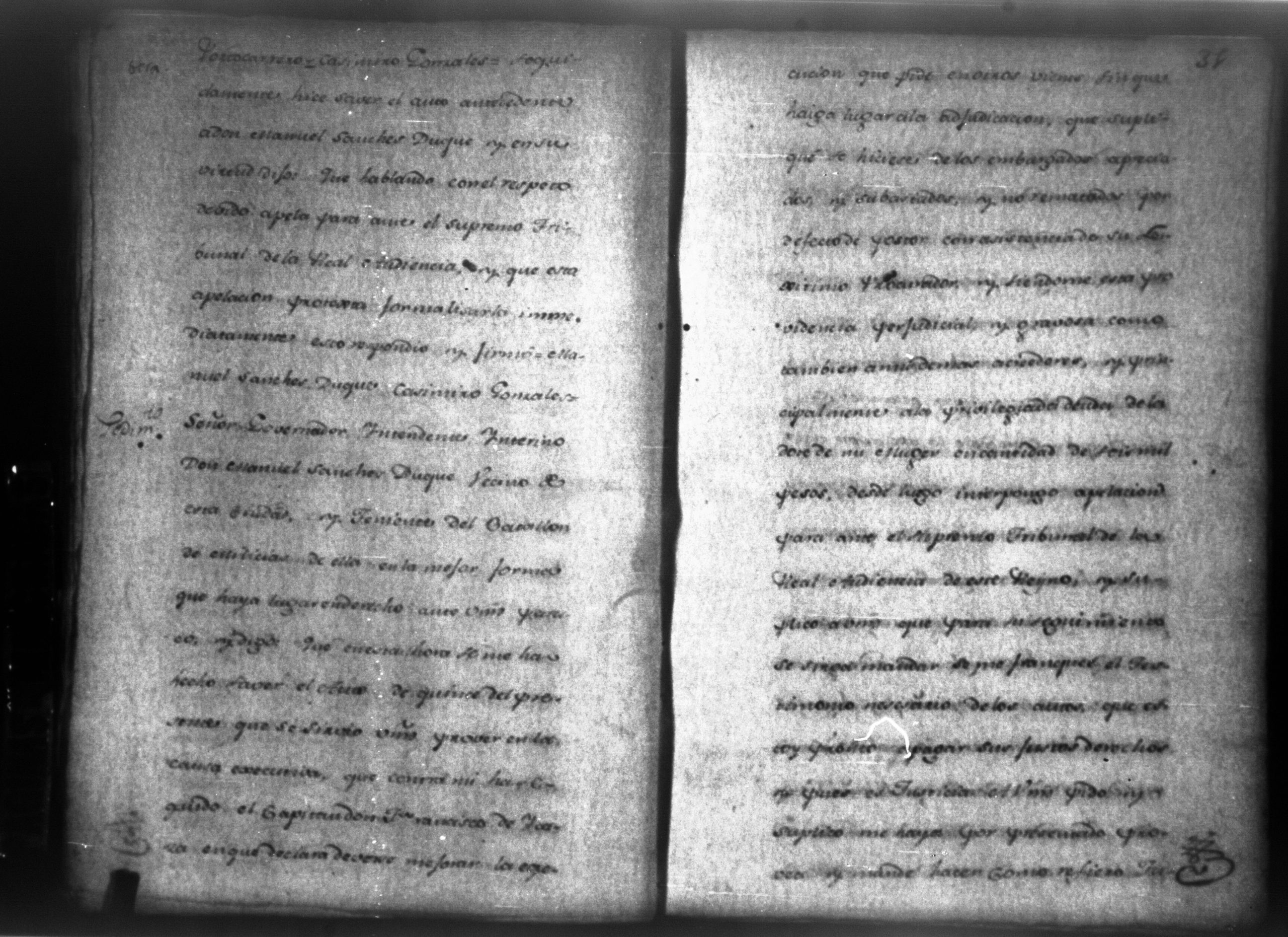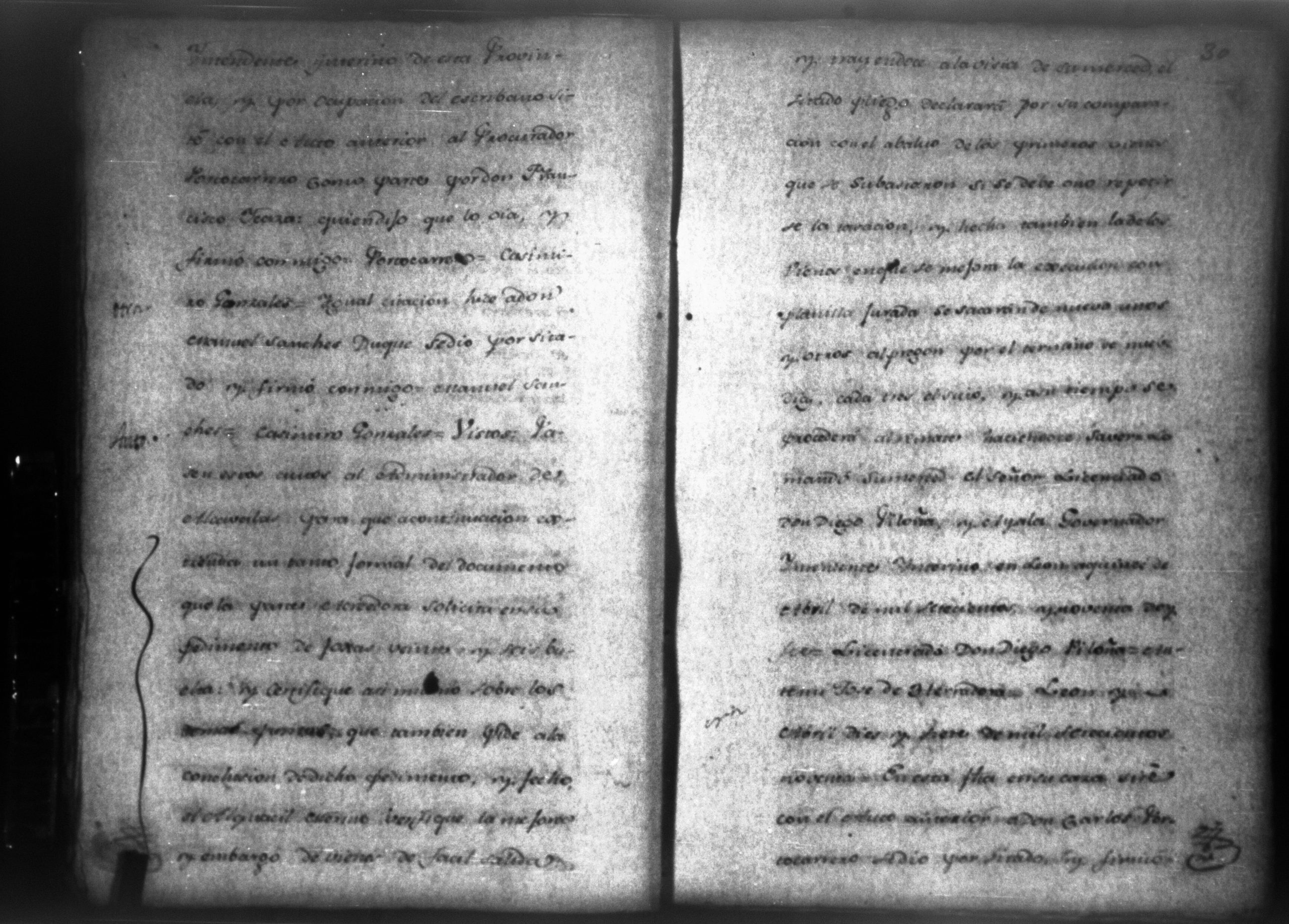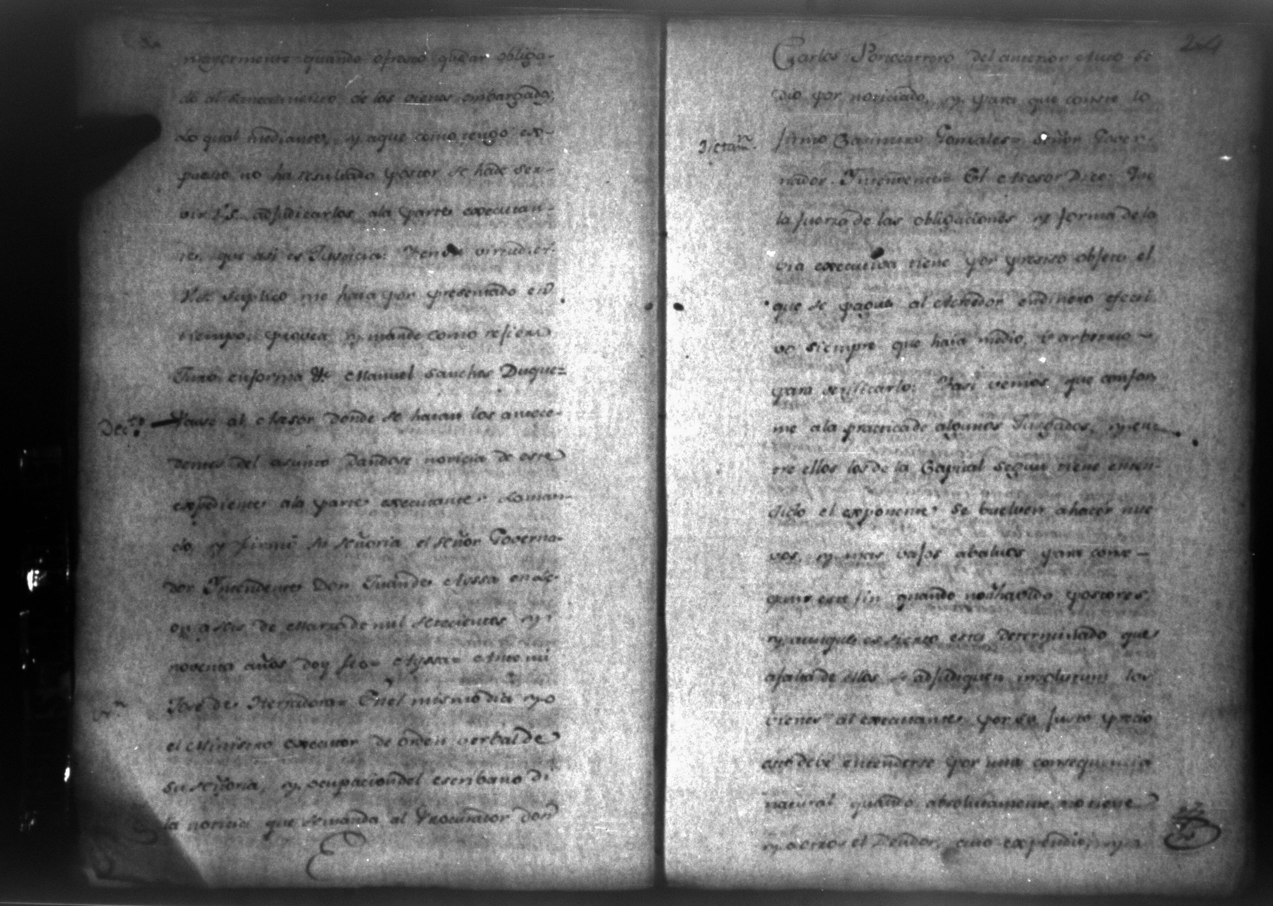 Temática: León, 1790. Testimonio de los autos de execucion seguidas por don Francisco Ycaza contra don Manuel Sanches por cantidad de pesos. " [...] Decreto de lo mandado. Pase de Herradora: Don Manuel Sanches Duque dentro de tercero dia, y pague la cantidad de dos mil pesos que se haya deviendo a don Francisco Ycaza [...]" Firma Carlos Portocarrerro, gobernador intendente de León. (Extracto folio 4, imagen 7).