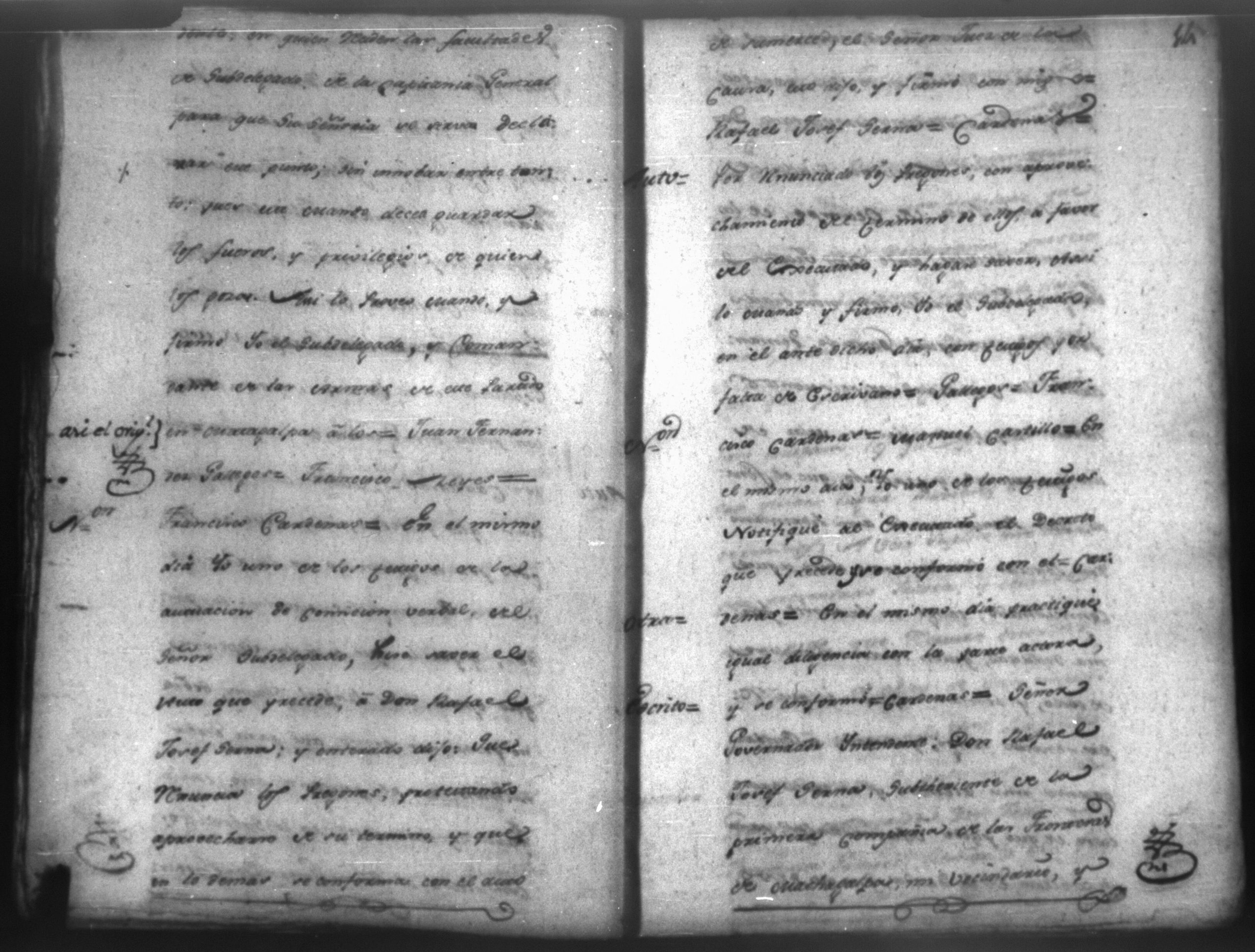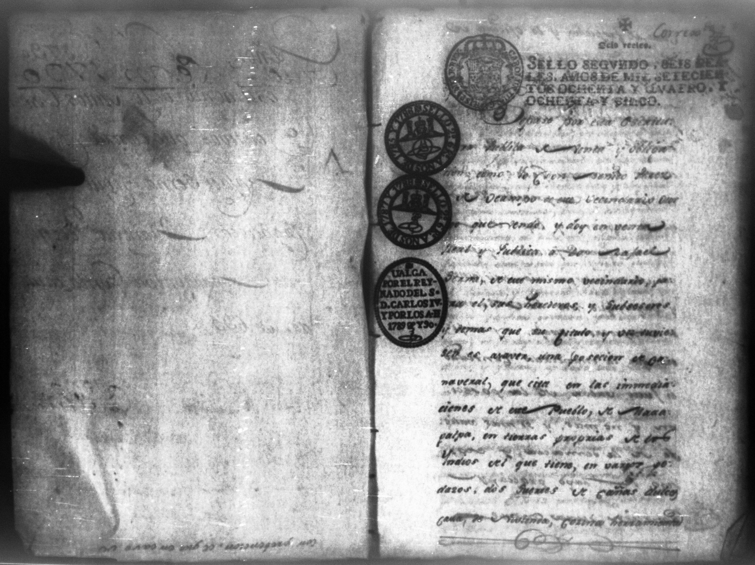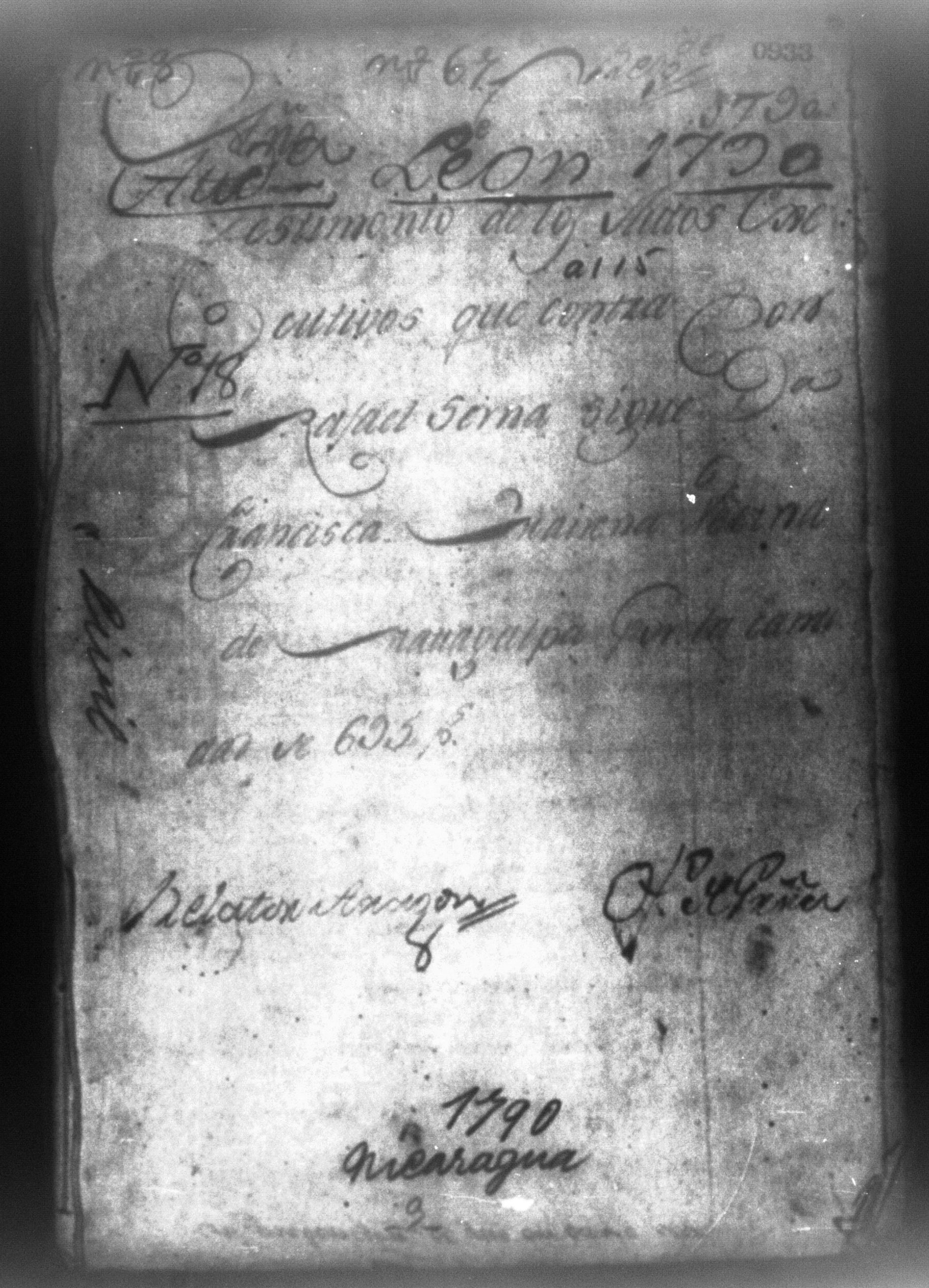 Temática: León, 1790. Testimonio de los autos executivos que contra don Rafael Serna sigue doña Francisca Mairena vecina de Matagualpa por la cantidad de 695 pesos. " [...] Don Rafael Josef Serna, dentro de tercero día, dé y pague los seiscientos noventa y cinco pesos de la cobrante, y las costas hasta el Real, yefectivo pago, vajo apercevimiento de execucion [...]." Firma Juan Fernández, juez subdelegado de intendencia de Masagua.