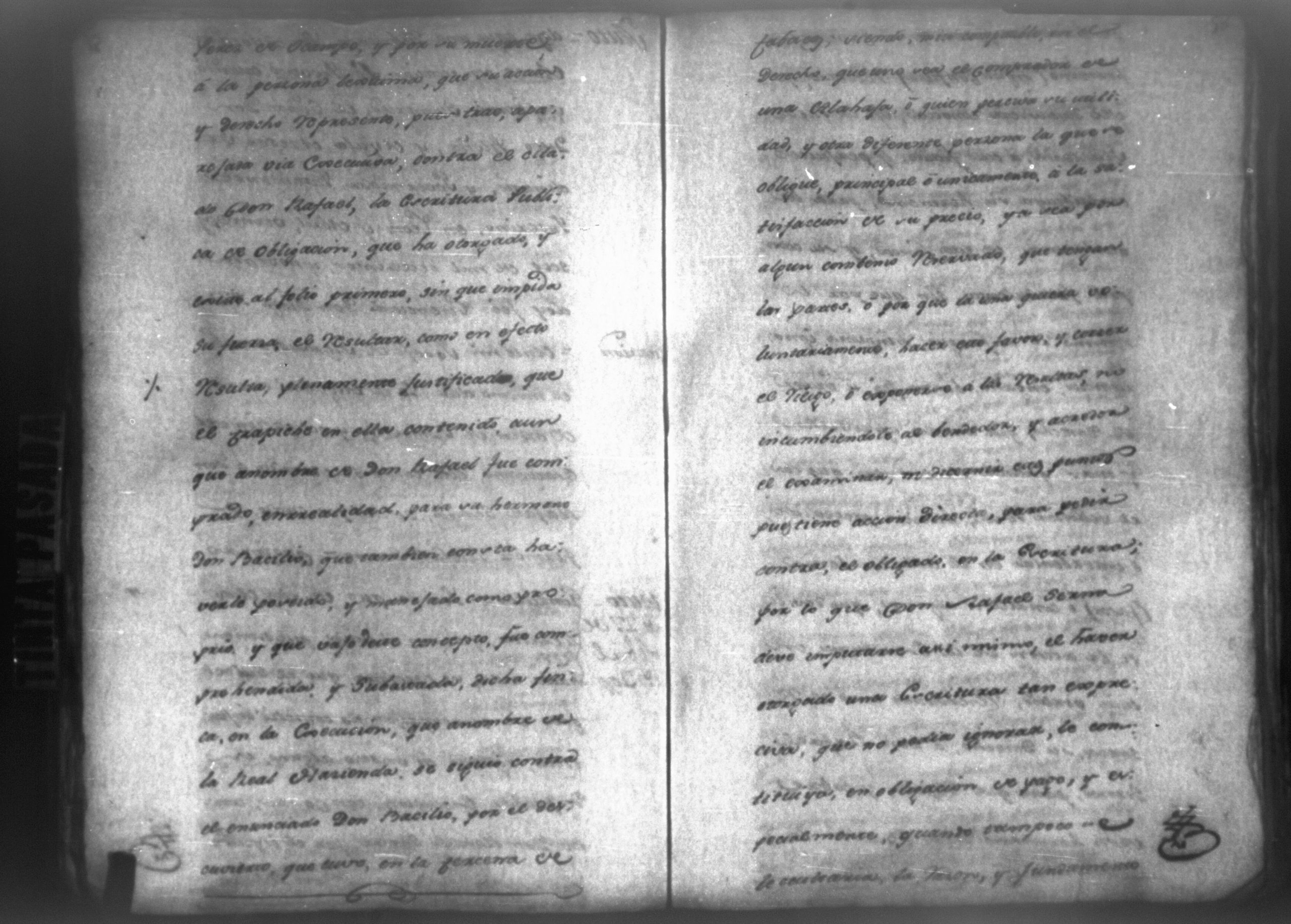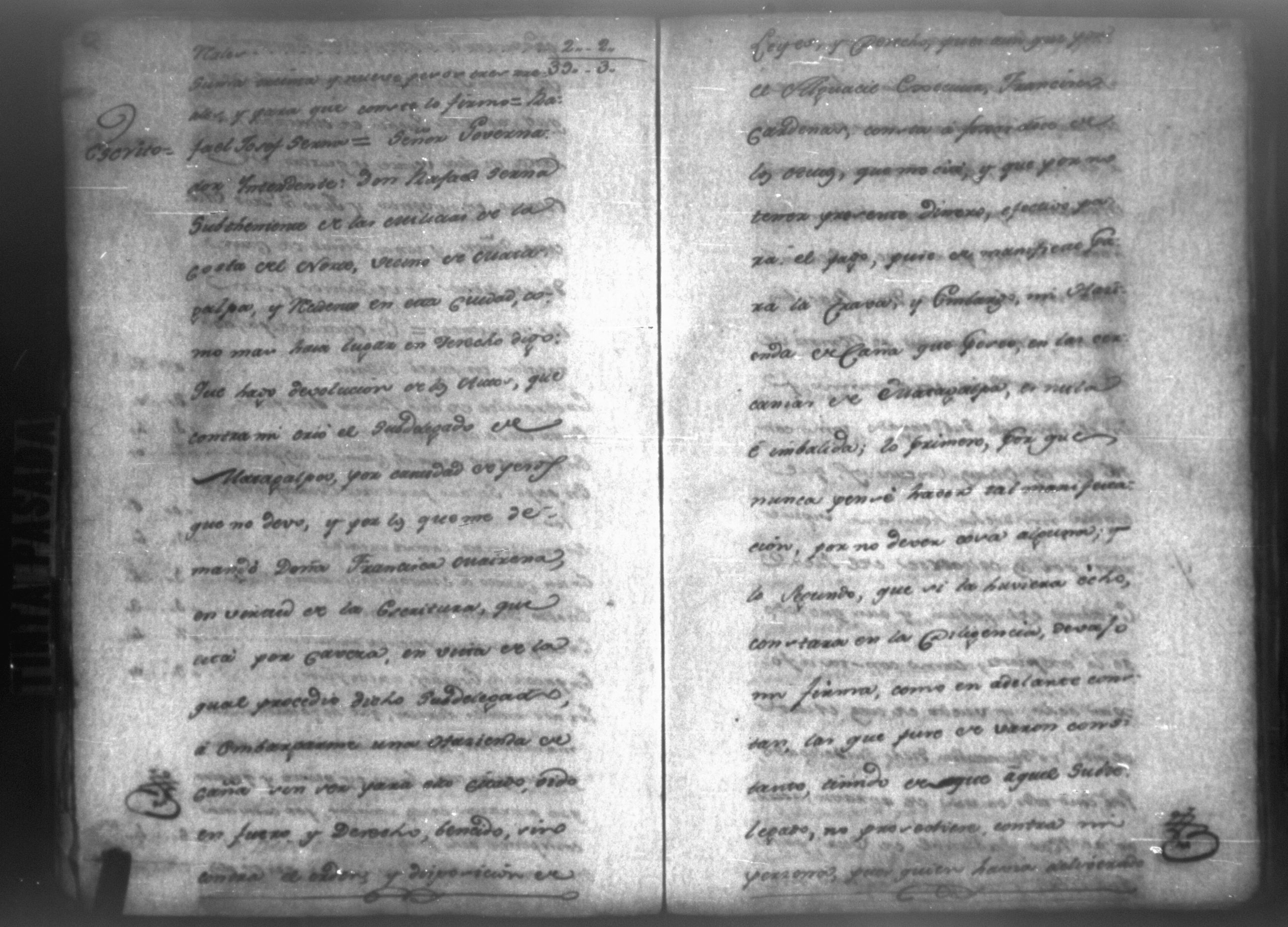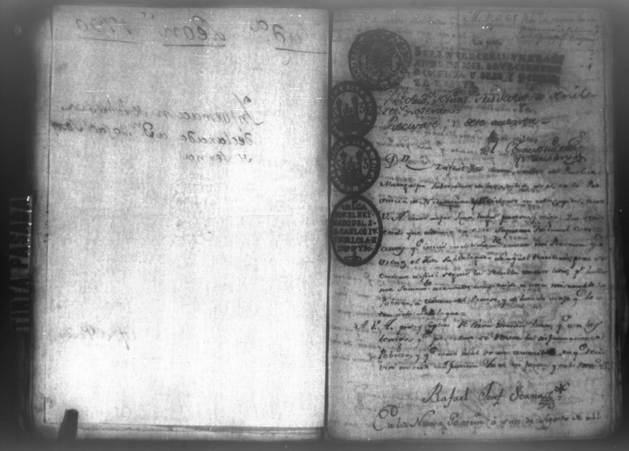 Temática: León, 1790. Testimonio de los autos executivos que contra don Rafael Serna sigue doña Francisca Mairena vecina de Matagualpa por la cantidad de 695 pesos. " [...] Don Rafael Josef Serna, dentro de tercero día, dé y pague los seiscientos noventa y cinco pesos de la cobrante, y las costas hasta el Real, yefectivo pago, vajo apercevimiento de execucion [...]." Firma Juan Fernández, juez subdelegado de intendencia de Masagua.