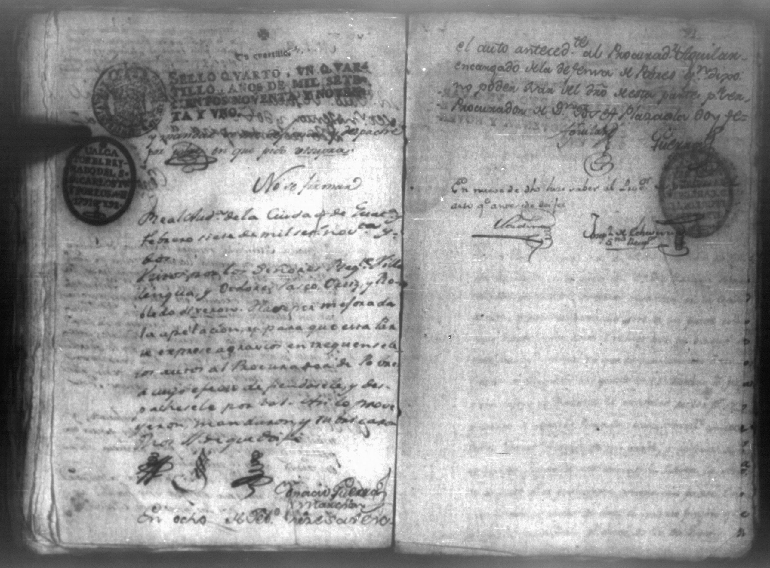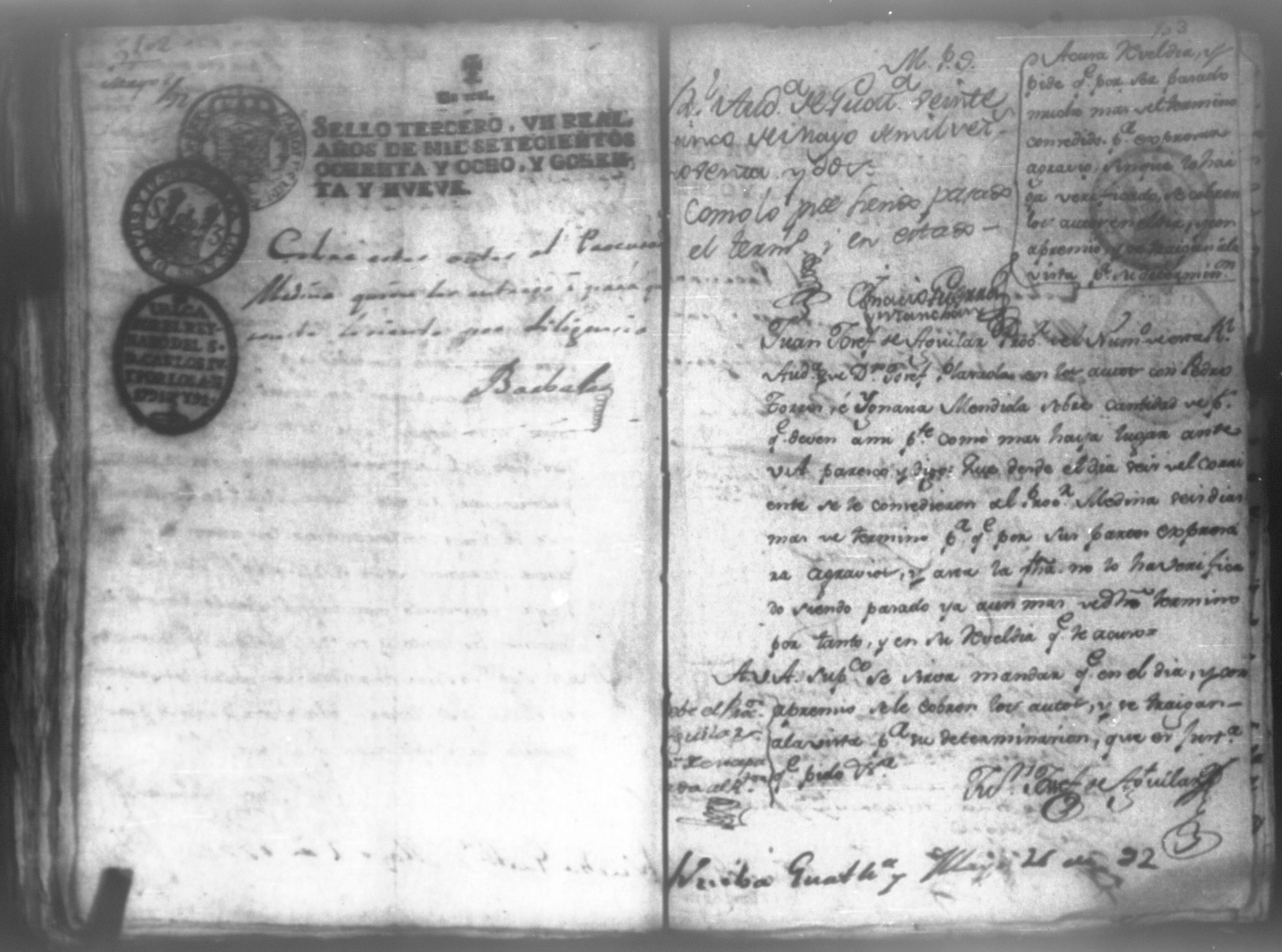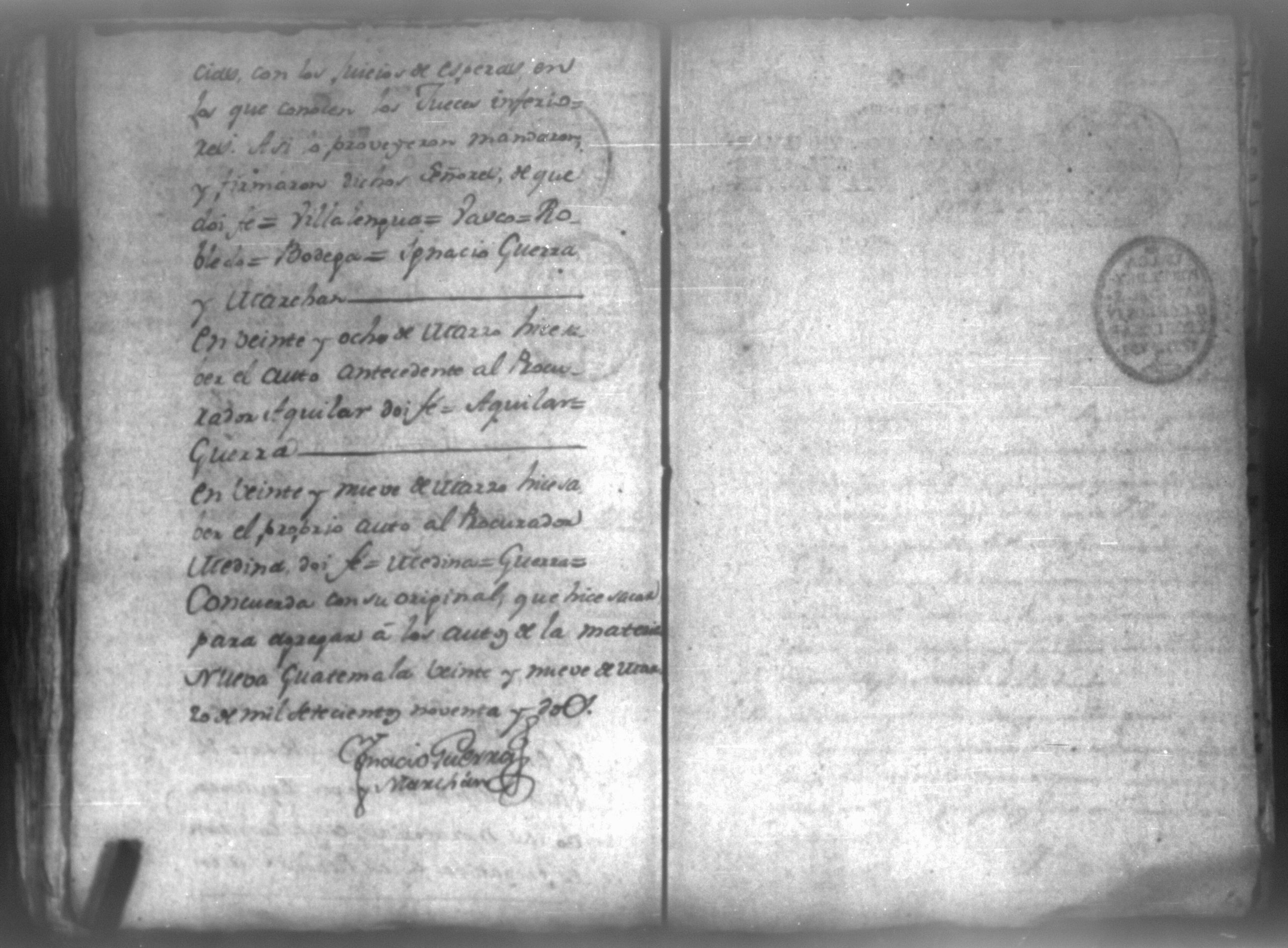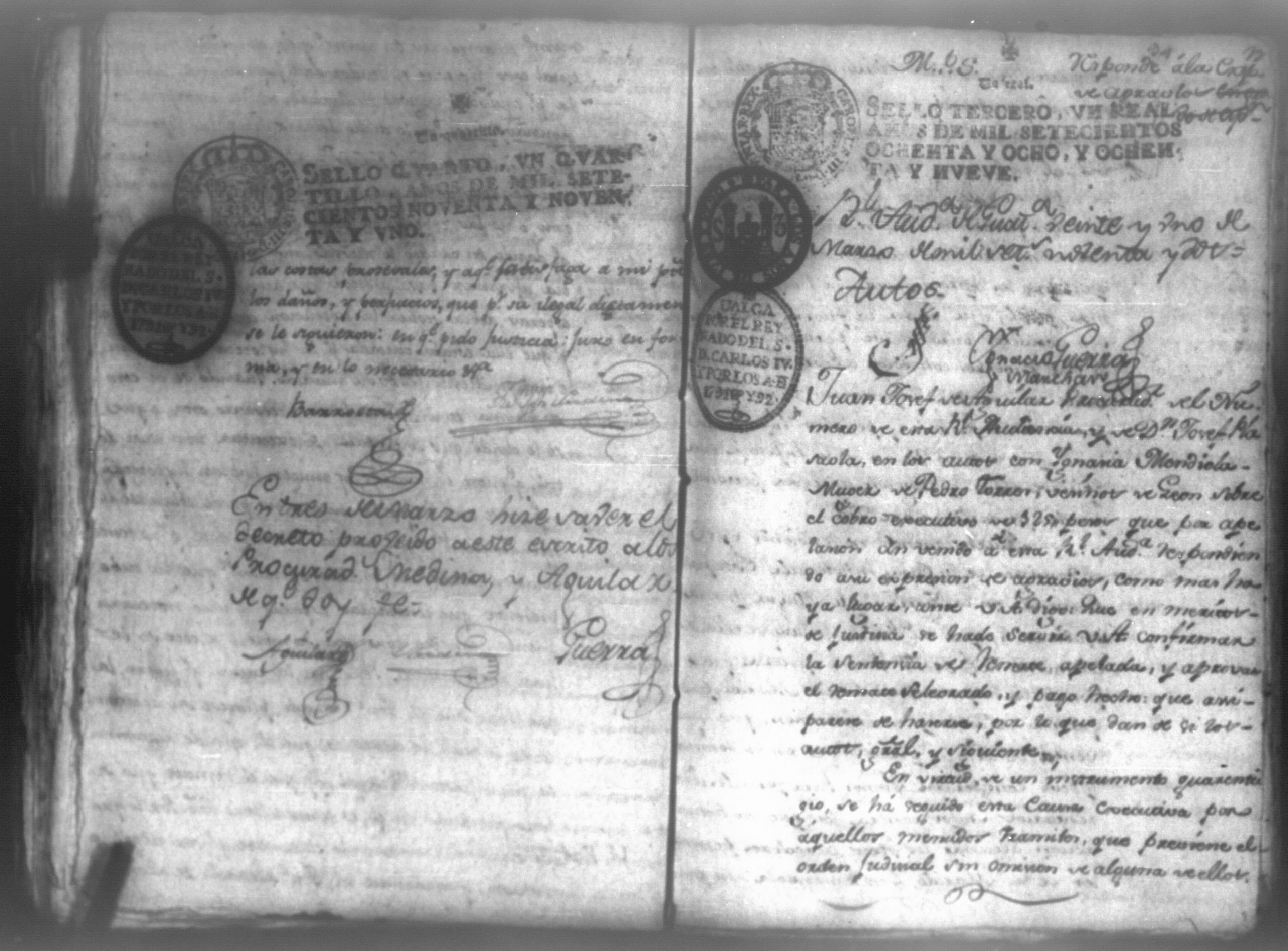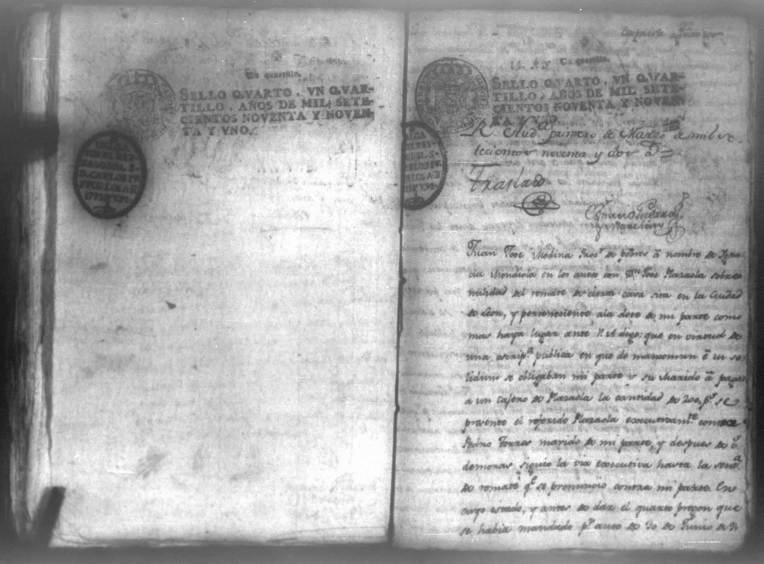Temática: León, 1792. Testimonio integro de los autos de demanda puesta por parte de don Josef Plazaola contra Pedro Torres e Ygnacia Mendiola, su mujer. Cantidad de 125 pesos. "Real Audiencia primero de Marzo de mil setecientos noventa y dos años. Traslado. Ignacio Guerra Manchán [firma] Juan Jose Medina Procurador de pobres á nombre de Ygnacia Mendiola en los autos con Don Jose Plazaola sobre nulidad del remate de cierta causa sita en la Ciudad de Leon, y perteneciente a la (dote) de mi parte como mas haya lugar ante Vuestra Alteza digo: que en virtud de una escriptura publica en que de mancomun é in solidum se obligaban mi parte y su marido á pagar a un cajero de Plazaola la cantidad de 200 pesos se presento el referido Plazaola con executivamente consta Pedro Torres marido de mi parte [...]" (Extracto del folio 92, imagen 97).
