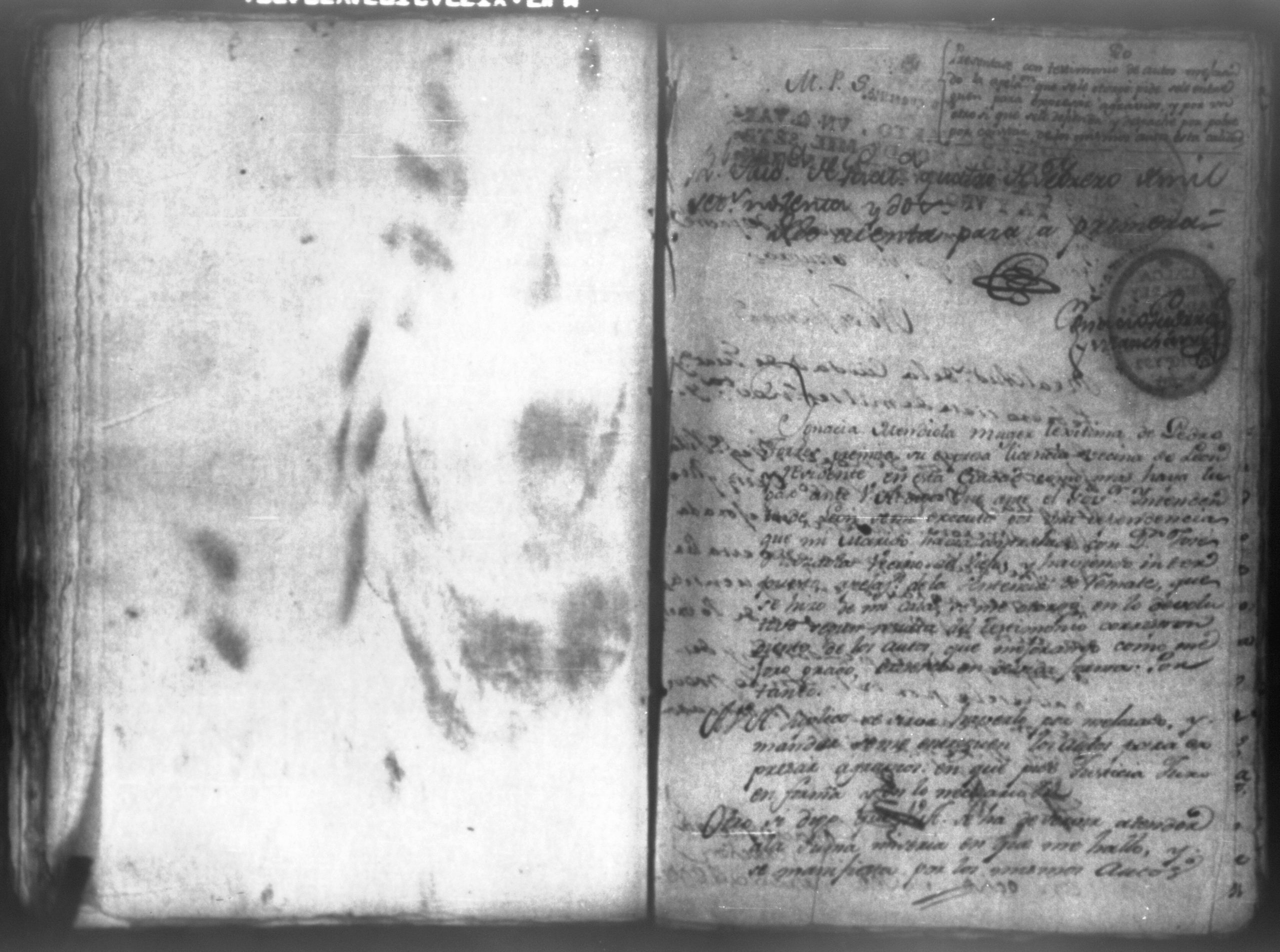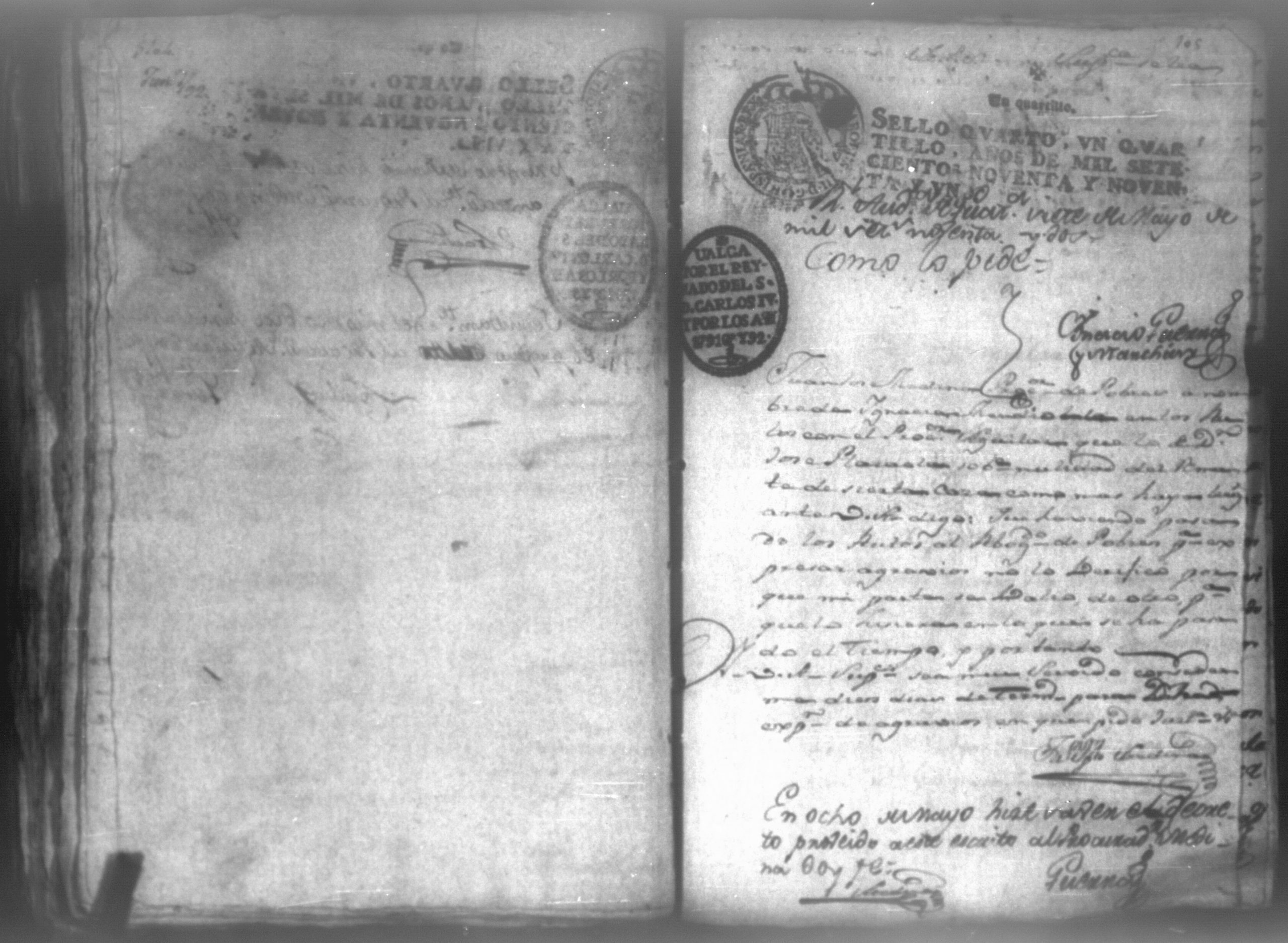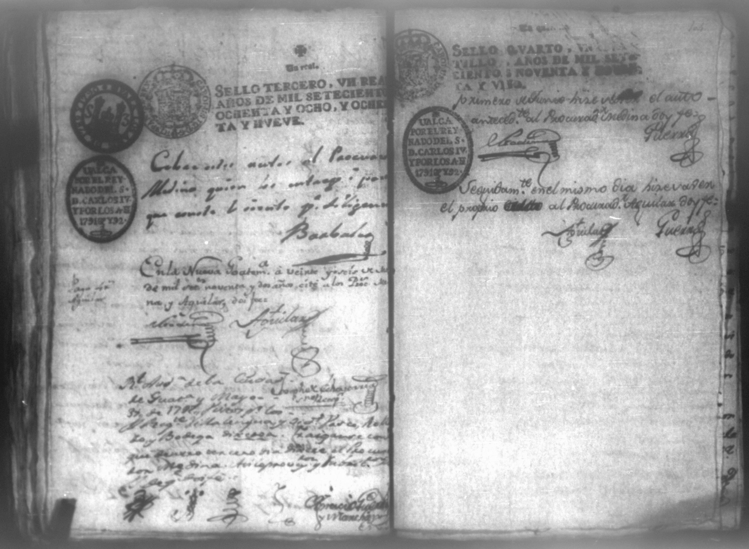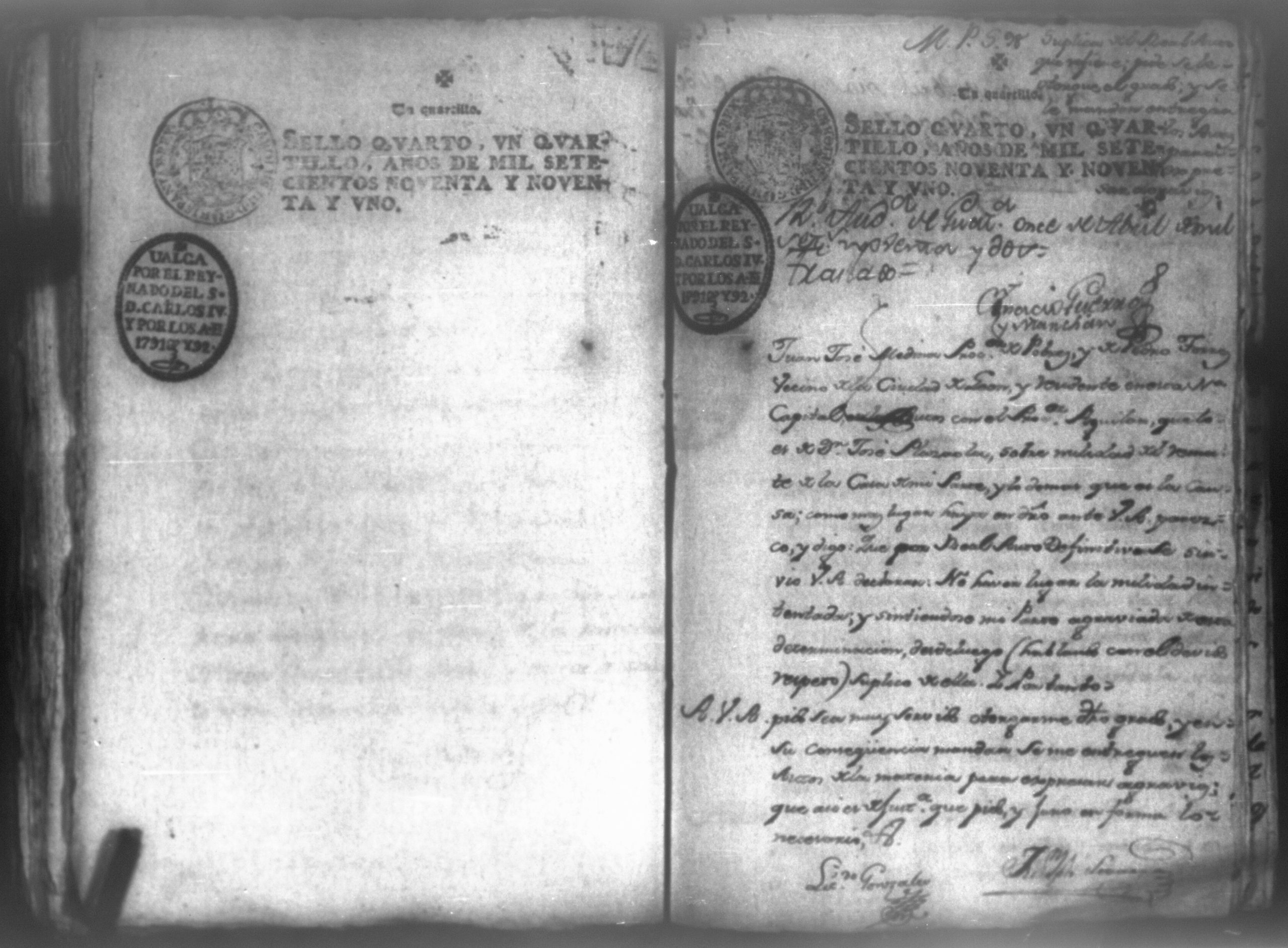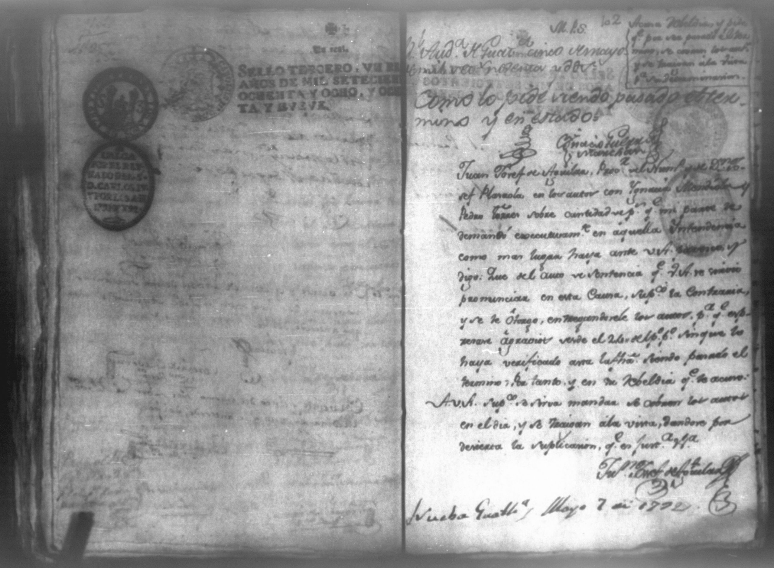 Temática: León, 1792. Testimonio integro de los autos de demanda puesta por parte de don Josef Plazaola contra Pedro Torres e Ygnacia Mendiola, su mujer. Cantidad de 125 pesos. "Real Audiencia primero de Marzo de mil setecientos noventa y dos años. Traslado. Ignacio Guerra Manchán [firma] Juan Jose Medina Procurador de pobres á nombre de Ygnacia Mendiola en los autos con Don Jose Plazaola sobre nulidad del remate de cierta causa sita en la Ciudad de Leon, y perteneciente a la (dote) de mi parte como mas haya lugar ante Vuestra Alteza digo: que en virtud de una escriptura publica en que de mancomun é in solidum se obligaban mi parte y su marido á pagar a un cajero de Plazaola la cantidad de 200 pesos se presento el referido Plazaola con executivamente consta Pedro Torres marido de mi parte [...]" (Extracto del folio 92, imagen 97).