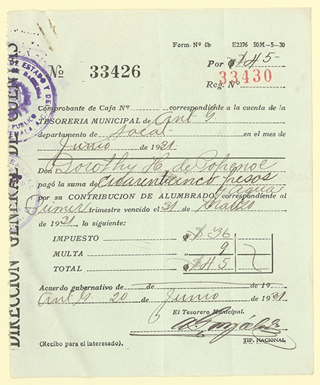 Recibo, Antigua 20 de Junio 1931 Dorothy H de Popenoe pagó la suma de cuarenticinco pesos por su CONTRIBUCION DE ALUMBRADO, correspondiente al Primer trimestre vencido el 31 de marzo de 1931, lo siguiente: