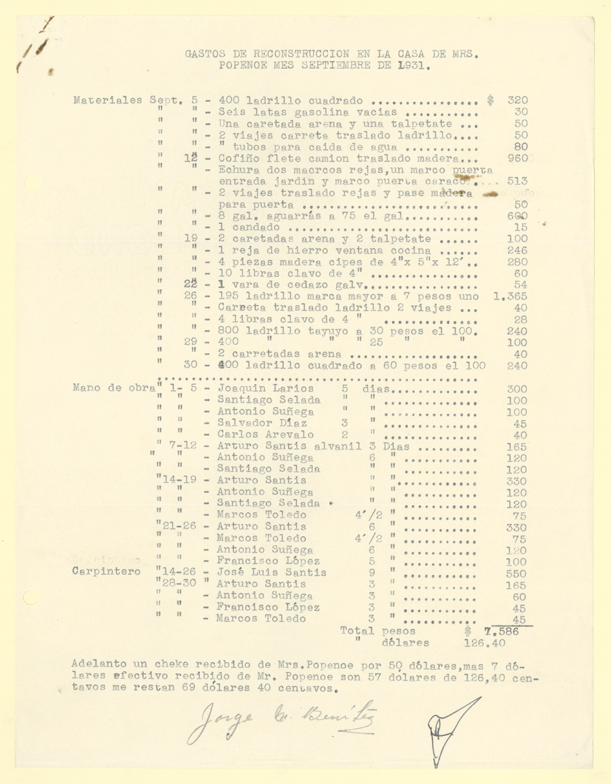GASTOS DE RECONSTRUCCION EN LA CASA DE MRS. POPENOE