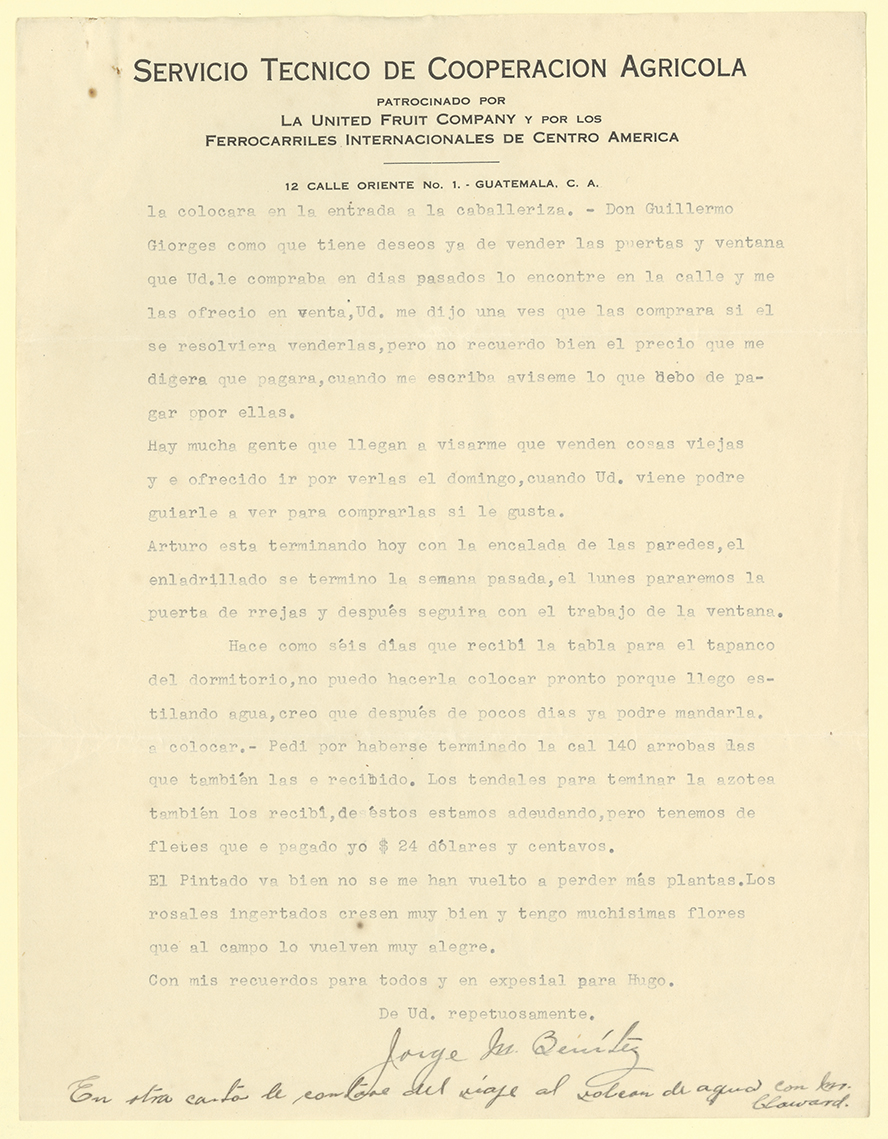 Carta, Antigua 8 de Octubre 1932 SERVICIO TECNICO DE COOPERACIÓN AGRICOLA PATROCINADO POR LA UNITED FRUIT COMPANY Y POR LOS FERROCARRILES INTERNACIONALES DE CENTROAMERICA 12 CALLE ORIENTE No. 1 GUATEMALA, C. A. Puerta, entrada a la caballeriza. Don Guillermo Giorges Paredes encaladas, enladrillado, tapanco. Puerta de rejas, ventana.   Jorge M. Benitez En otra carta le contare del viaje al volcan de agua